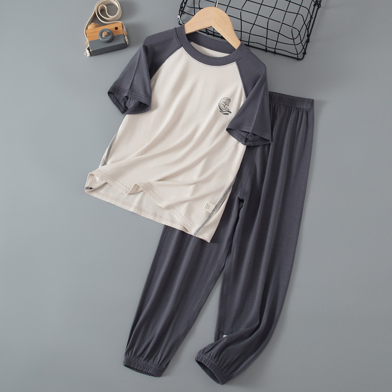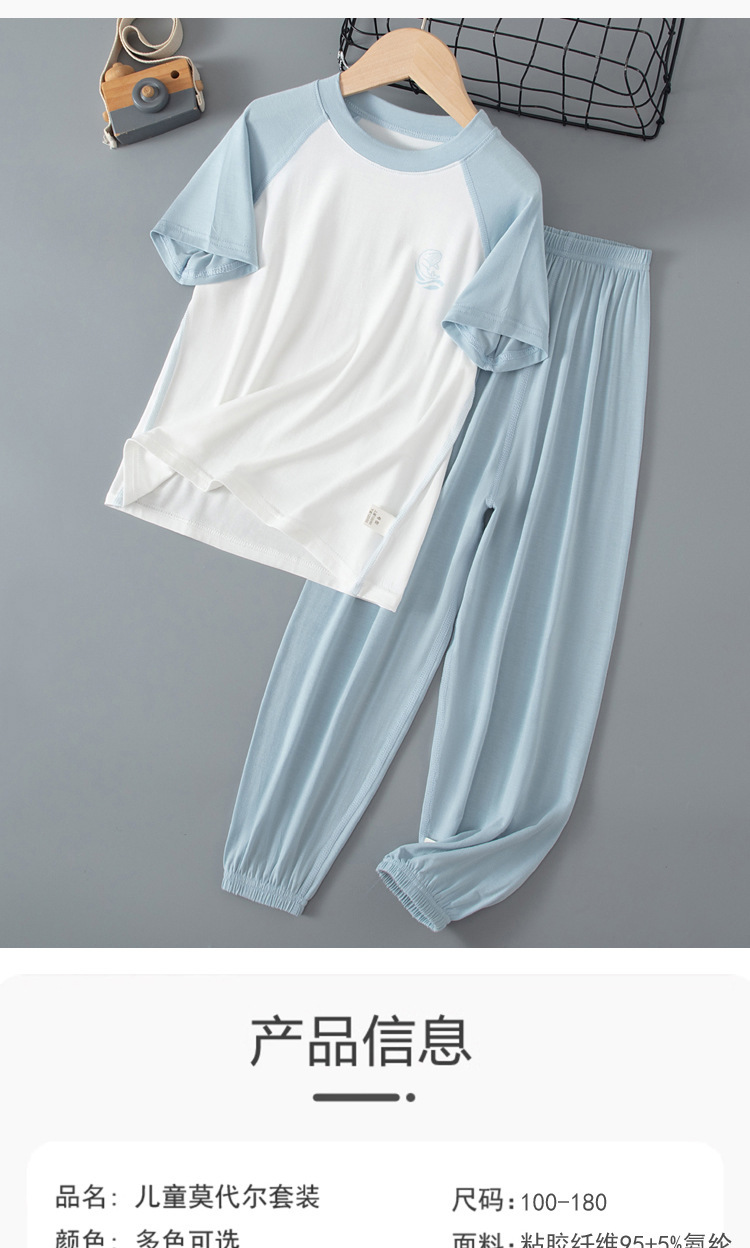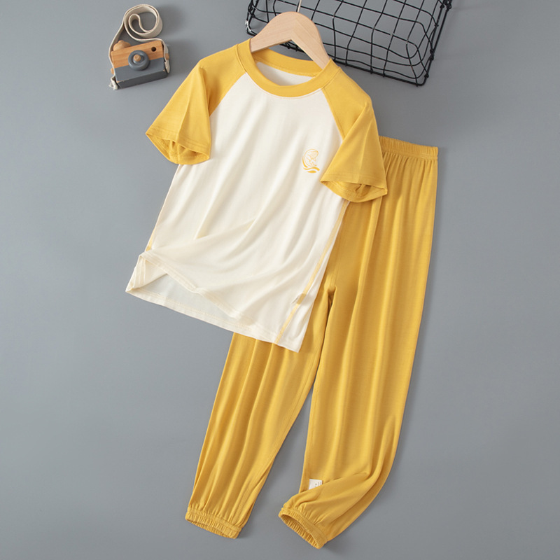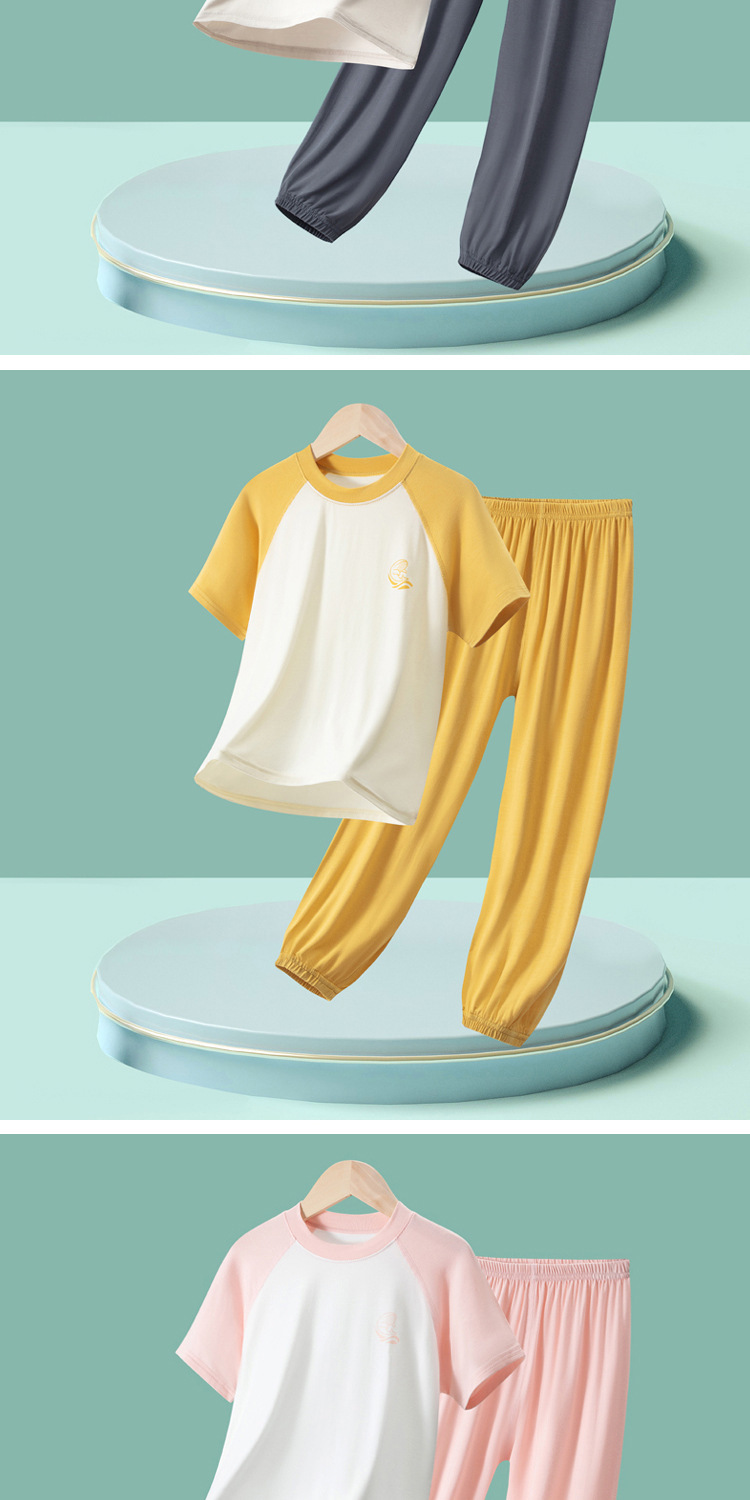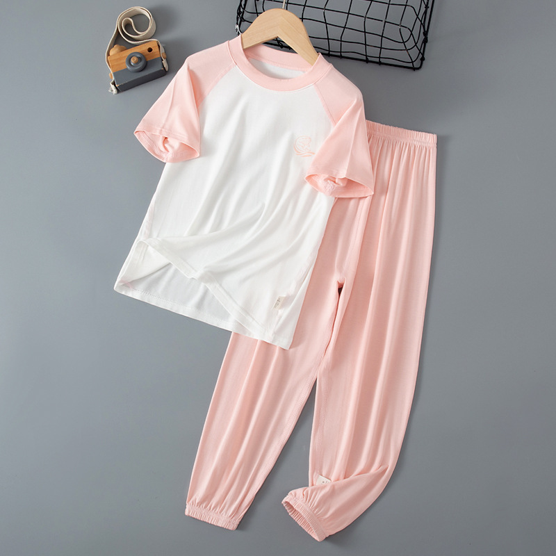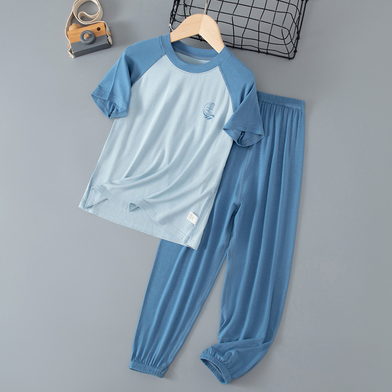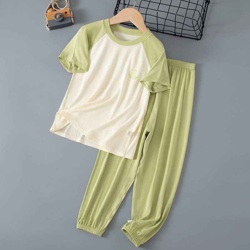 夏季儿童糖果色拼接袖睡衣两件套中大男童女童短袖长裤空调家居服