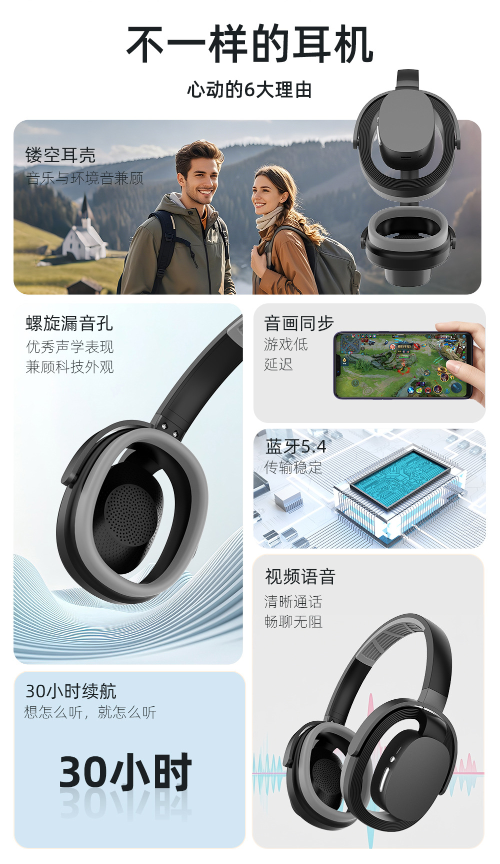 30시간 배터리 수명, 고속 충전, 개방형 중공 디자인을 갖춘 국경 간 스포츠 통기성 블루투스 헤드셋