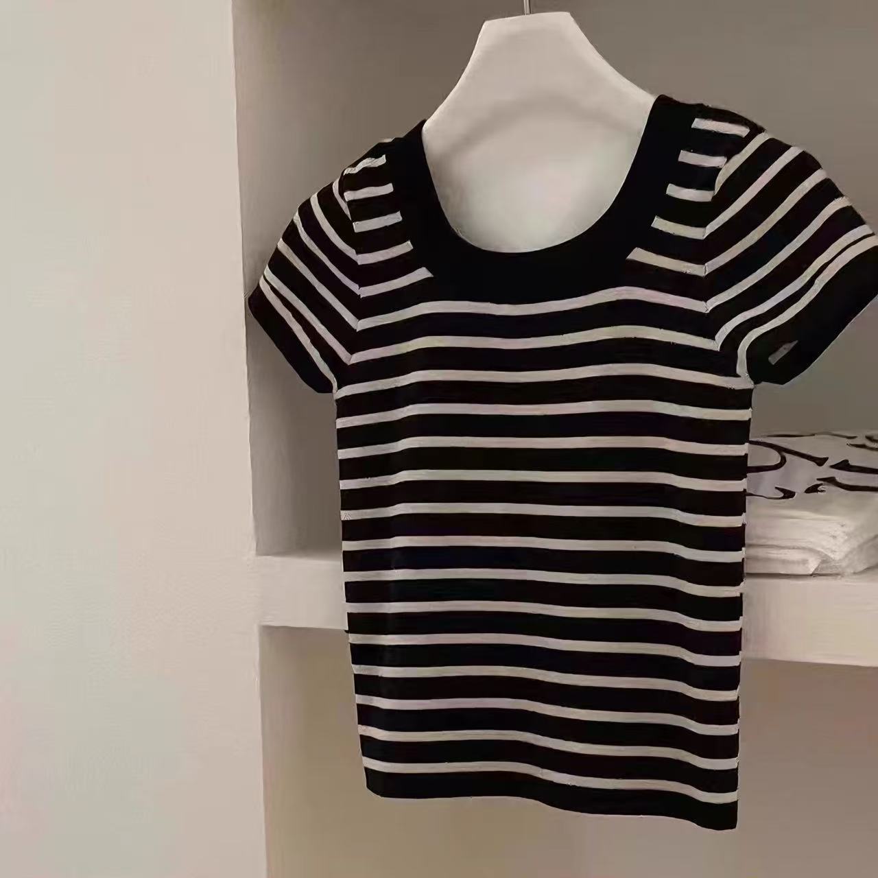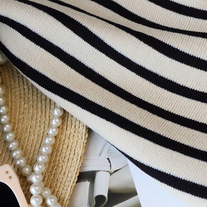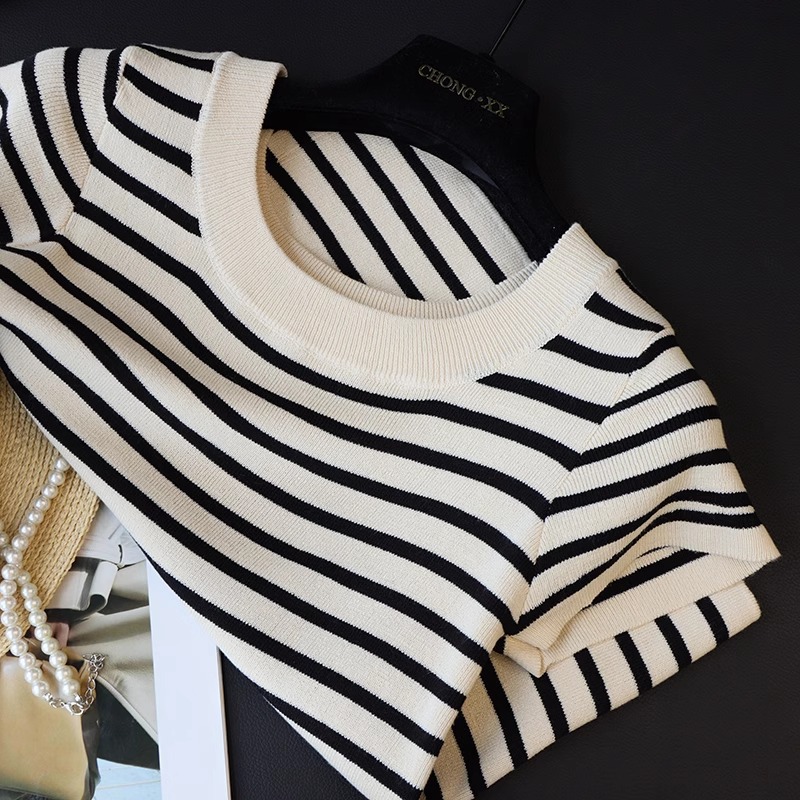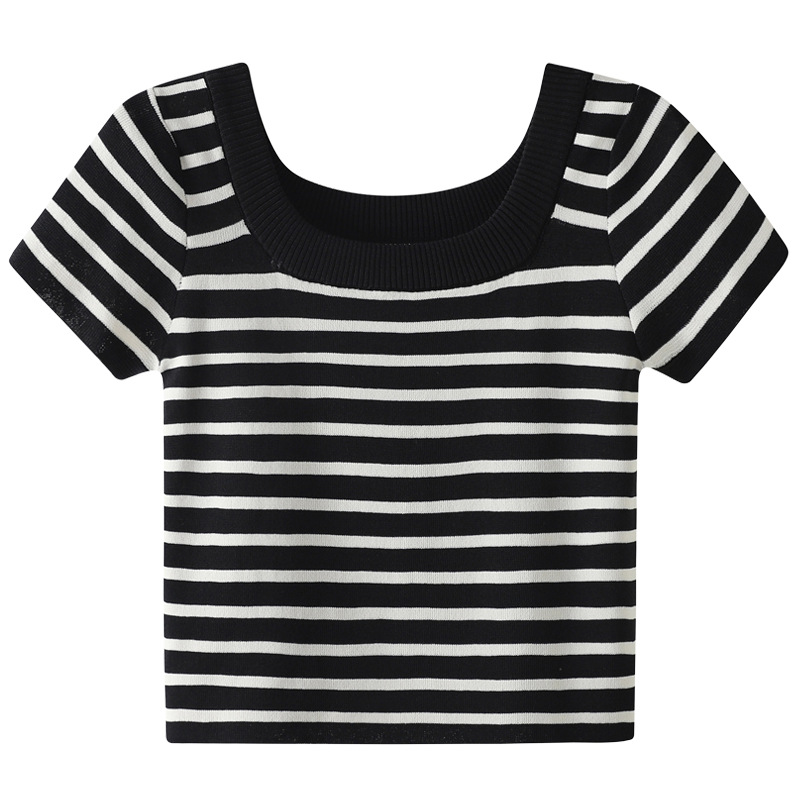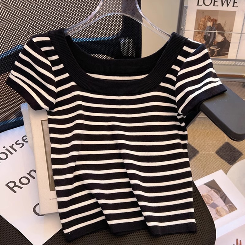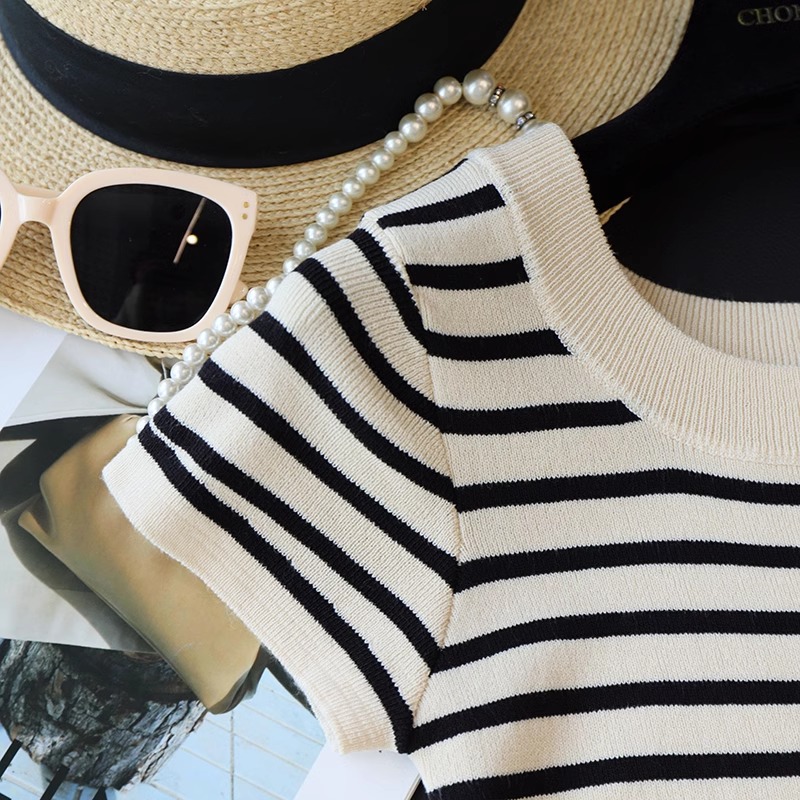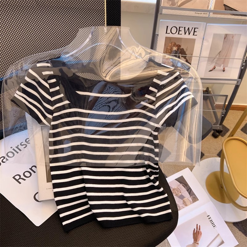흑백 줄무늬 어깨 반팔 티셔츠 여성용 여름 얇은 프랑스 하이 엔드 니트 셔츠 작은 탑 여성 의류스토어 가기