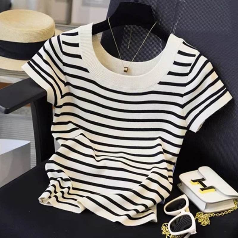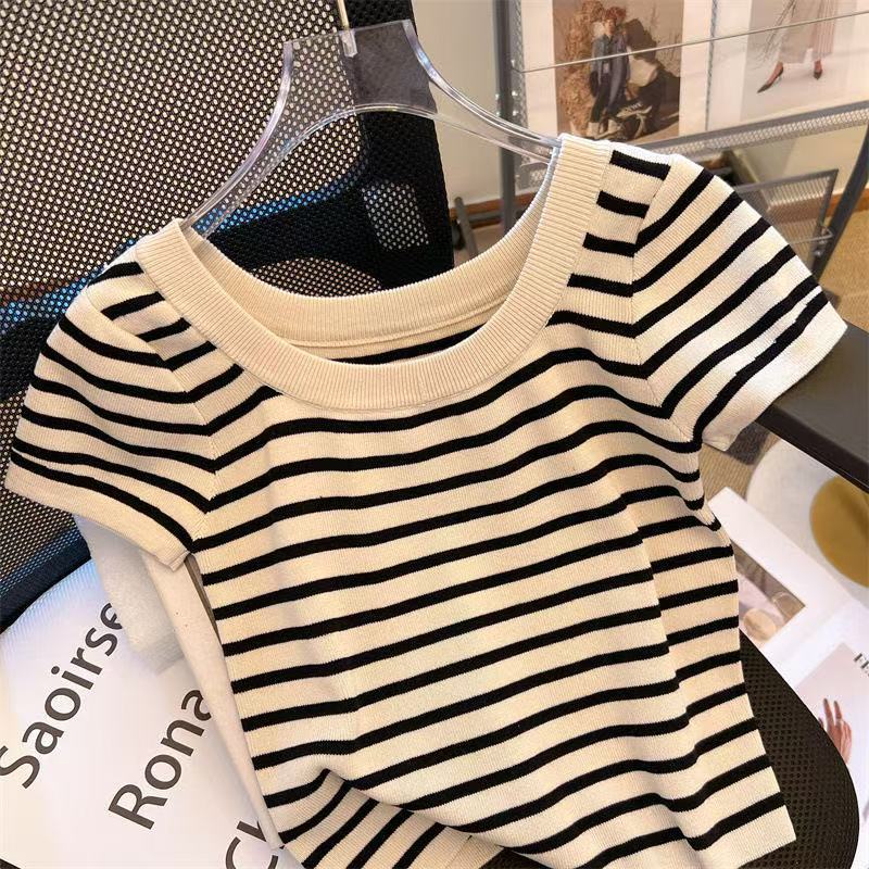 흑백 줄무늬 어깨 반팔 티셔츠 여성용 여름 얇은 프랑스 하이 엔드 니트 셔츠 작은 탑 여성 의류