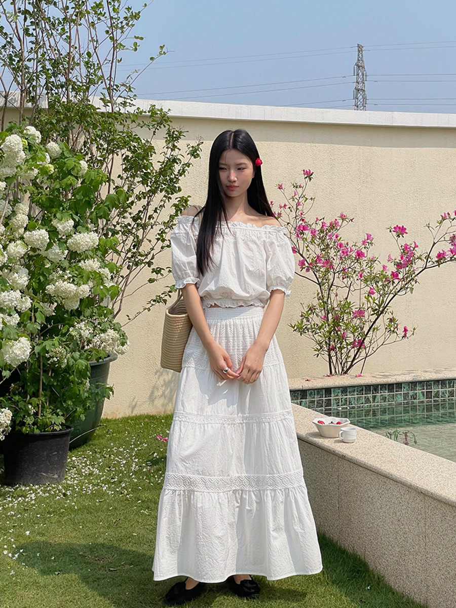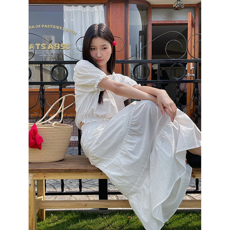 [루스 같은 스타일] 송밍 프렌치 레트로 숄더 할로우 셔츠 여자 레이스 스커트 세트 N019C