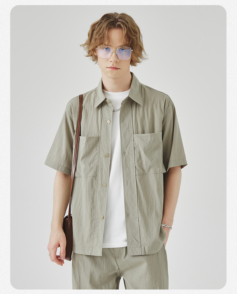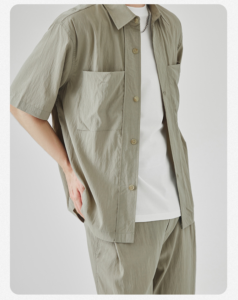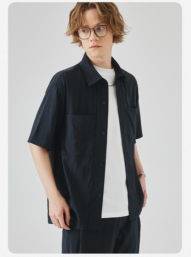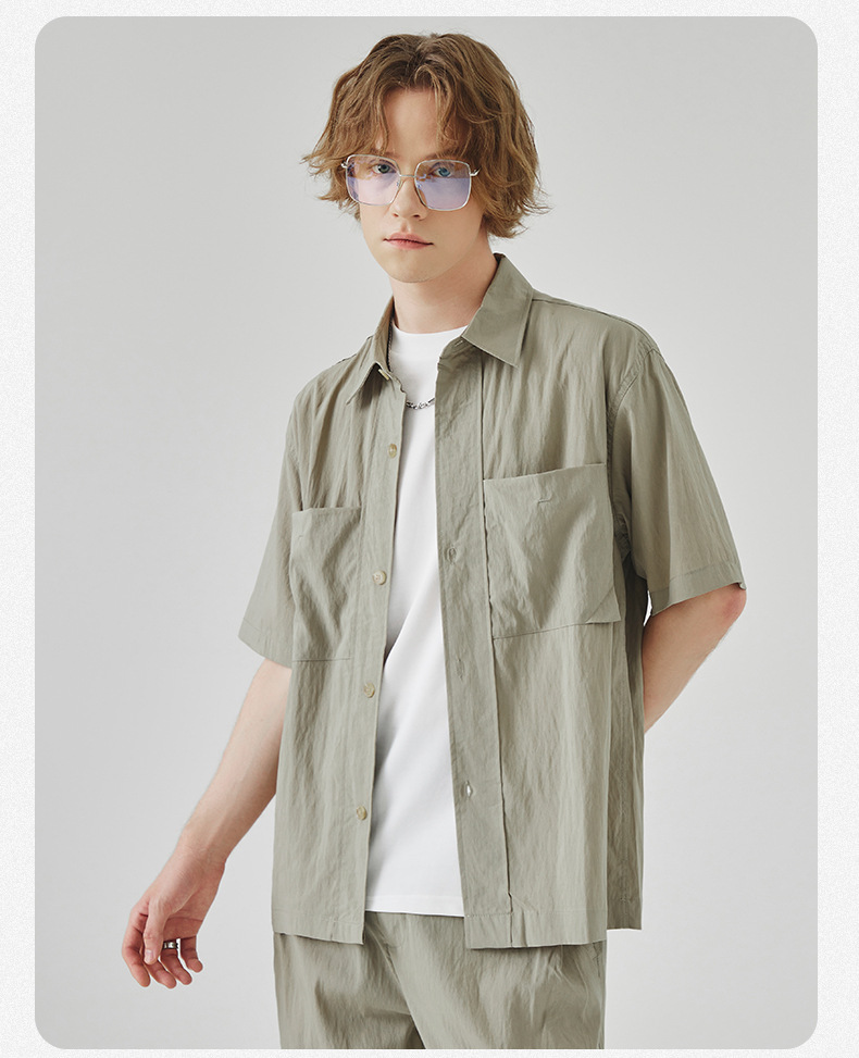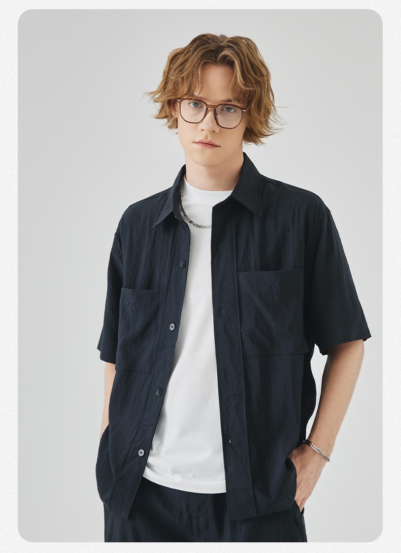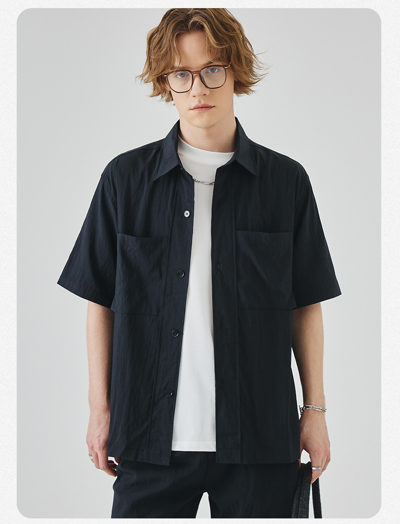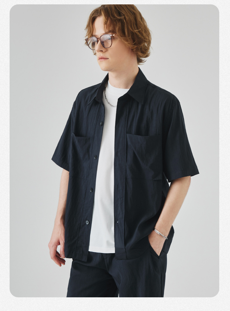 APO 남성복 | Lyocell Draping 반팔 셔츠 남성용 여름 하이 엔드 느낌 푸른 느슨한 캐주얼 옷깃 셔츠