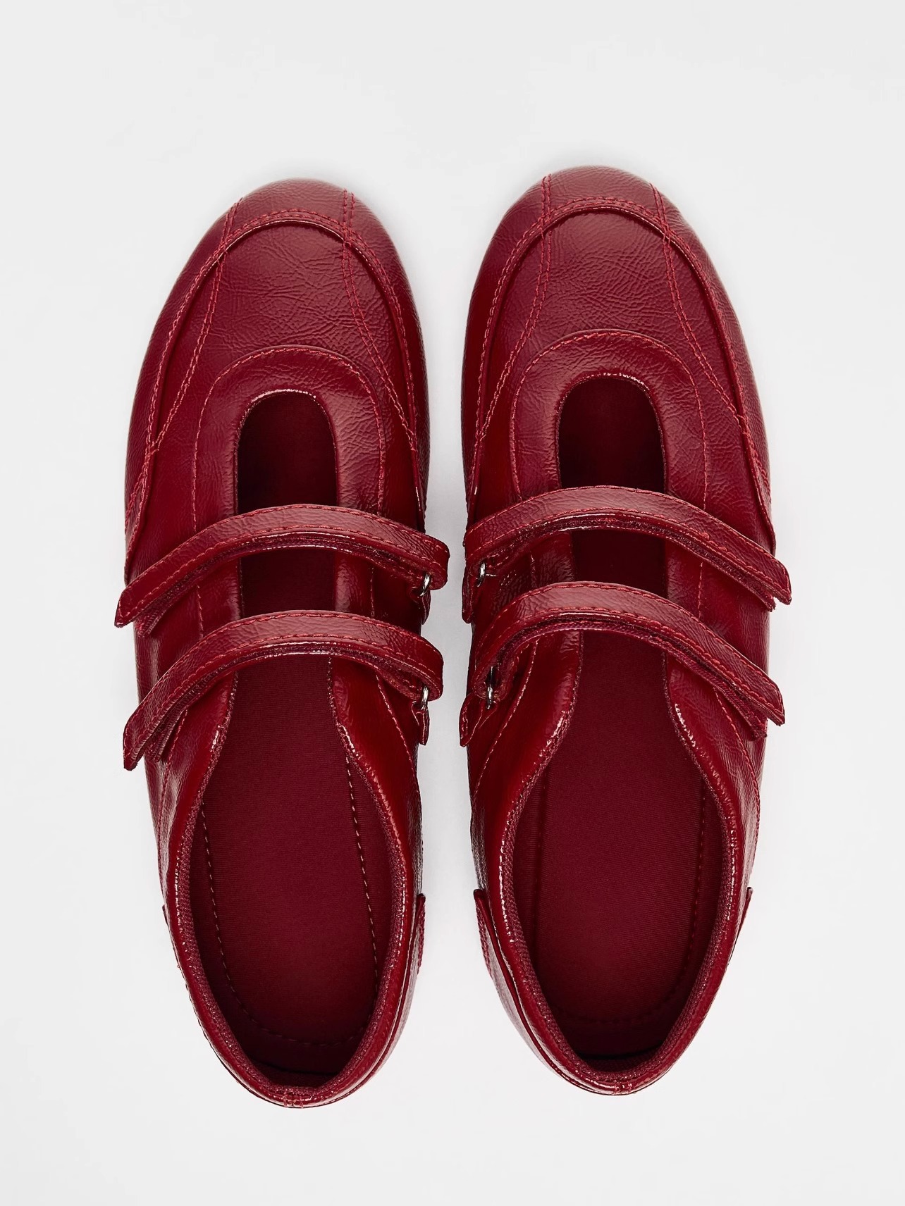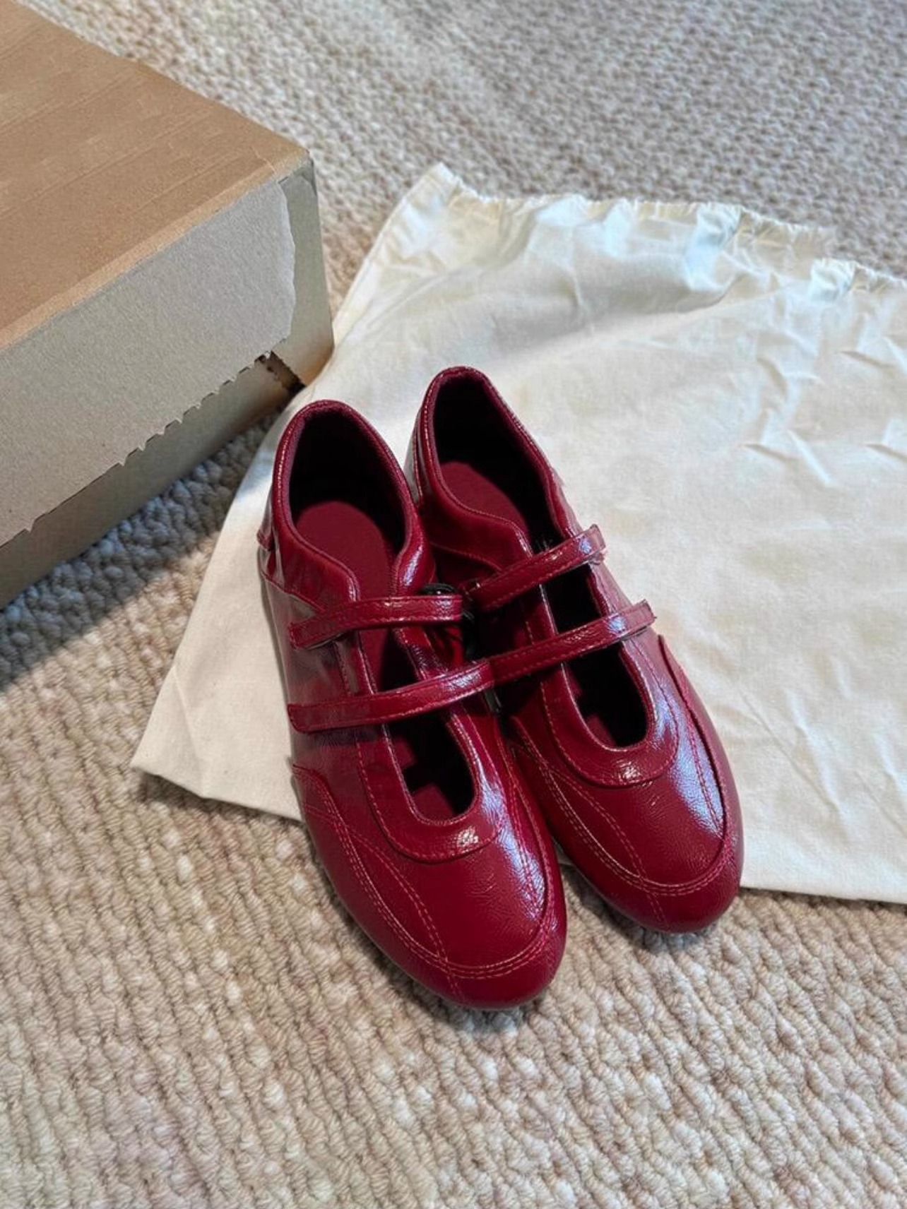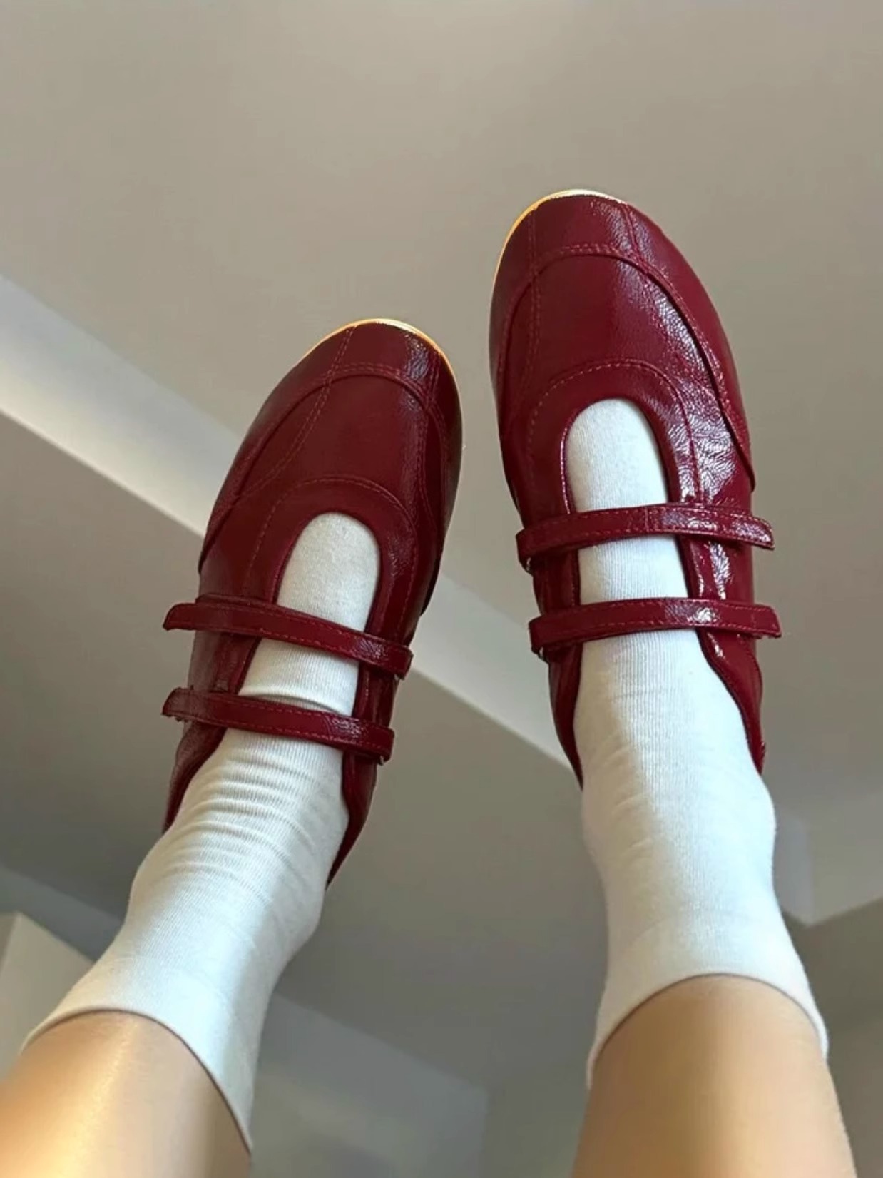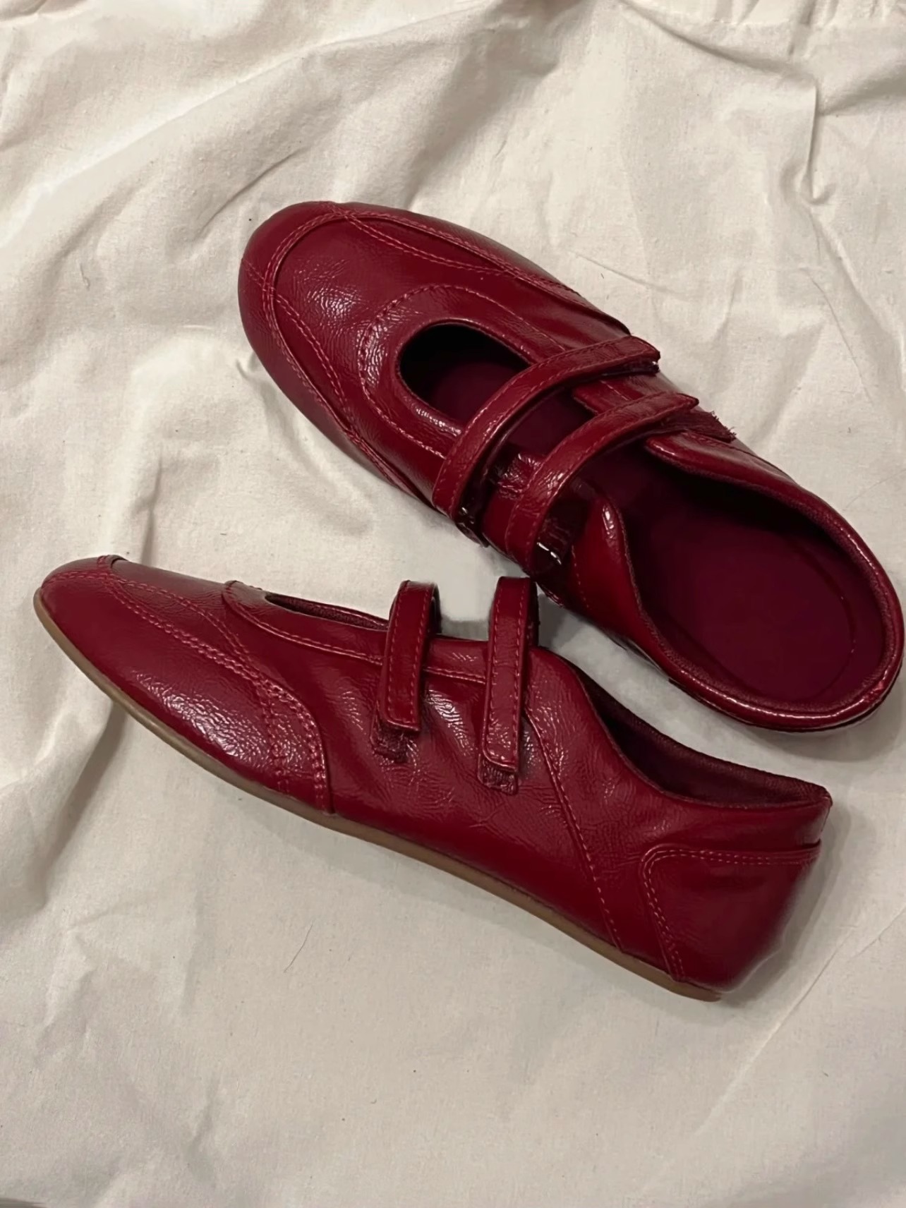 정품 가죽 ~ 보이지 않는 높이 5CM 평면 기능성 발레 신발 여성의 2025 기질 버건디 벨크로 신발스토어 가기