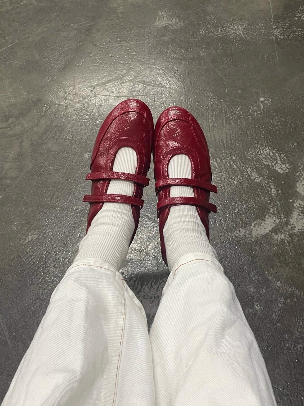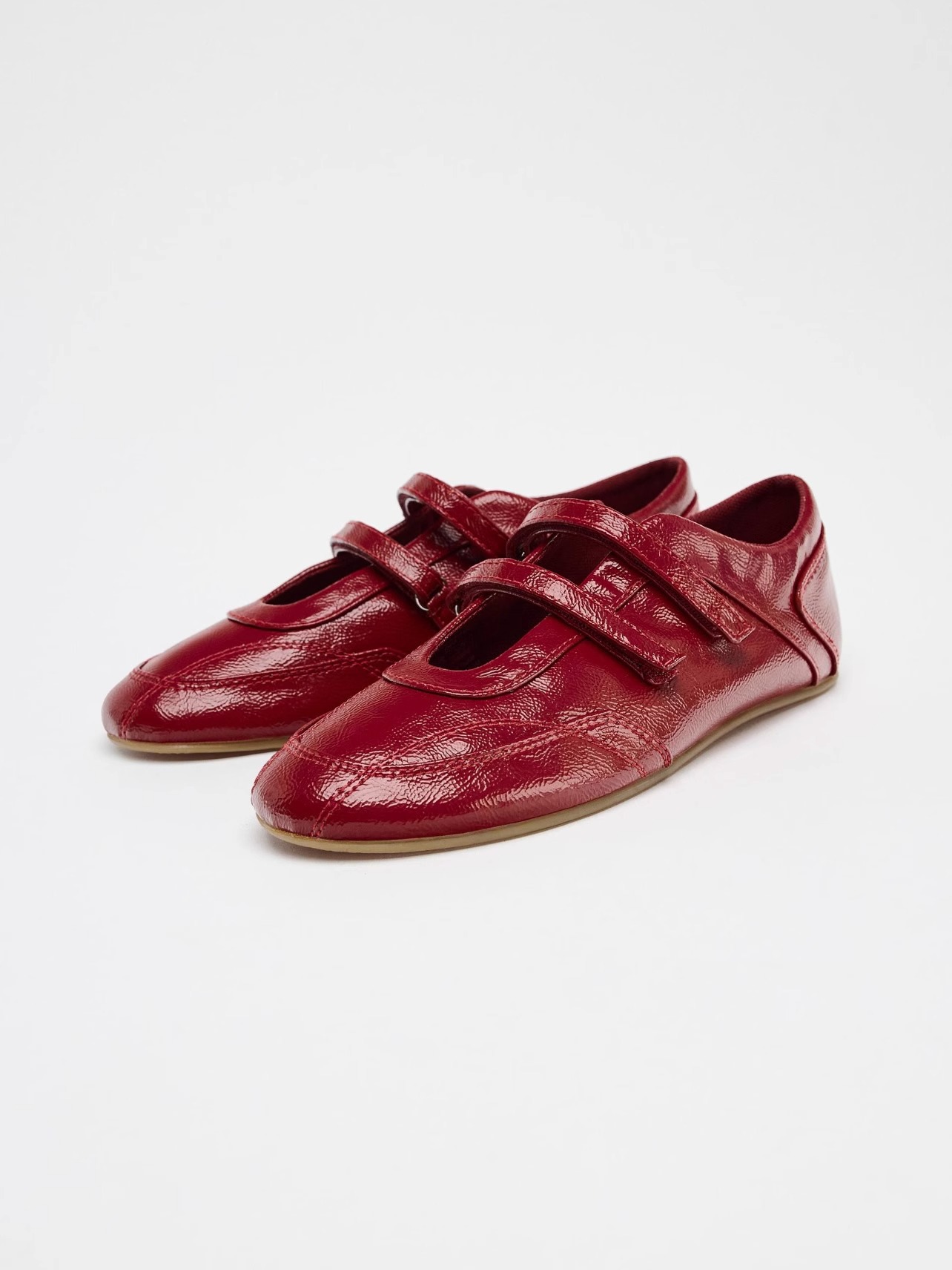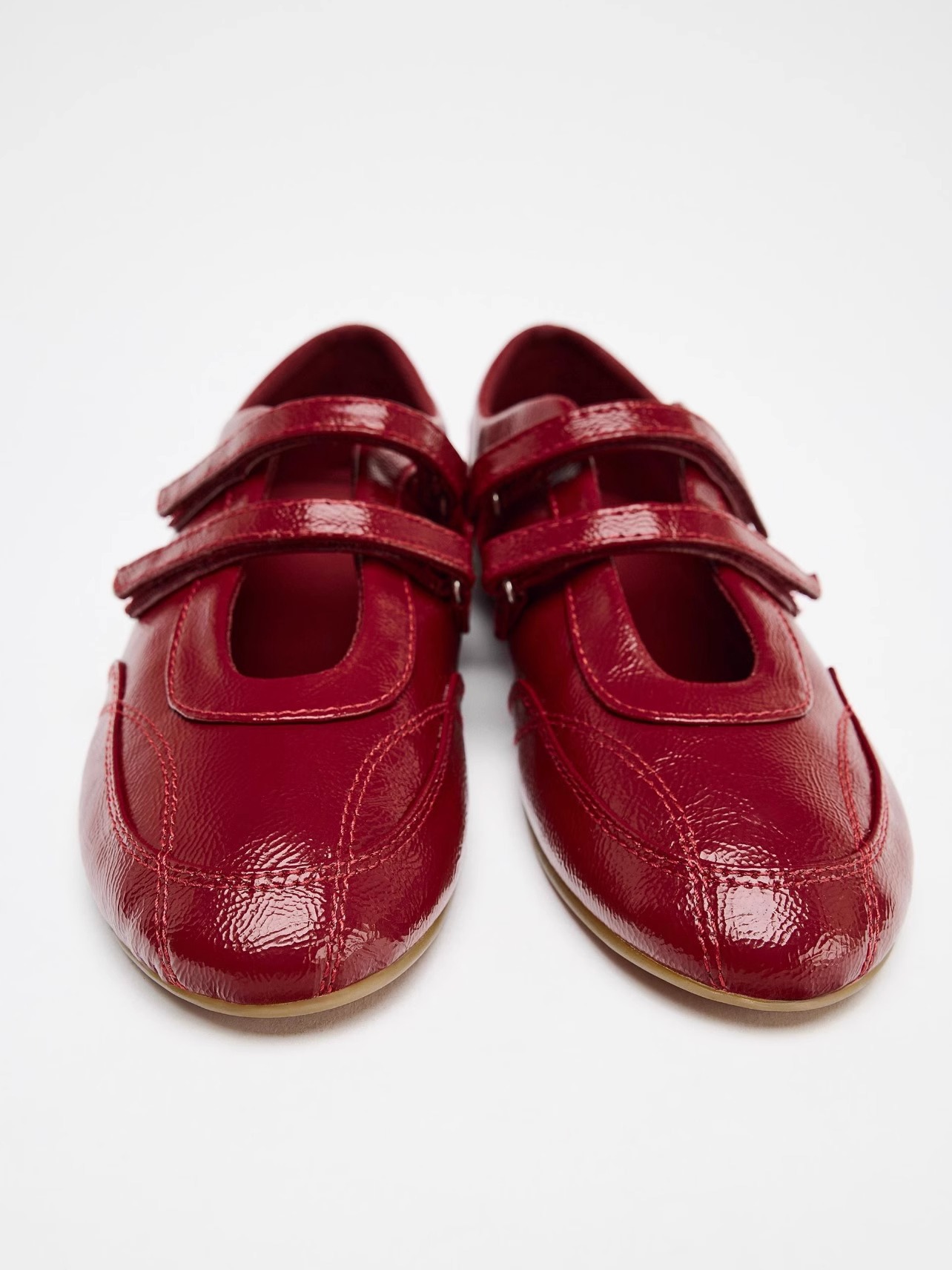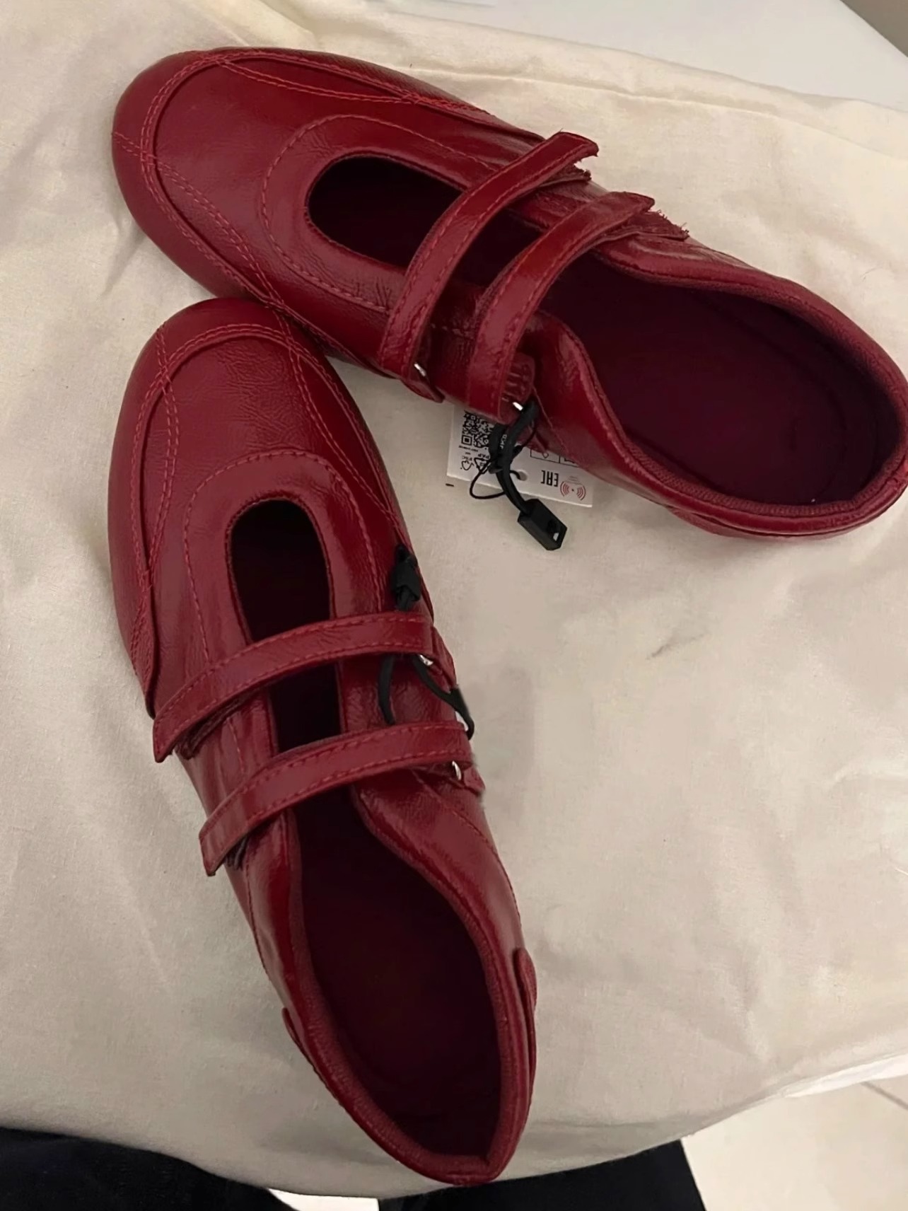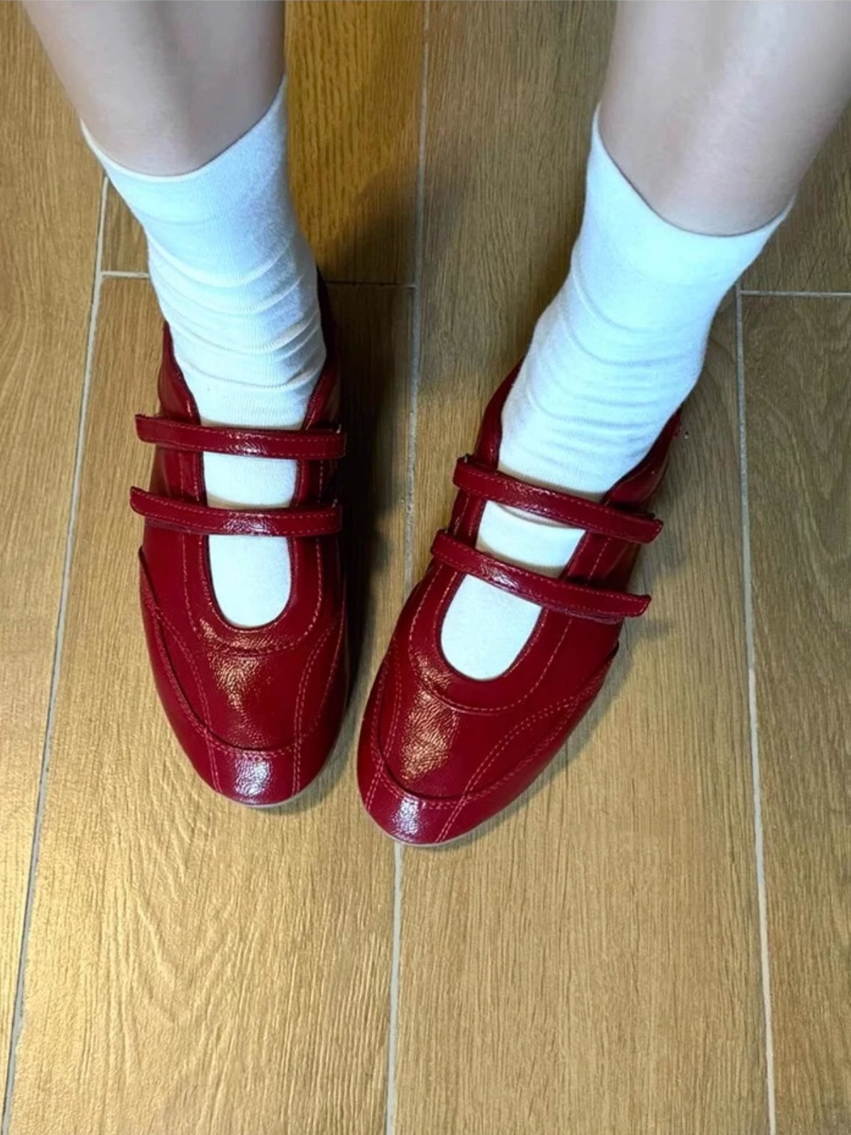 정품 가죽 ~ 보이지 않는 높이 5CM 평면 기능성 발레 신발 여성의 2025 기질 버건디 벨크로 신발스토어 가기