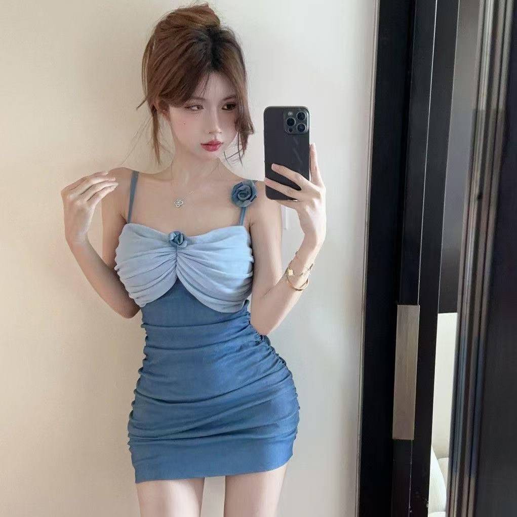 섹시한 우아한 슬리밍 주름 데님 튜브 길이 스트레치 스트랩 원피스 스파이스 소녀 입체 꽃 패션 슬림 옷스토어 가기