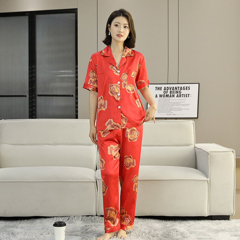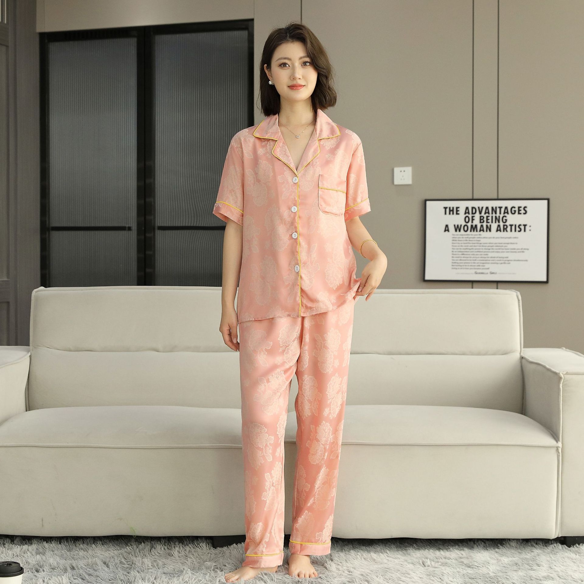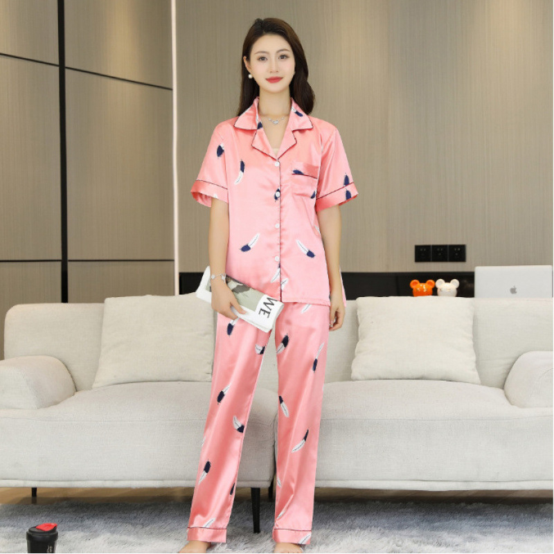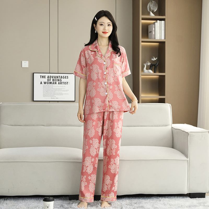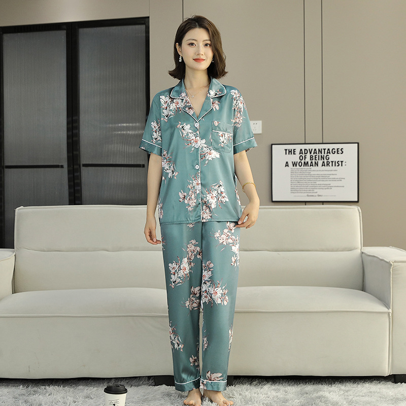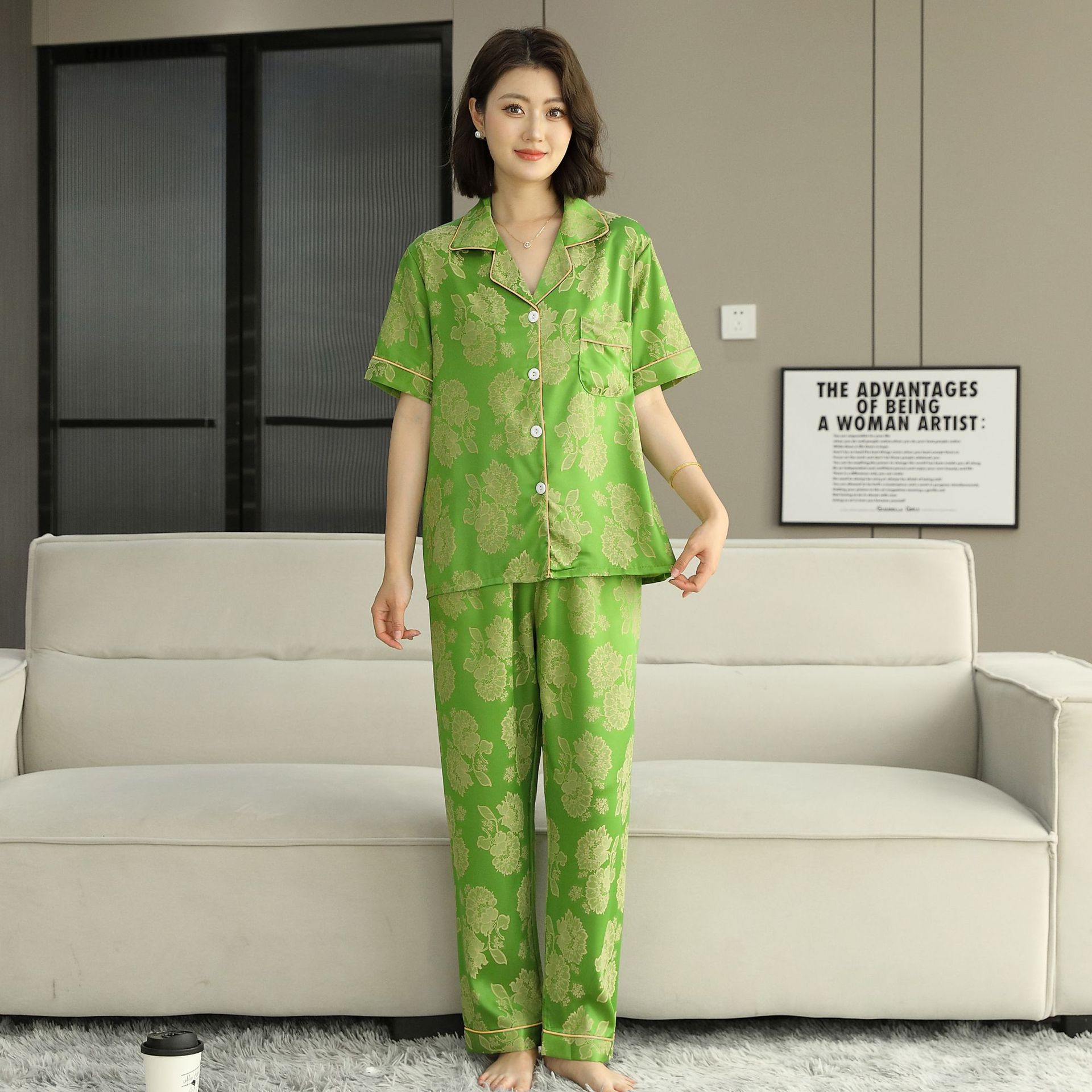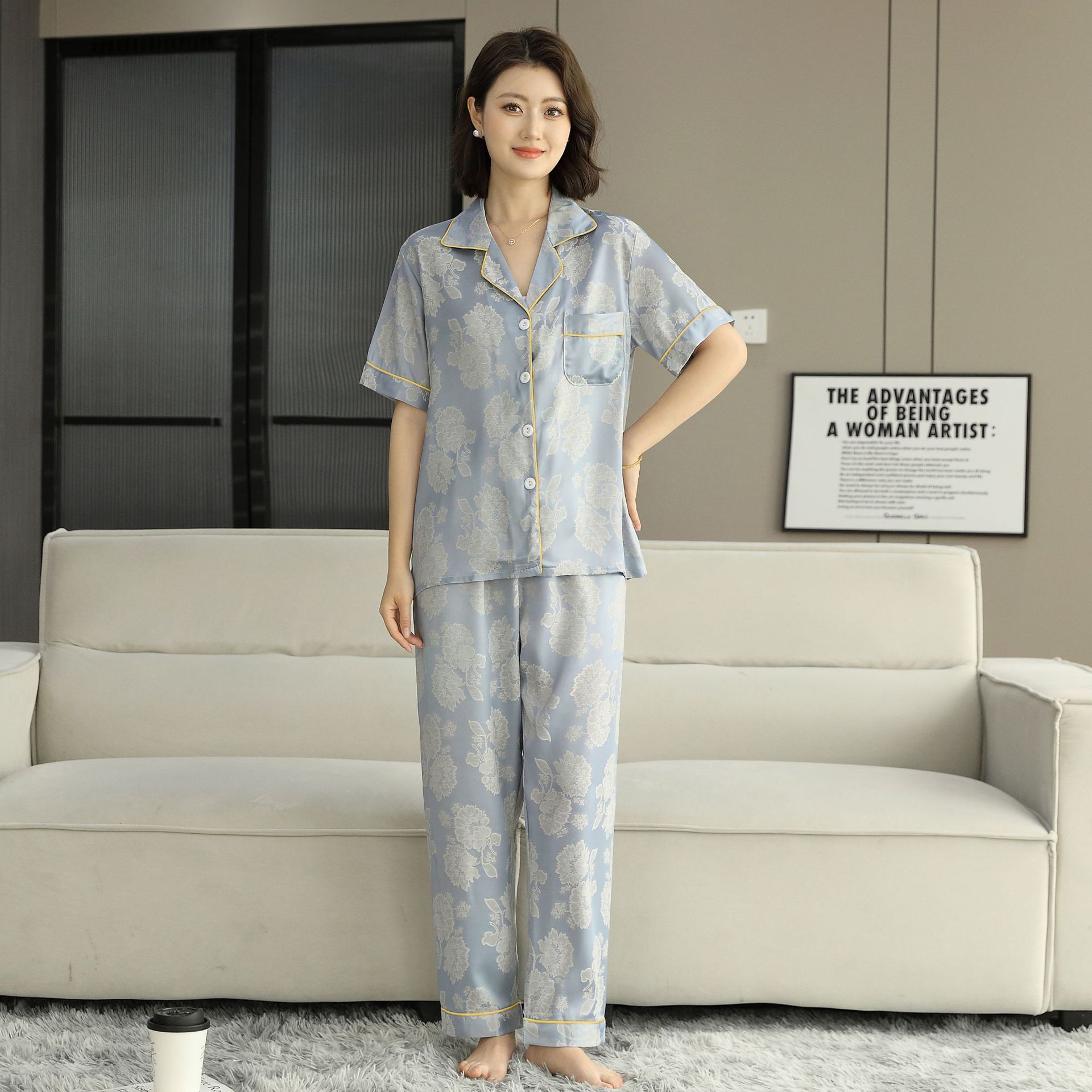 여성용 아이스 실크 잠옷, 여름용 고급 반팔 긴바지 세트, 얇은 가디건, 인조 실크, 외부 착용 가능, 대형 사이즈 홈웨어