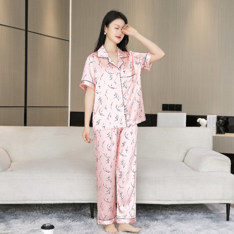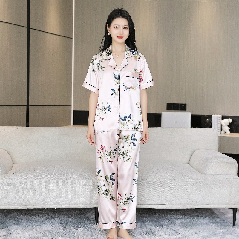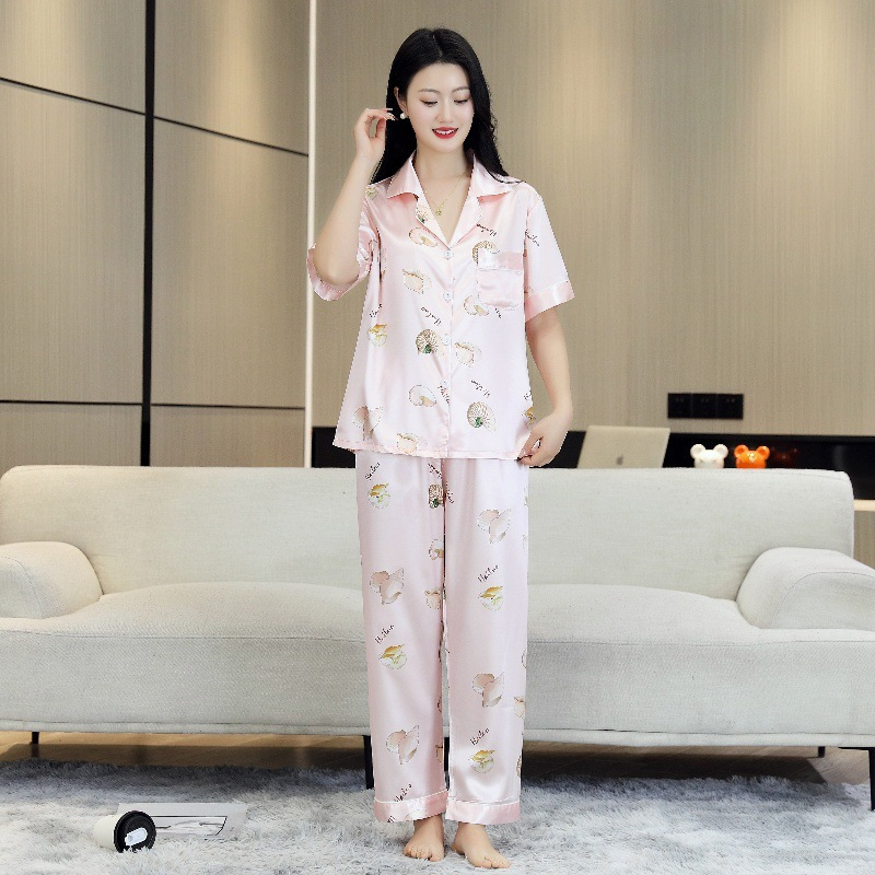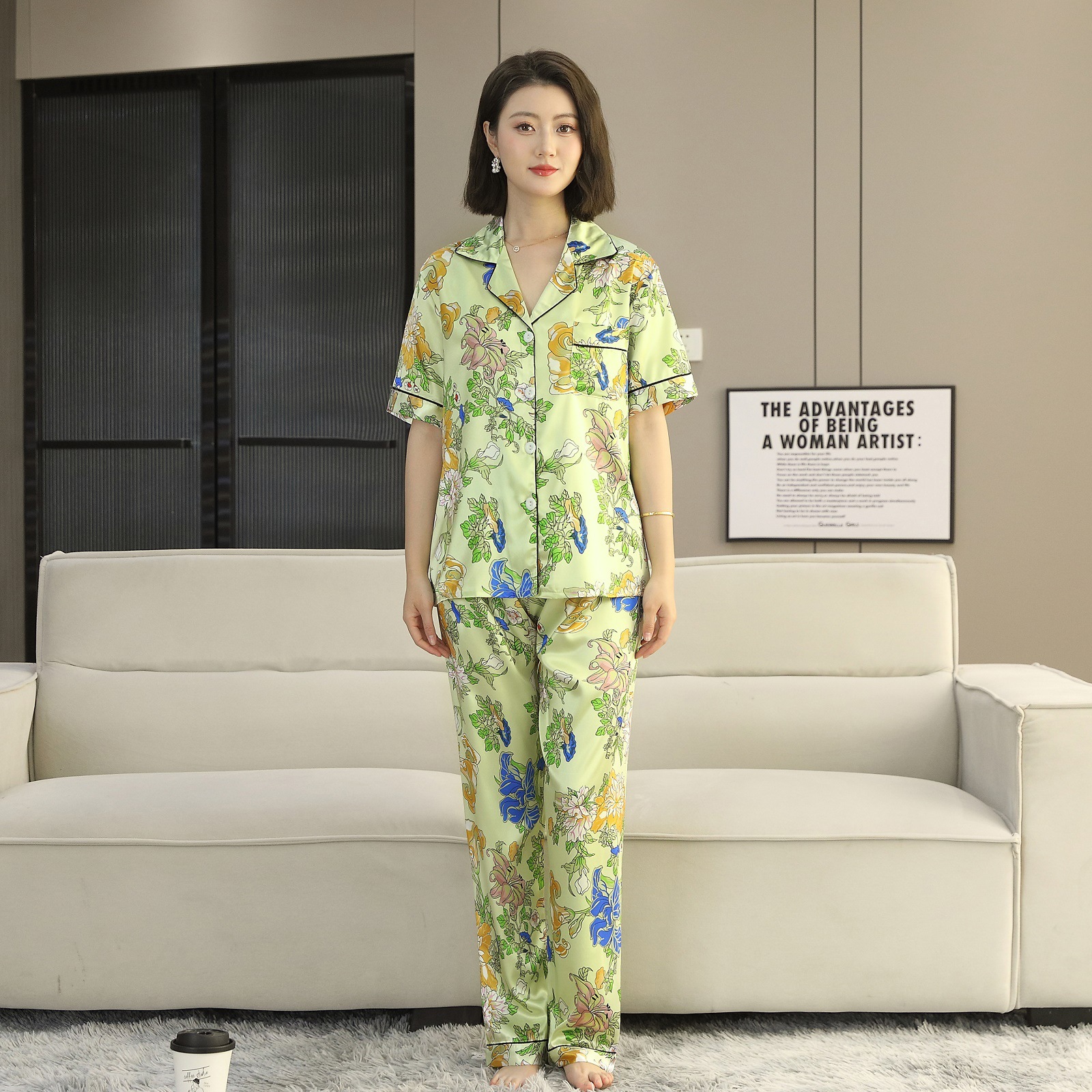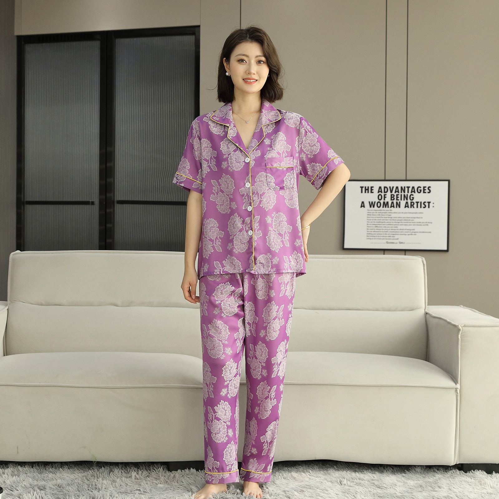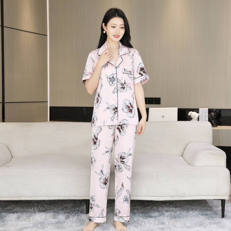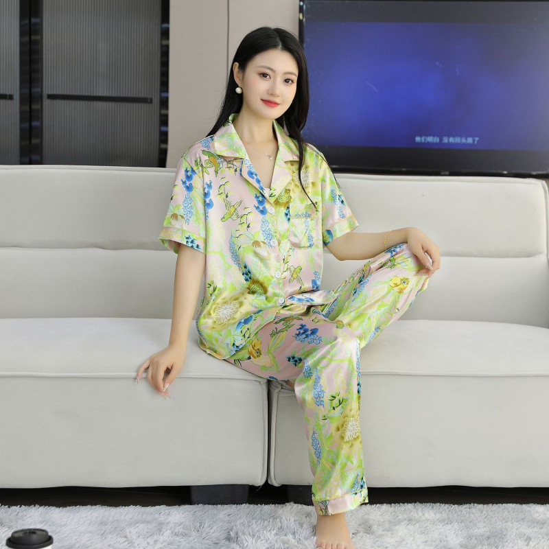 여성용 아이스 실크 잠옷, 여름용 고급 반팔 긴바지 세트, 얇은 가디건, 인조 실크, 외부 착용 가능, 대형 사이즈 홈웨어