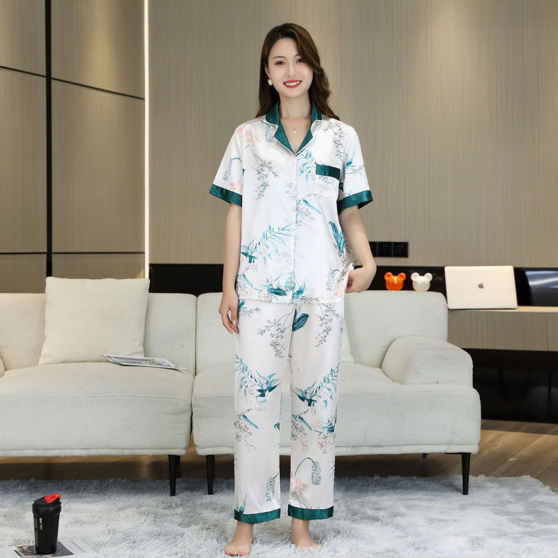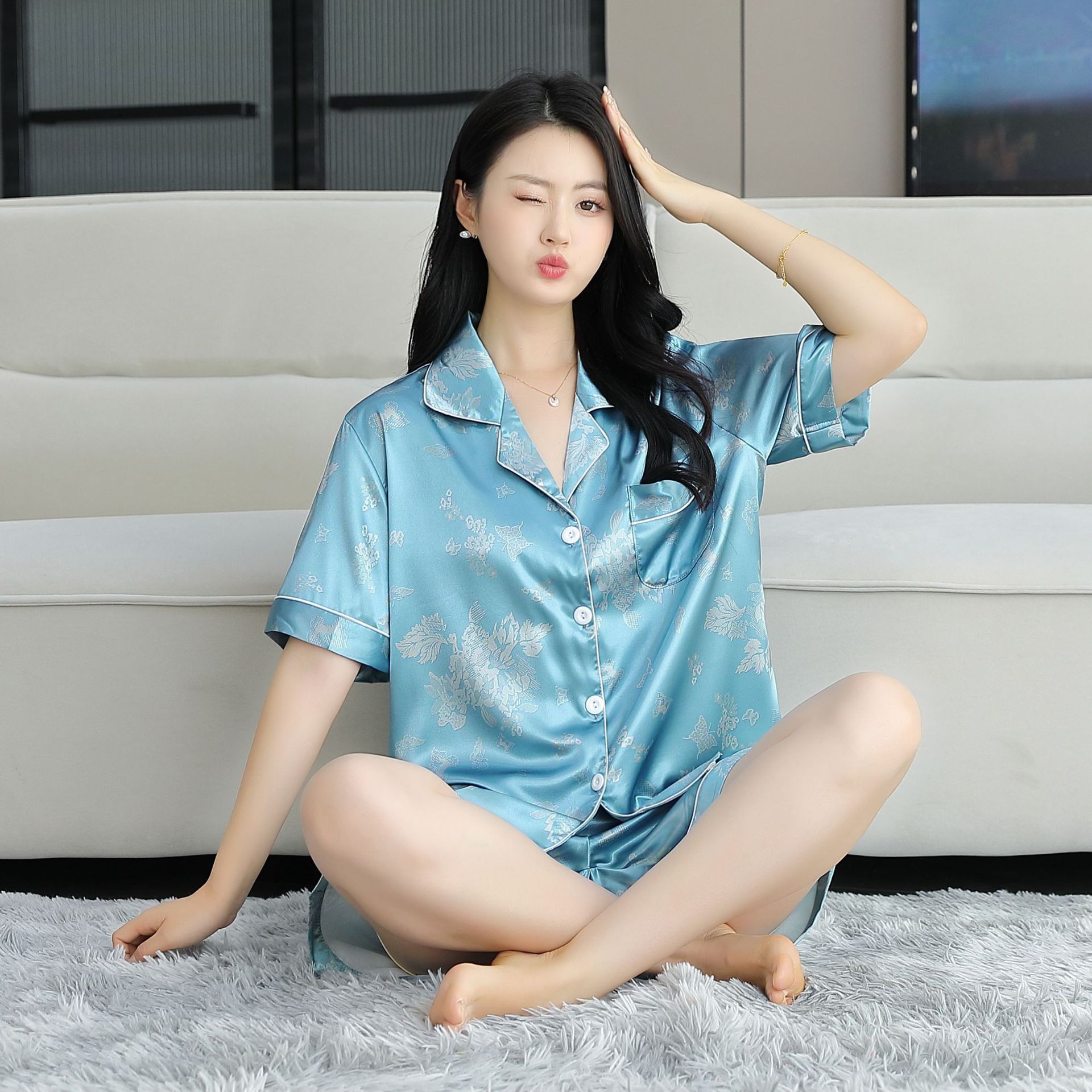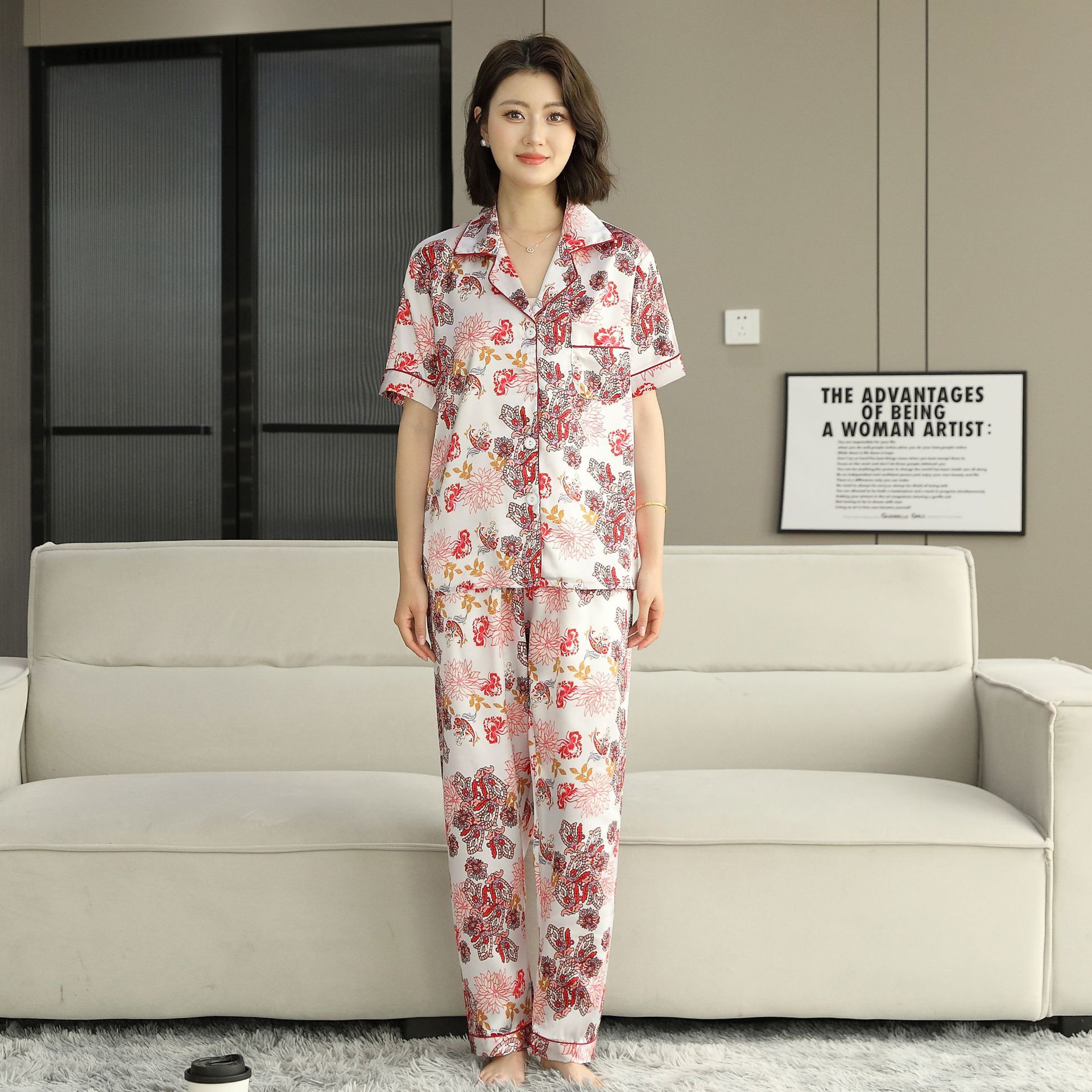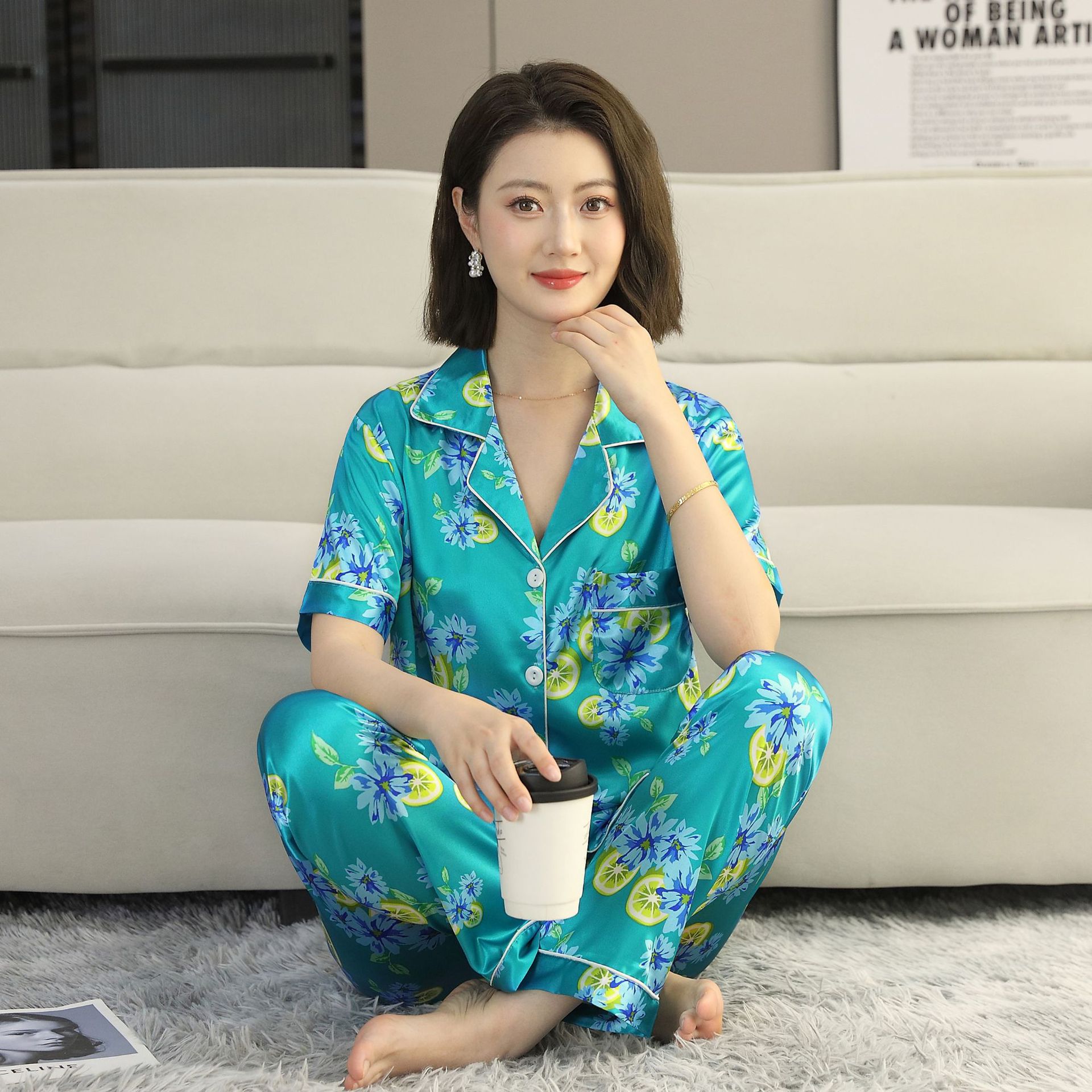 여성용 아이스 실크 잠옷, 여름용 고급 반팔 긴바지 세트, 얇은 가디건, 인조 실크, 외부 착용 가능, 대형 사이즈 홈웨어스토어 가기