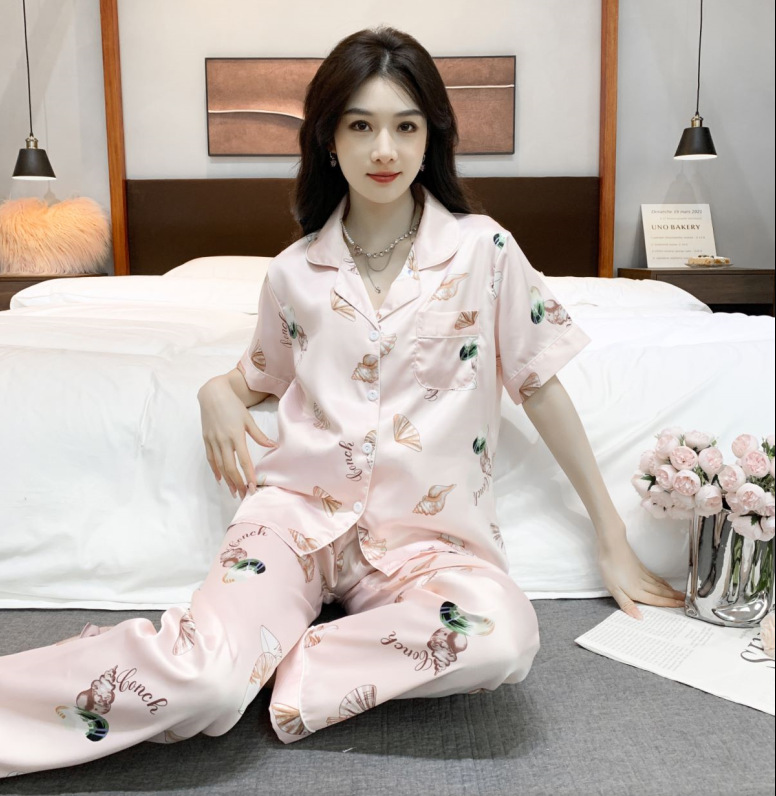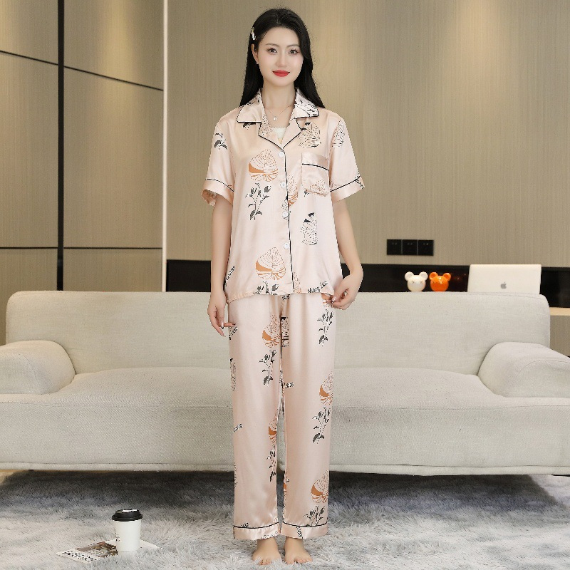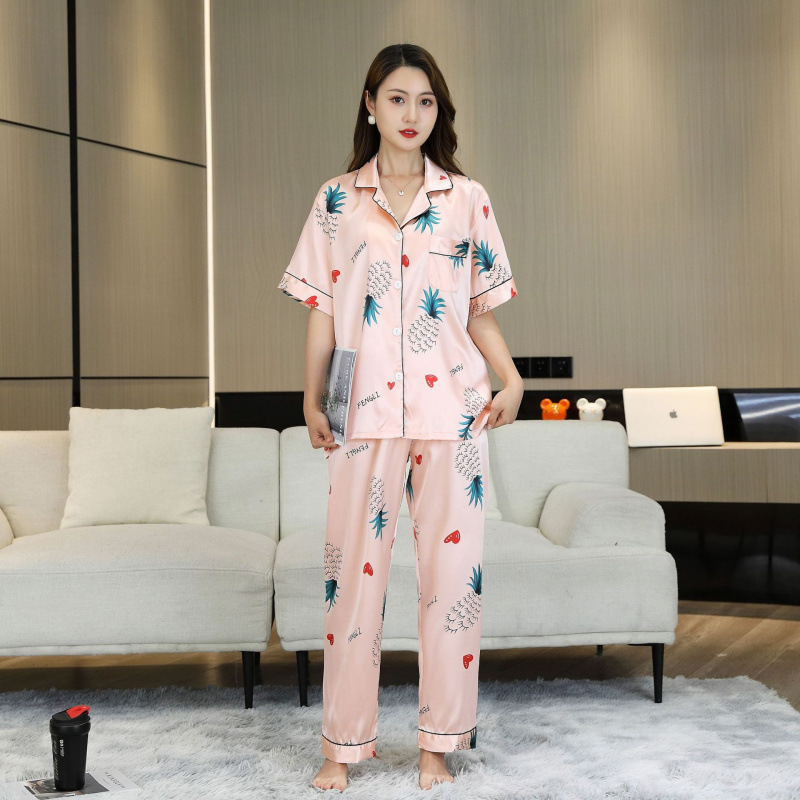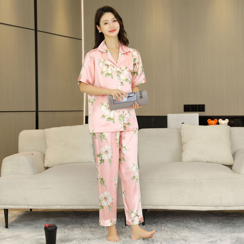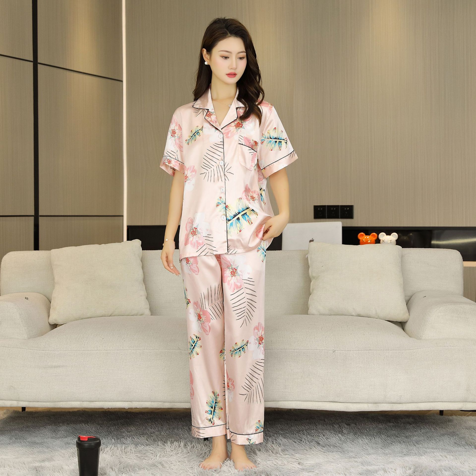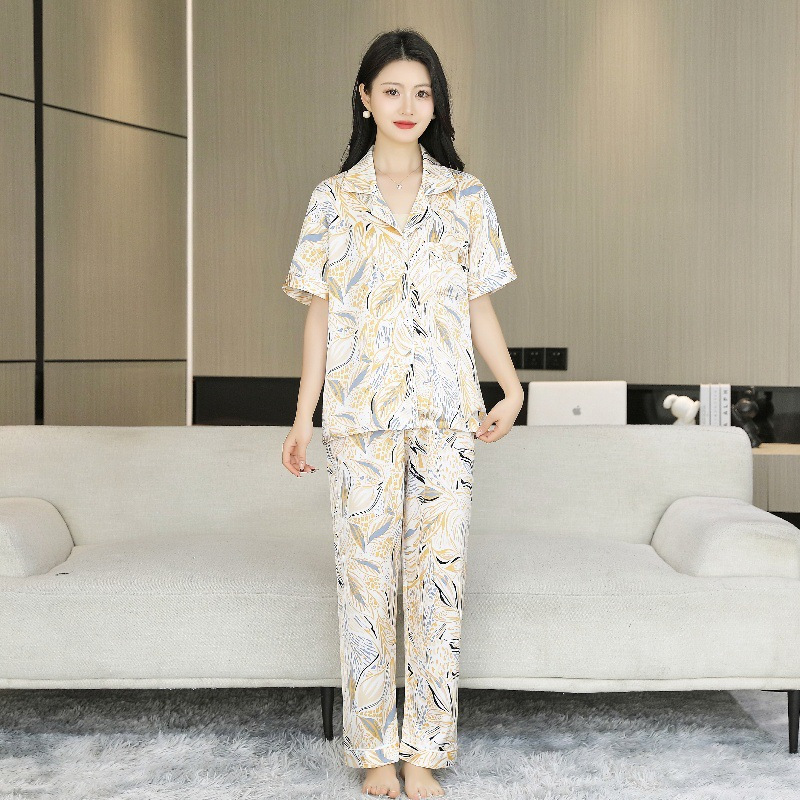 여성용 아이스 실크 잠옷, 여름용 고급 반팔 긴바지 세트, 얇은 가디건, 인조 실크, 외부 착용 가능, 대형 사이즈 홈웨어스토어 가기