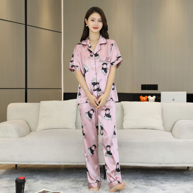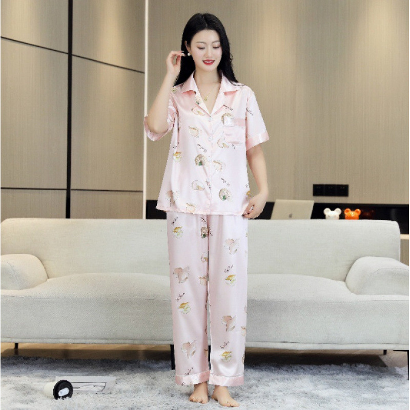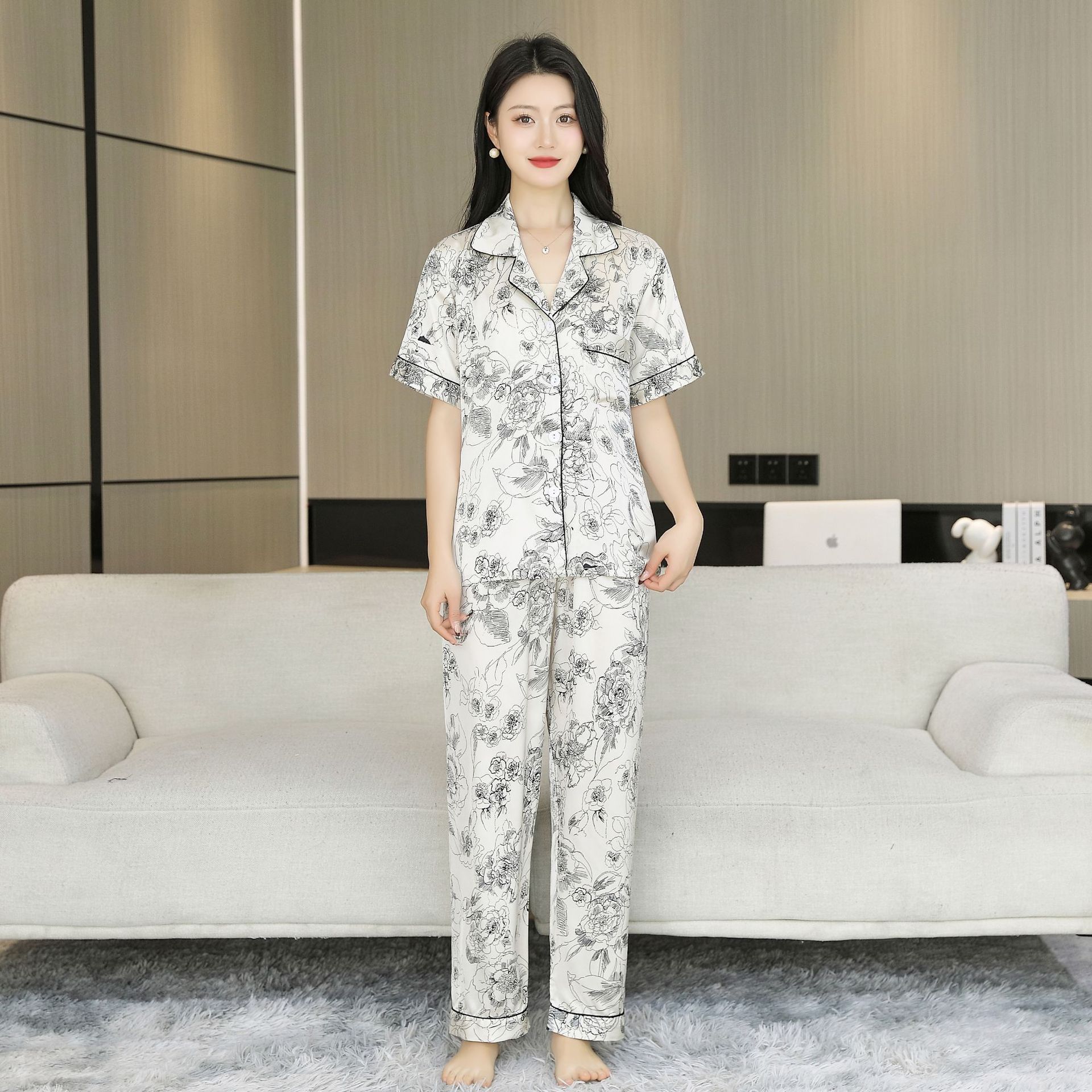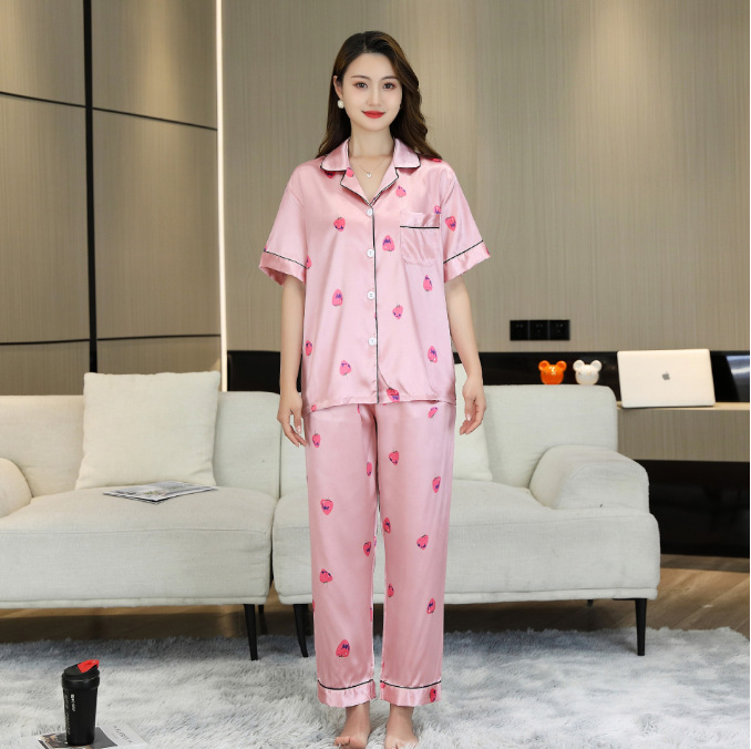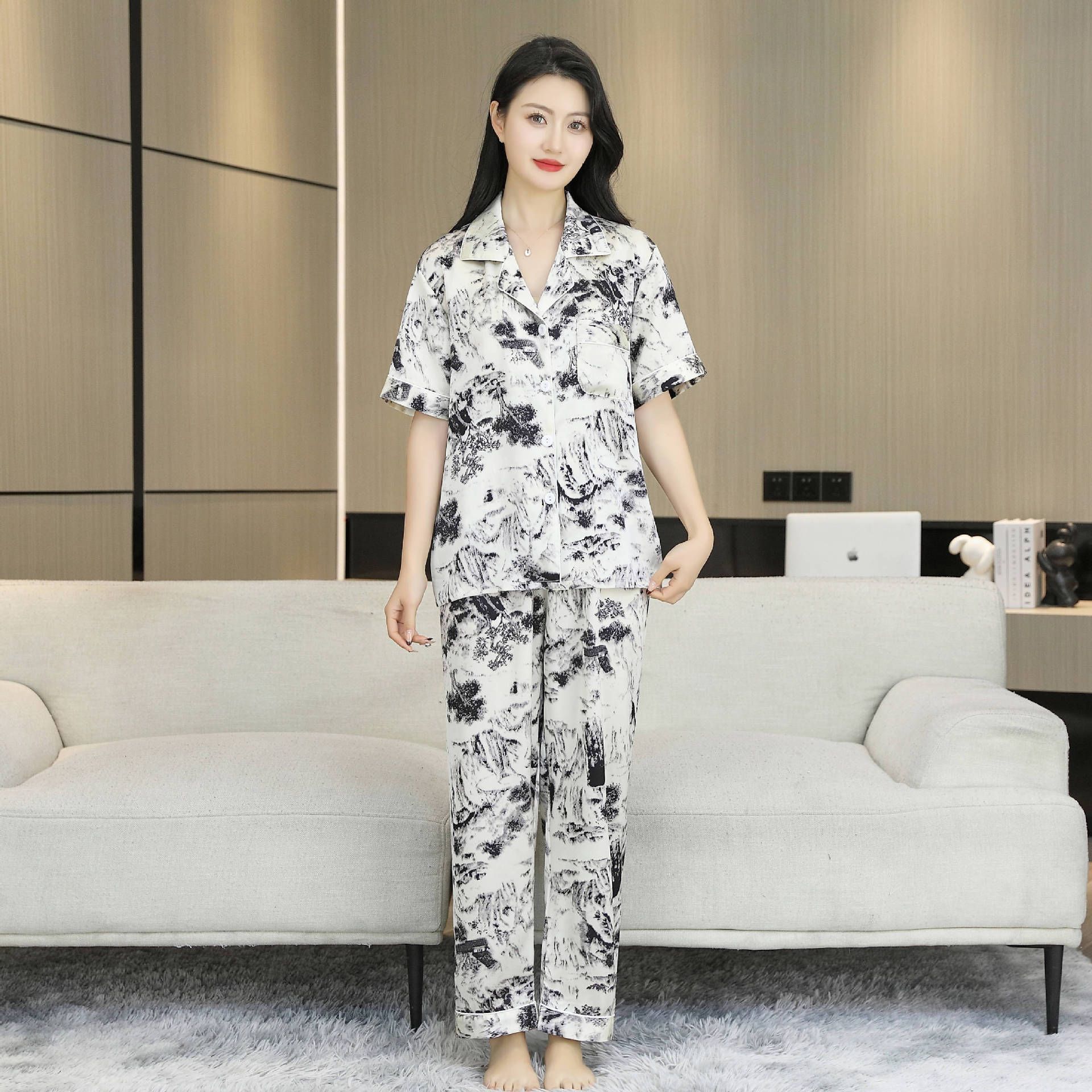 여성용 아이스 실크 잠옷, 여름용 고급 반팔 긴바지 세트, 얇은 가디건, 인조 실크, 외부 착용 가능, 대형 사이즈 홈웨어스토어 가기