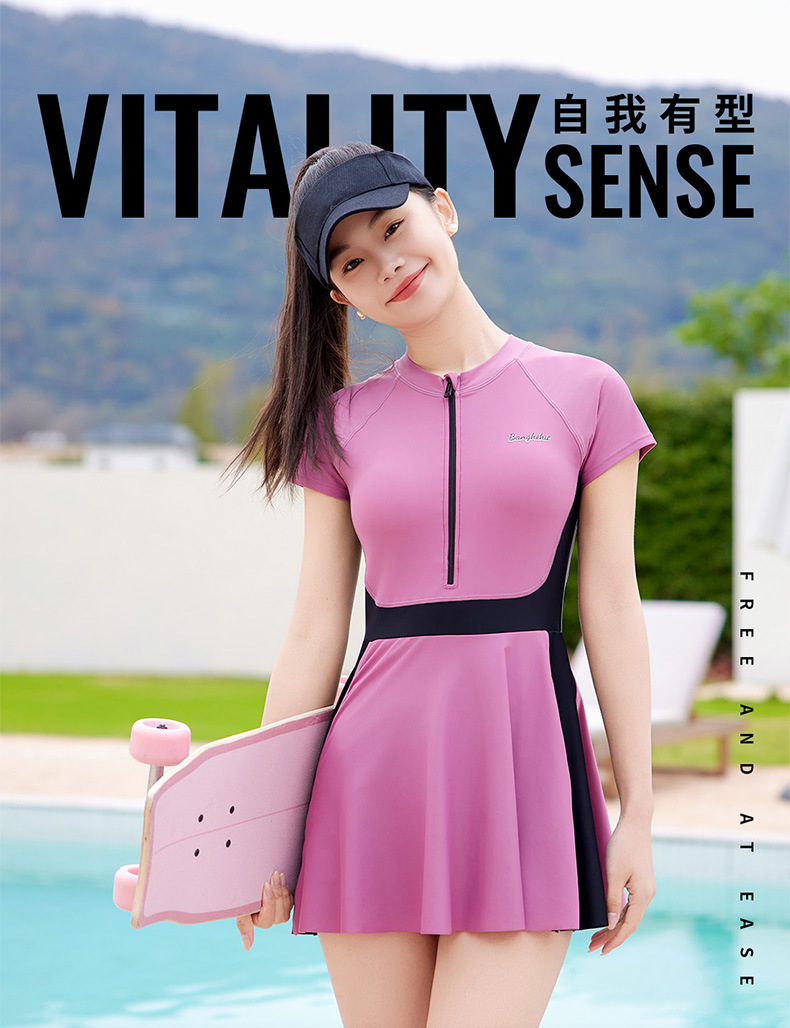 运动撞色泳衣女夏保守游泳衣遮肚显瘦2025新款海边防晒连体泳装