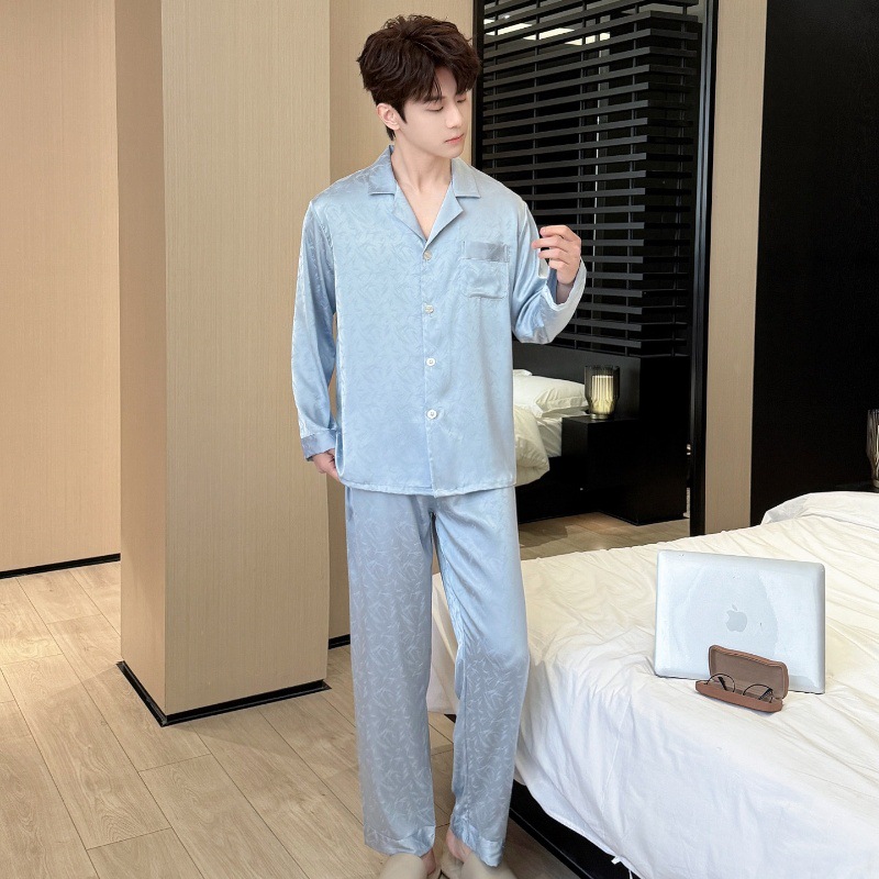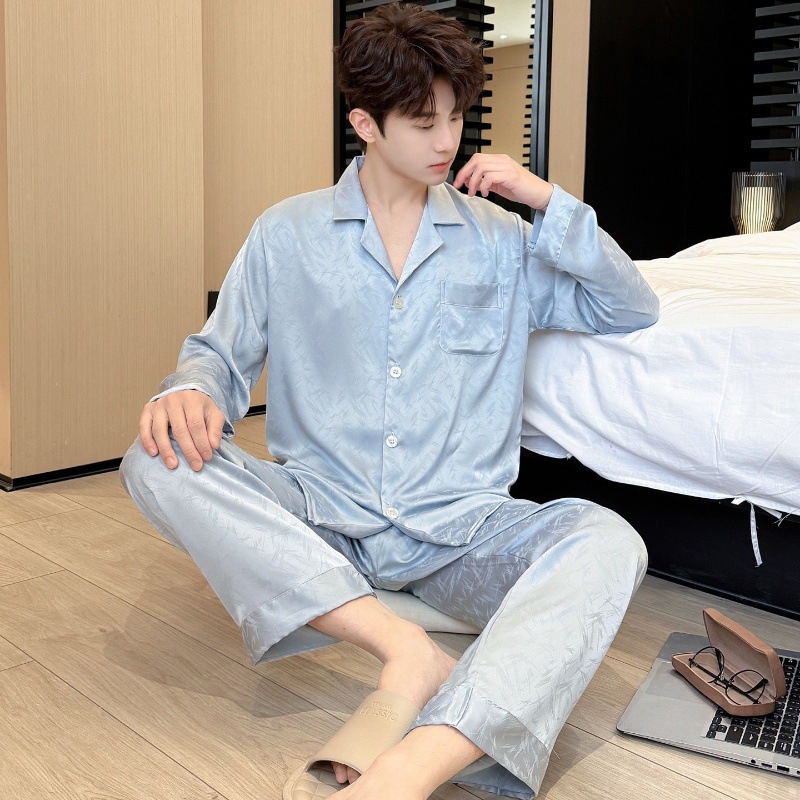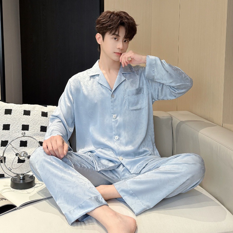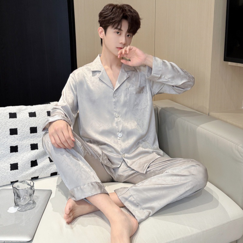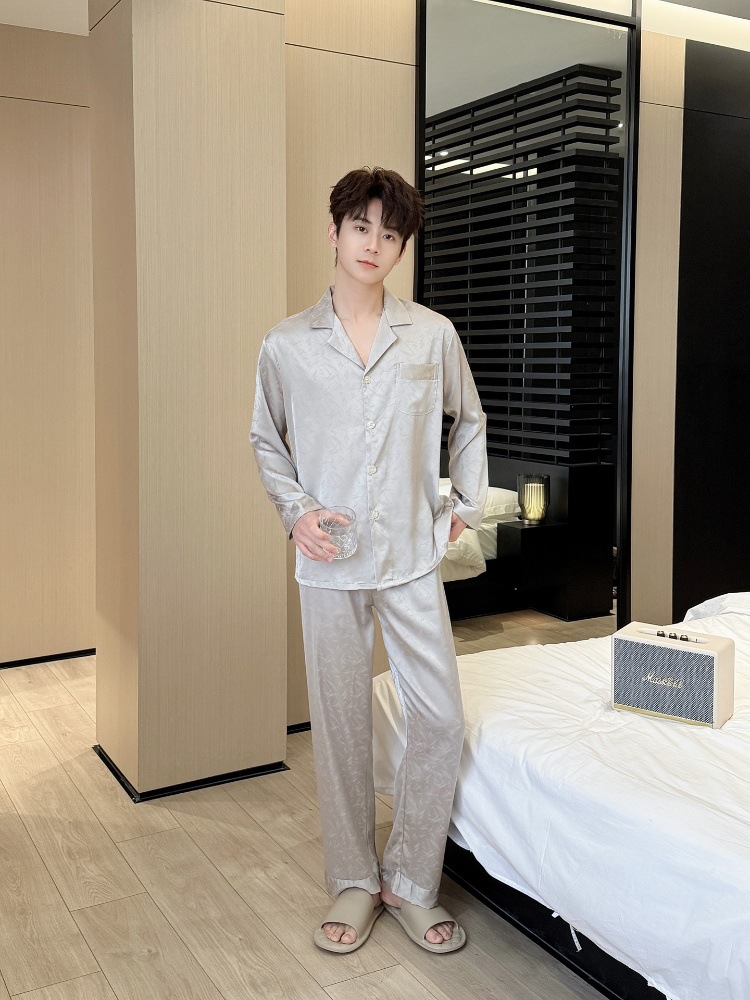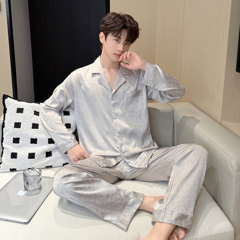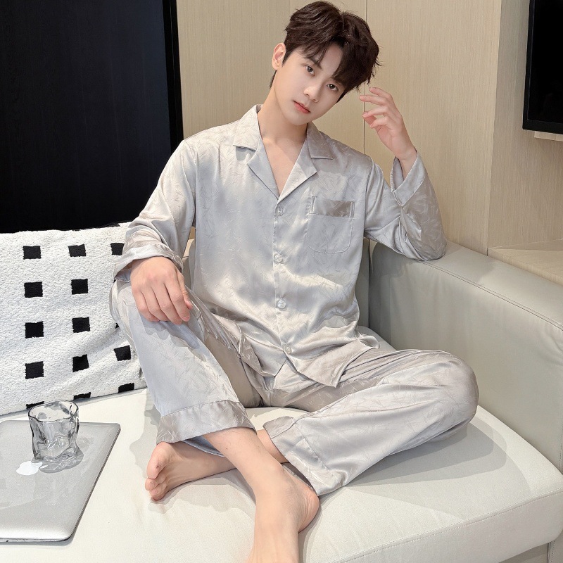 새로운 봄 여름 스타일의 가벼운 고급 얼음 실크 남성용 잠옷, 긴팔 바지, 얇고 고급스러운 홈웨어 세트, 야외에서 착용 가능