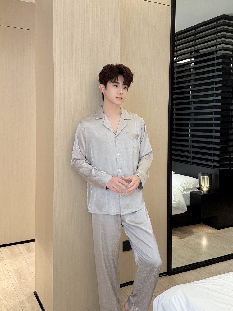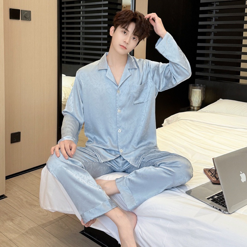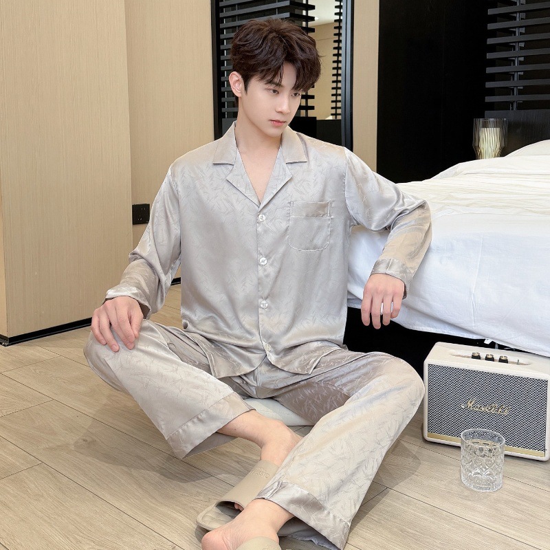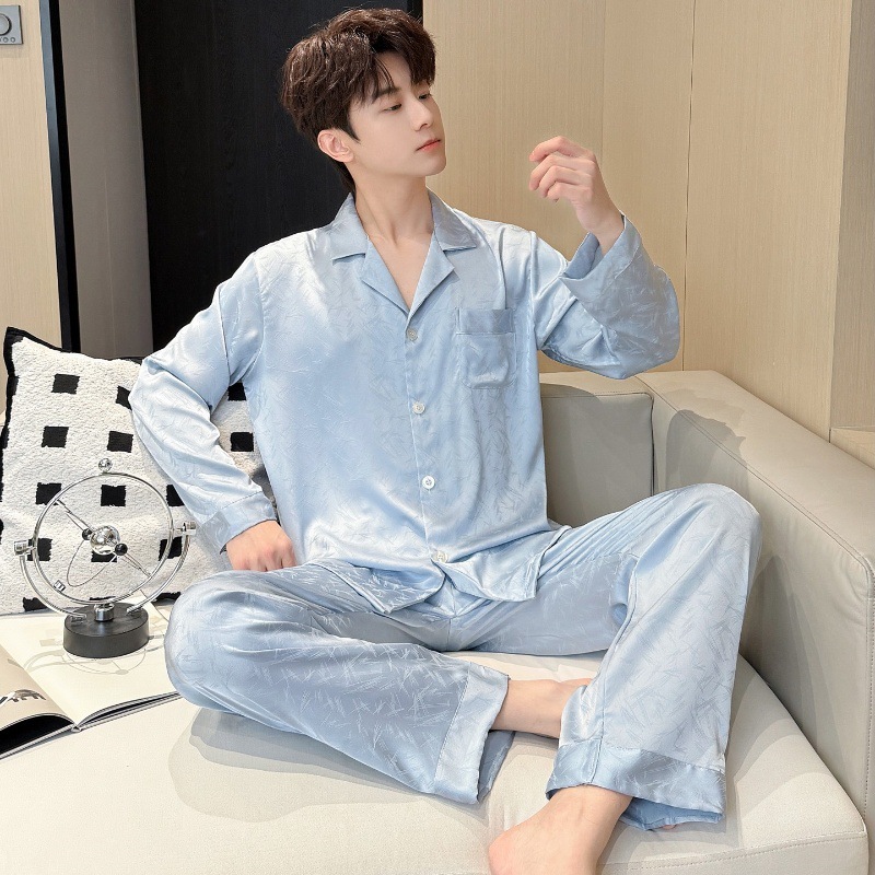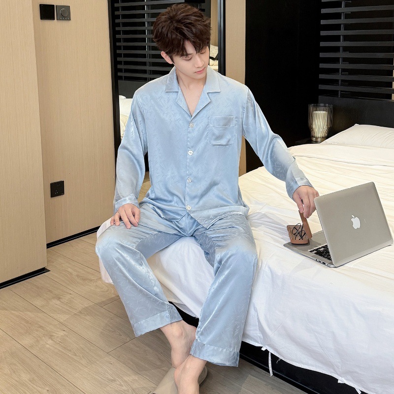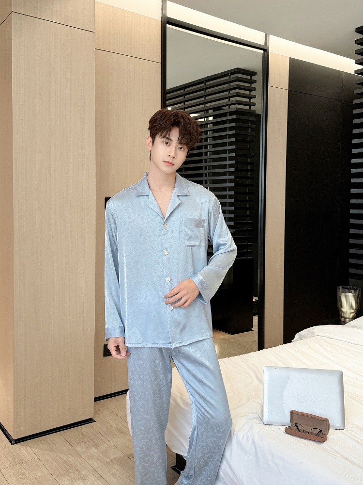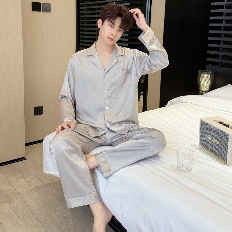 새로운 봄 여름 스타일의 가벼운 고급 얼음 실크 남성용 잠옷, 긴팔 바지, 얇고 고급스러운 홈웨어 세트, 야외에서 착용 가능