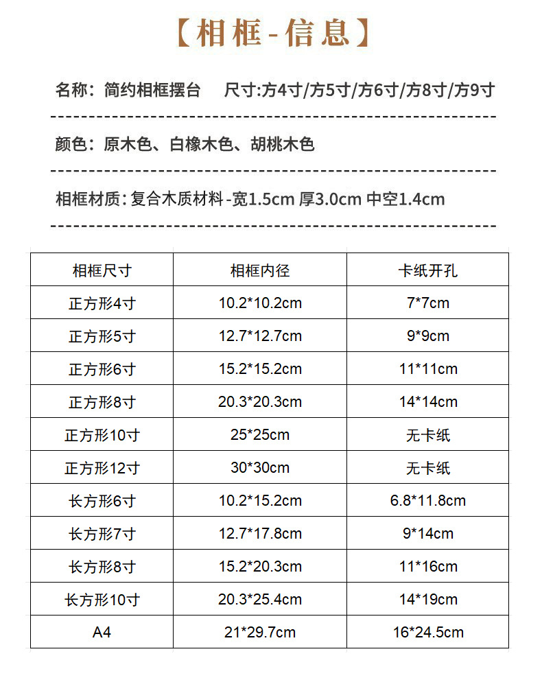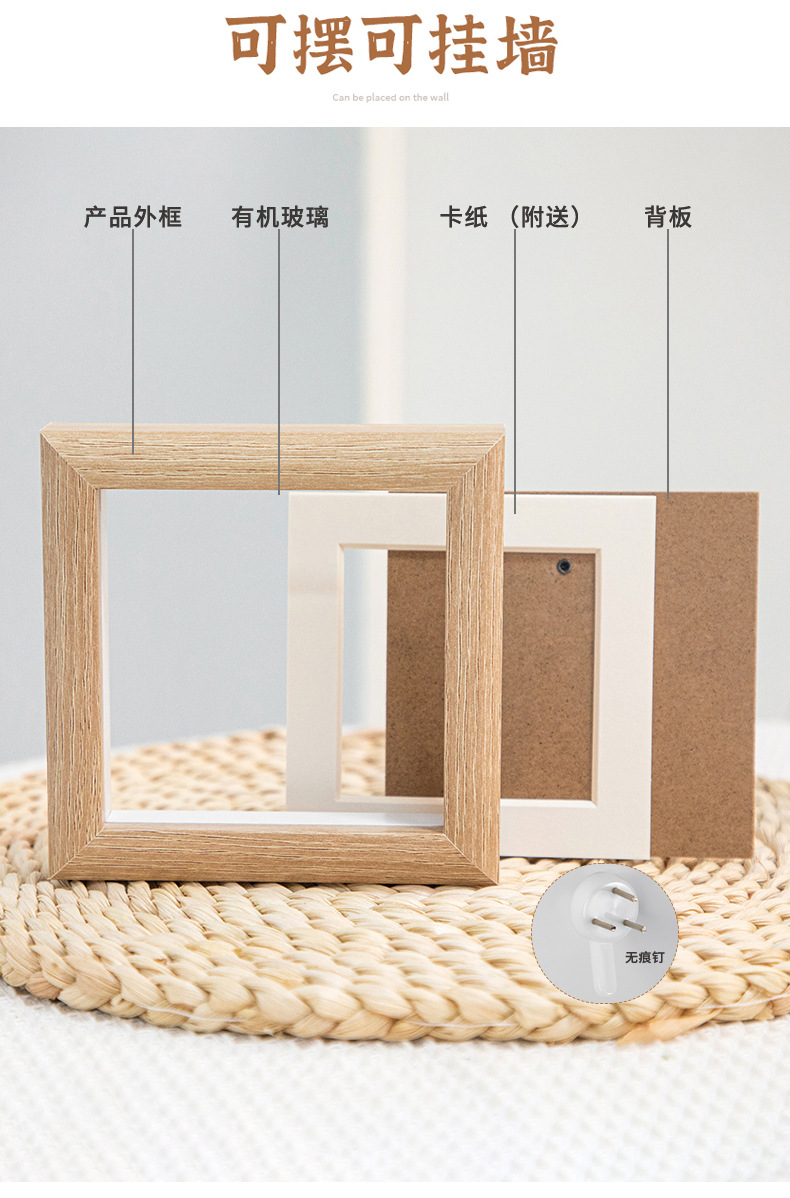 二、相框成品包含:外框、卡纸、(正方形10寸12寸无卡纸)塑料有机玻璃面板、后密度板背板、