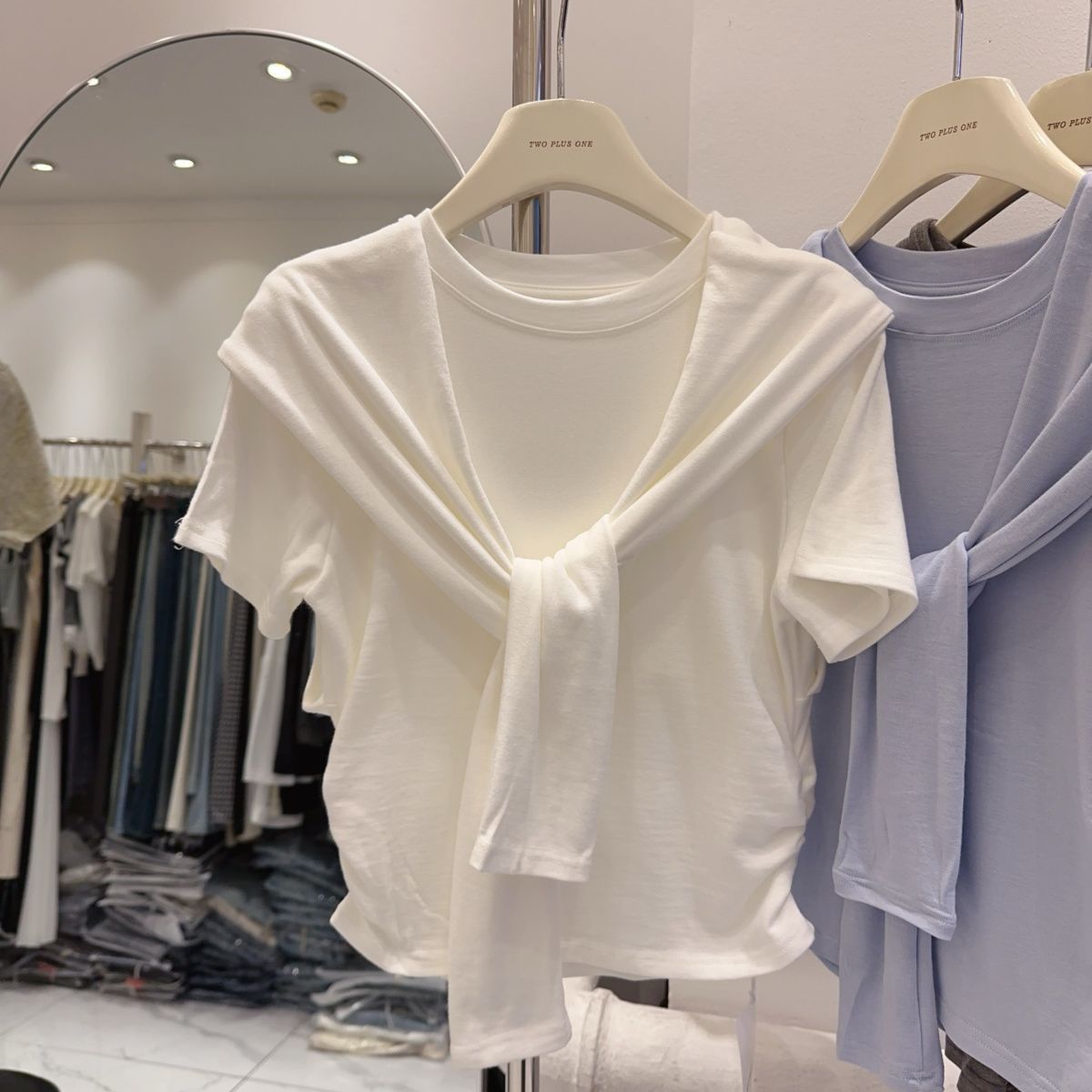 모달 디자인 틈새 숄 가짜 투피스 티셔츠 여성 반팔 탑 연령 감소 솔리드 컬러 짧은 탑 도매스토어 가기