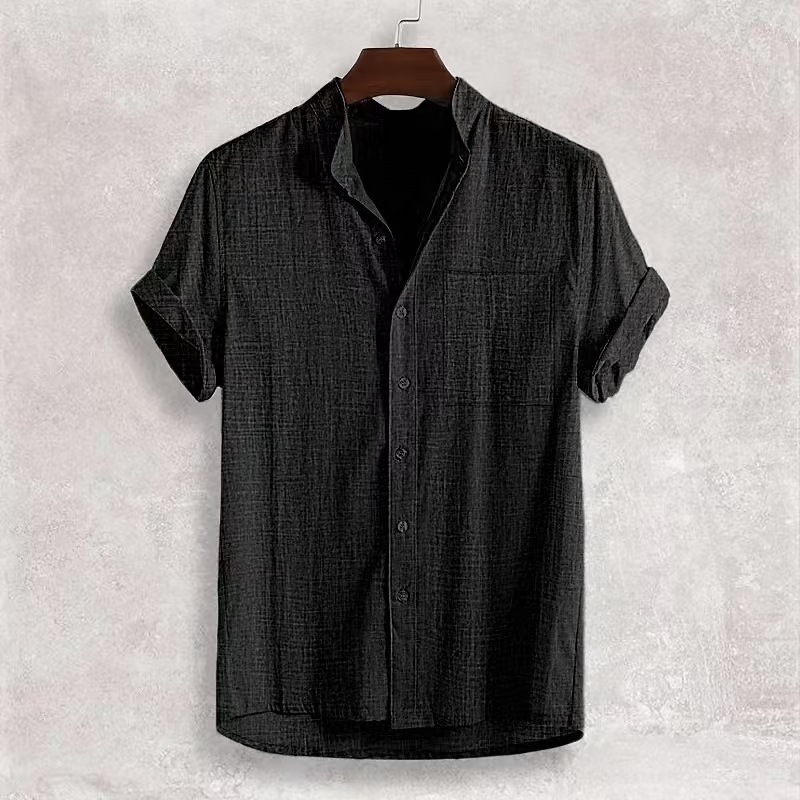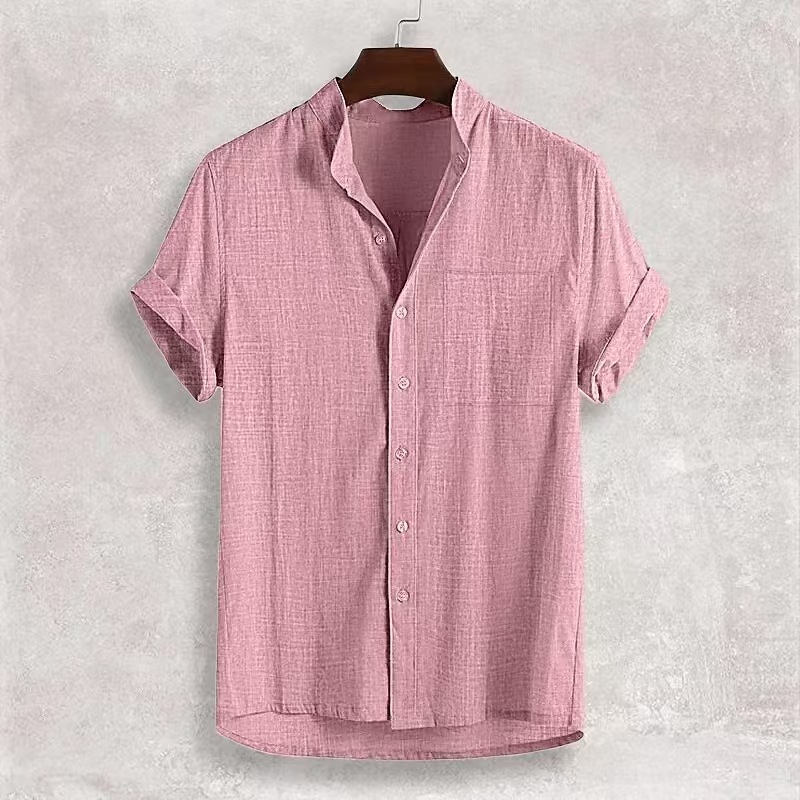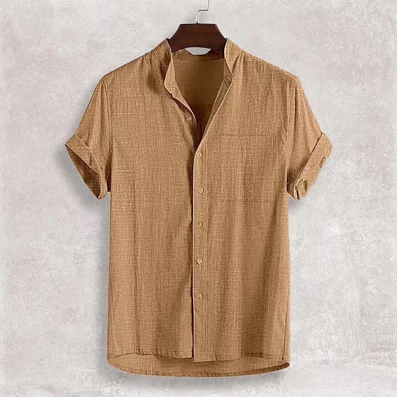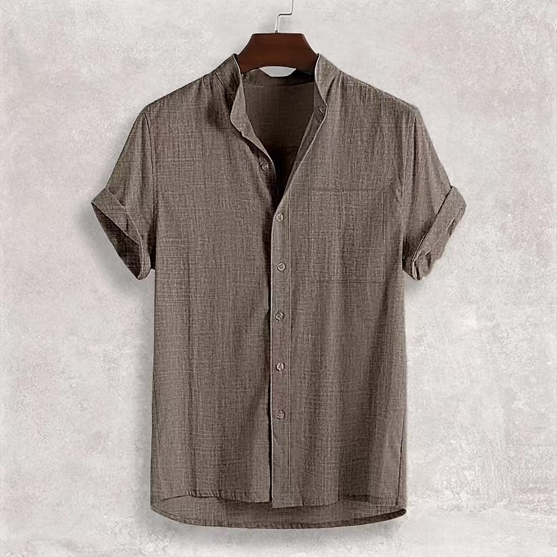 국경을 넘나드는 아마존의 인기 여름 남성 반팔 면 및 린넨 셔츠, 편안하고 캐주얼한 스탠드 칼라 카디건 남성용 솔리드 컬러 셔츠