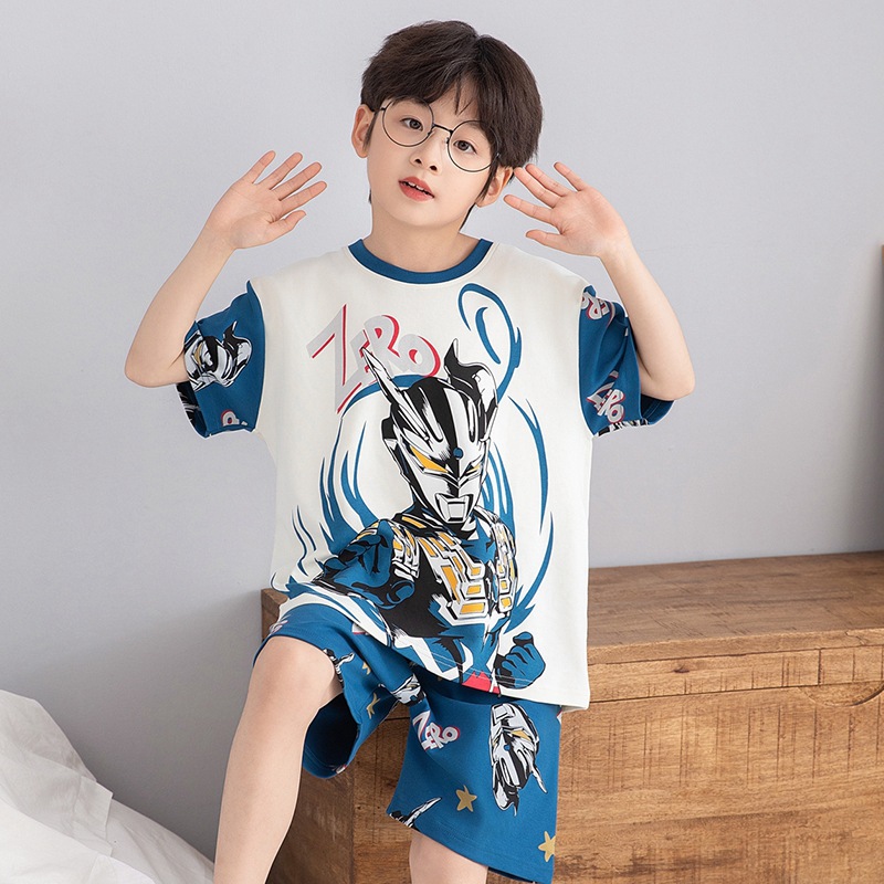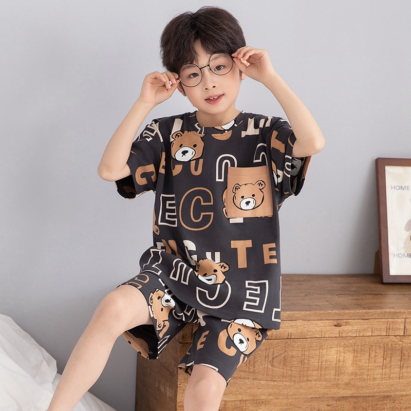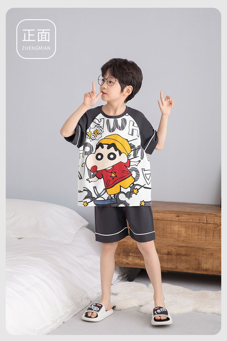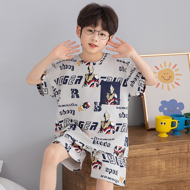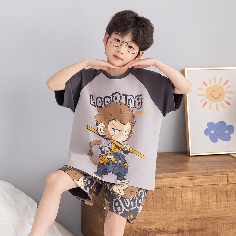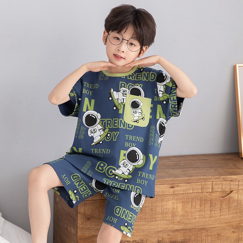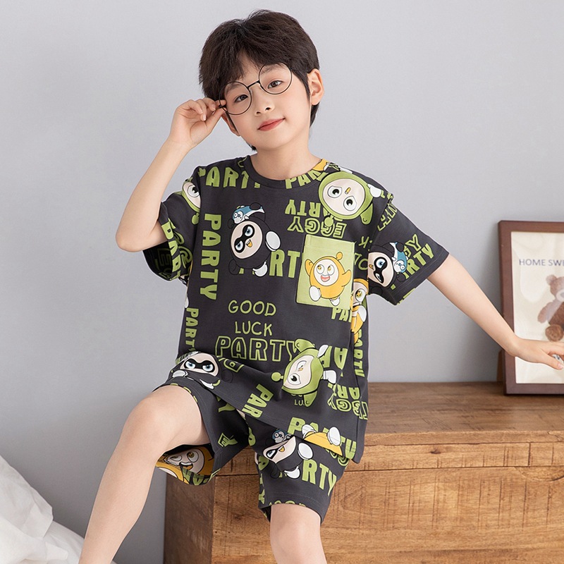 소년 잠옷 여름 라운드 넥 만화 캐주얼 면화 반팔 얇은 중대형 어린이 및 청소년 가정복은 밖에서 착용 가능