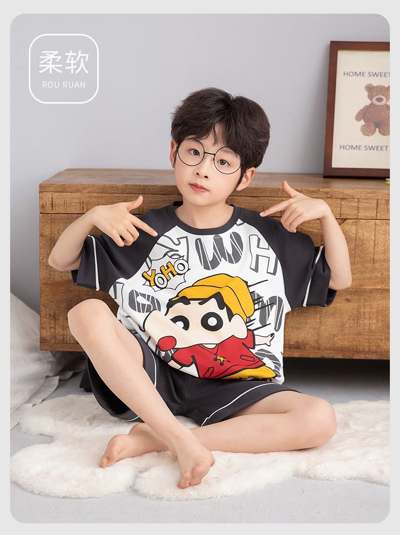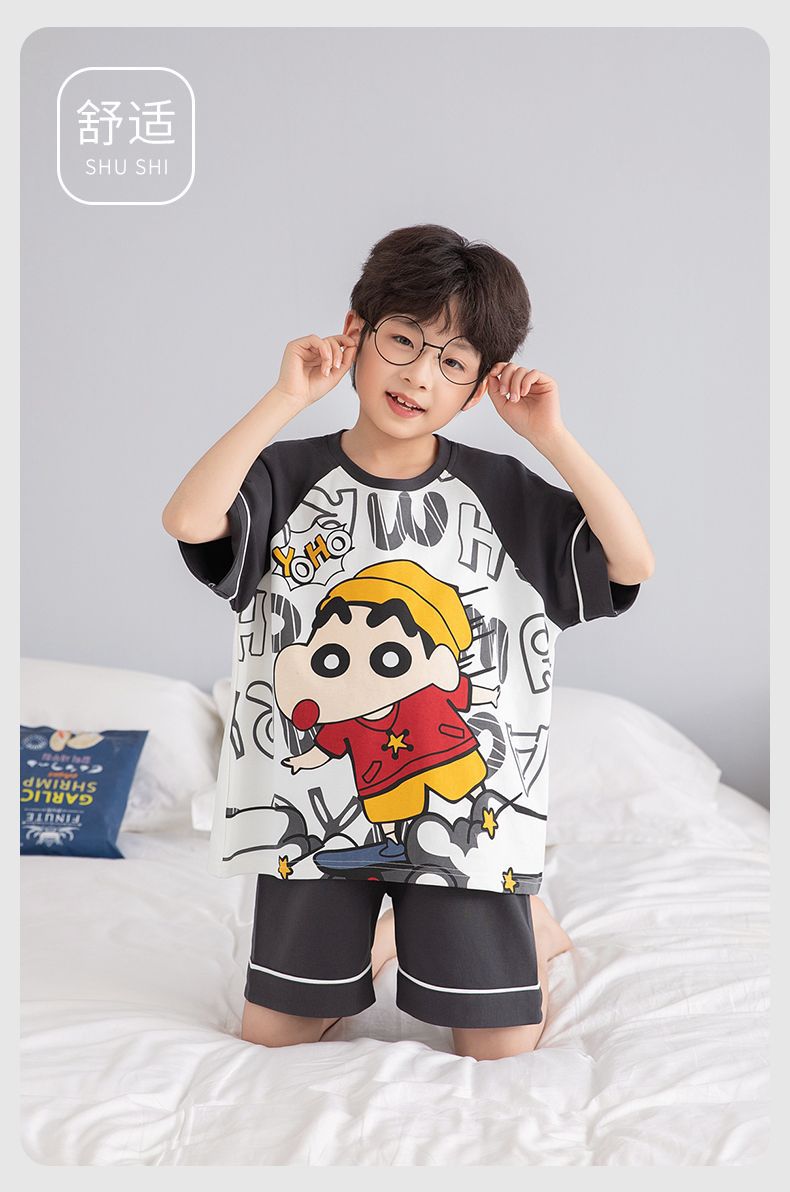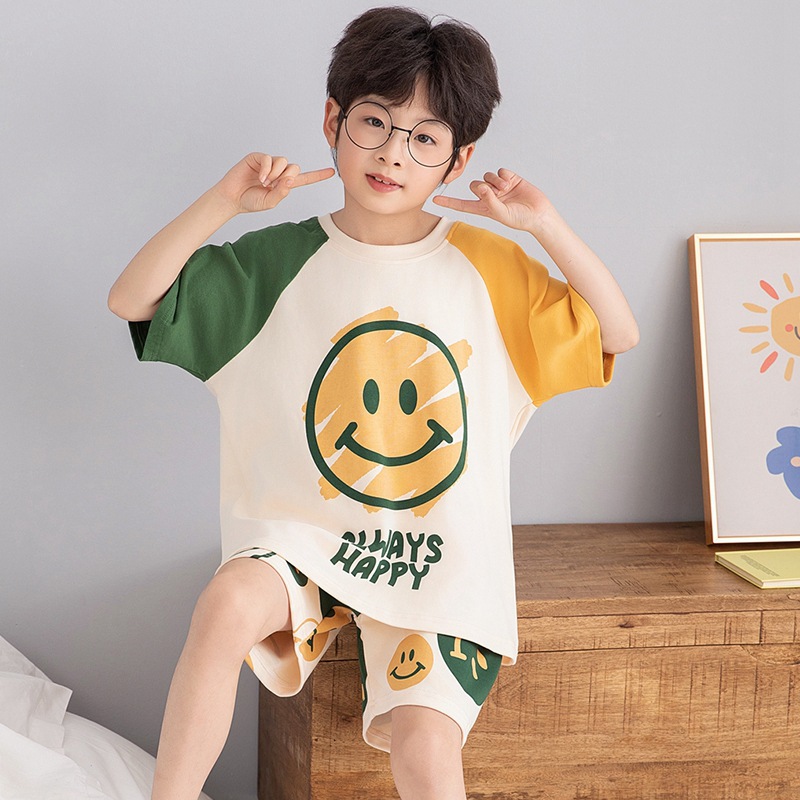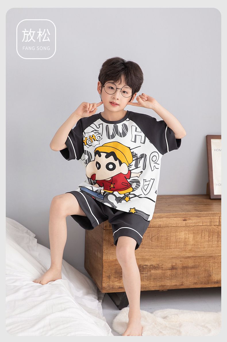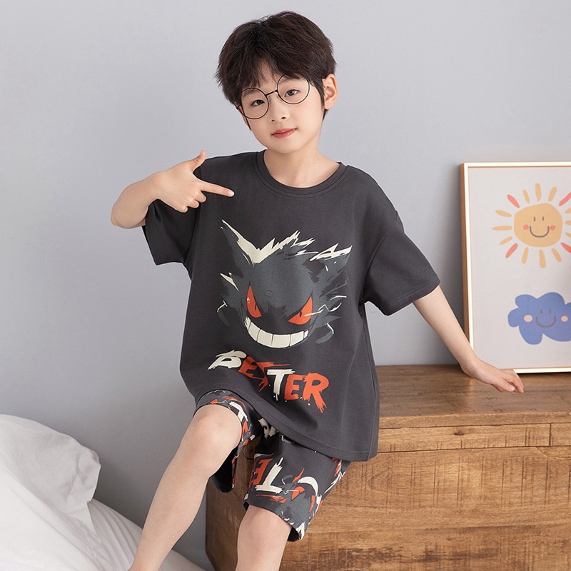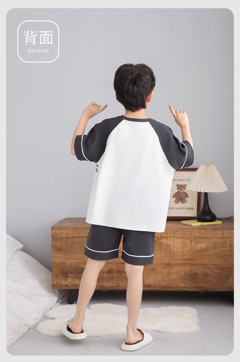 소년 잠옷 여름 라운드 넥 만화 캐주얼 면화 반팔 얇은 중대형 어린이 및 청소년 가정복은 밖에서 착용 가능