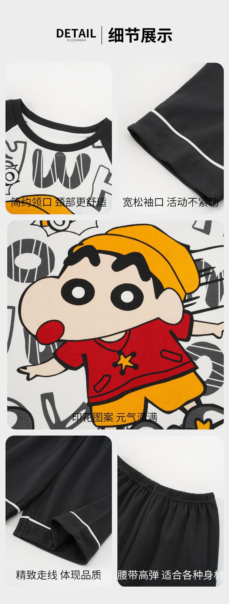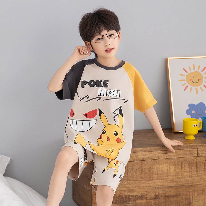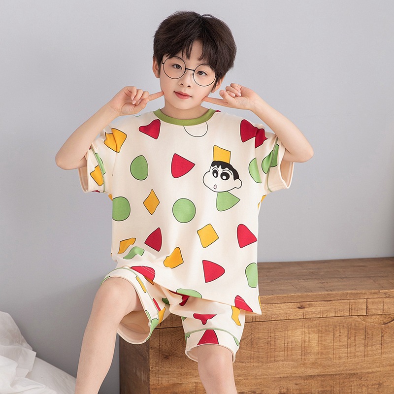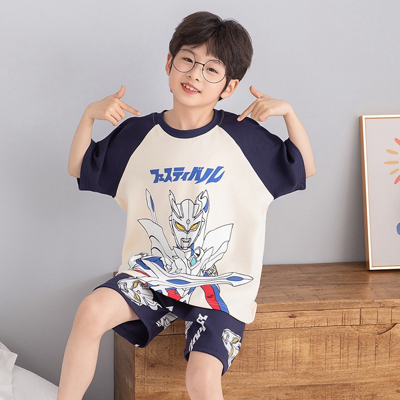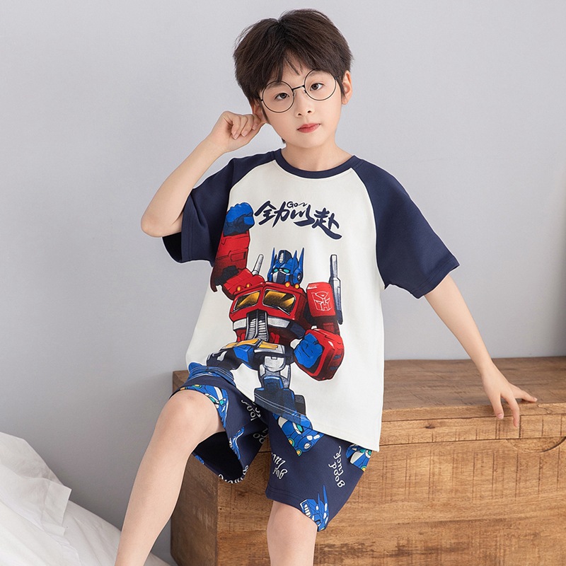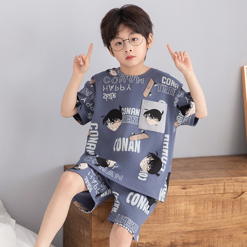 소년 잠옷 여름 라운드 넥 만화 캐주얼 면화 반팔 얇은 중대형 어린이 및 청소년 가정복은 밖에서 착용 가능