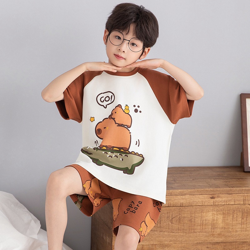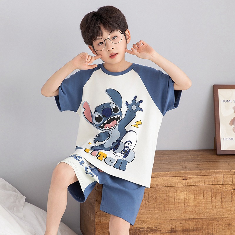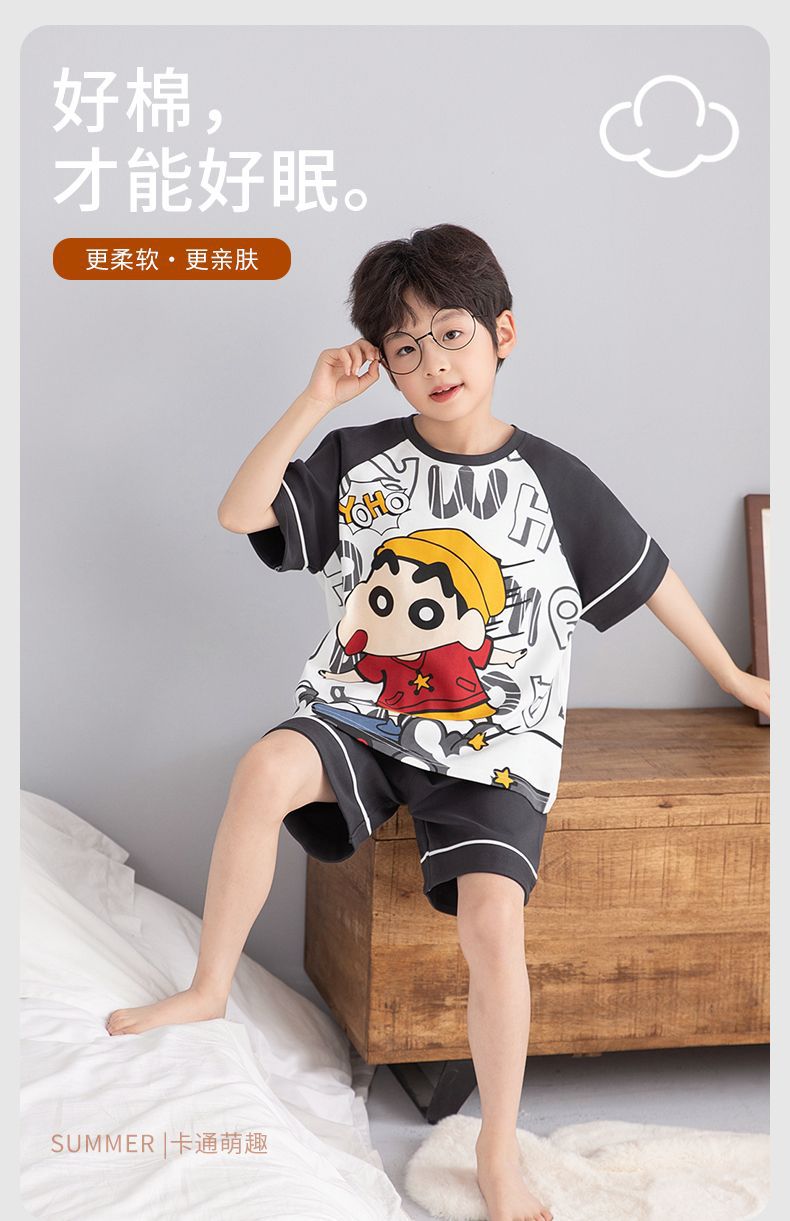 소년 잠옷 여름 라운드 넥 만화 캐주얼 면화 반팔 얇은 중대형 어린이 및 청소년 가정복은 밖에서 착용 가능스토어 가기