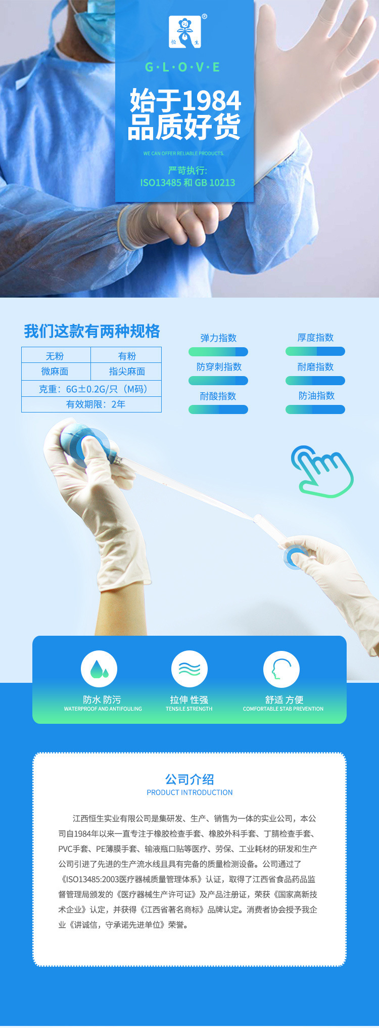 Hengsheng 일회용 의료용 고무 검사 장갑 1 쌍 멸균 파우더 프리 라텍스 보호 파우더 프리 장갑
