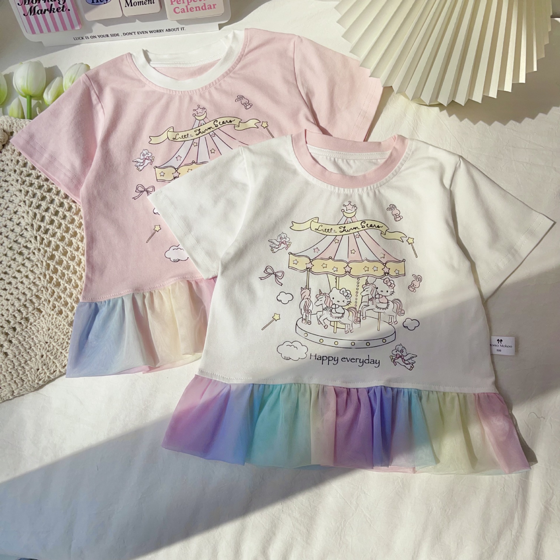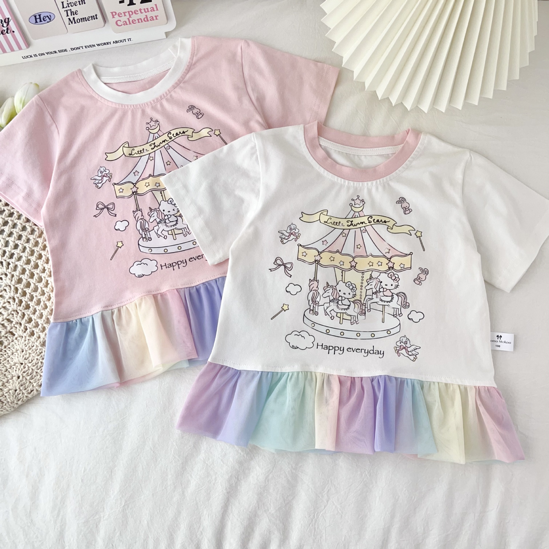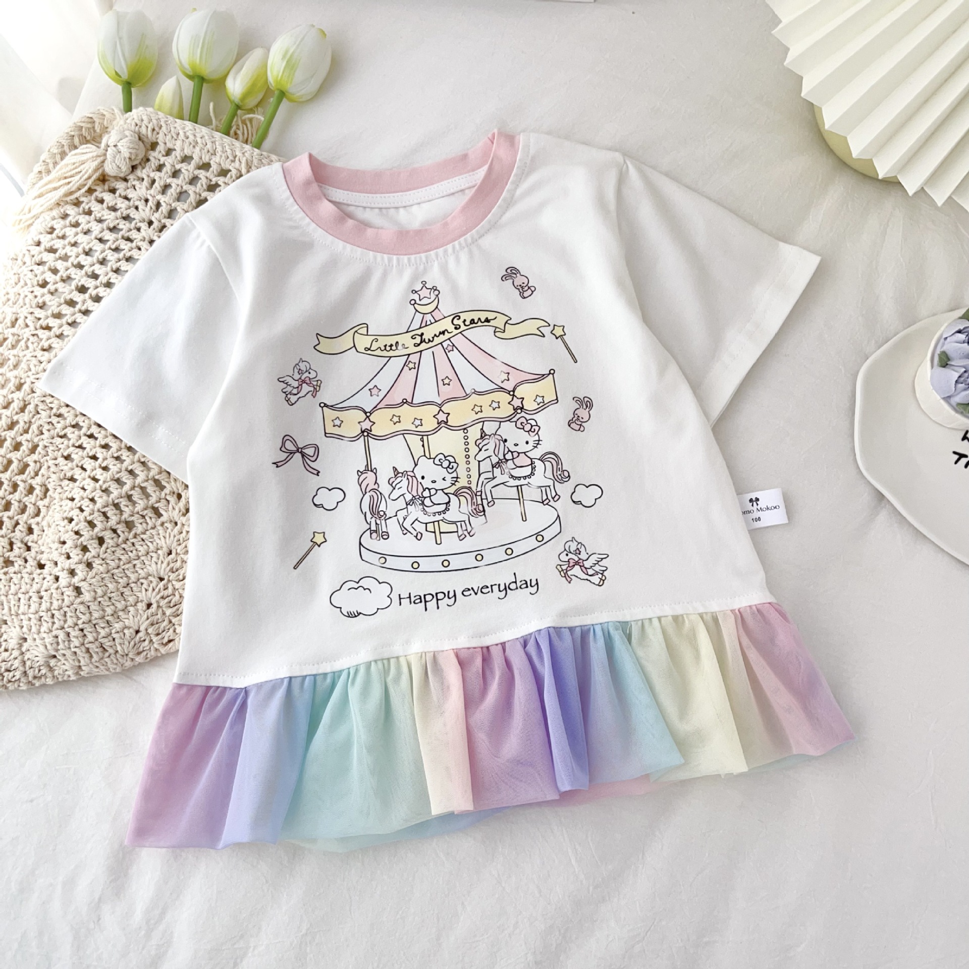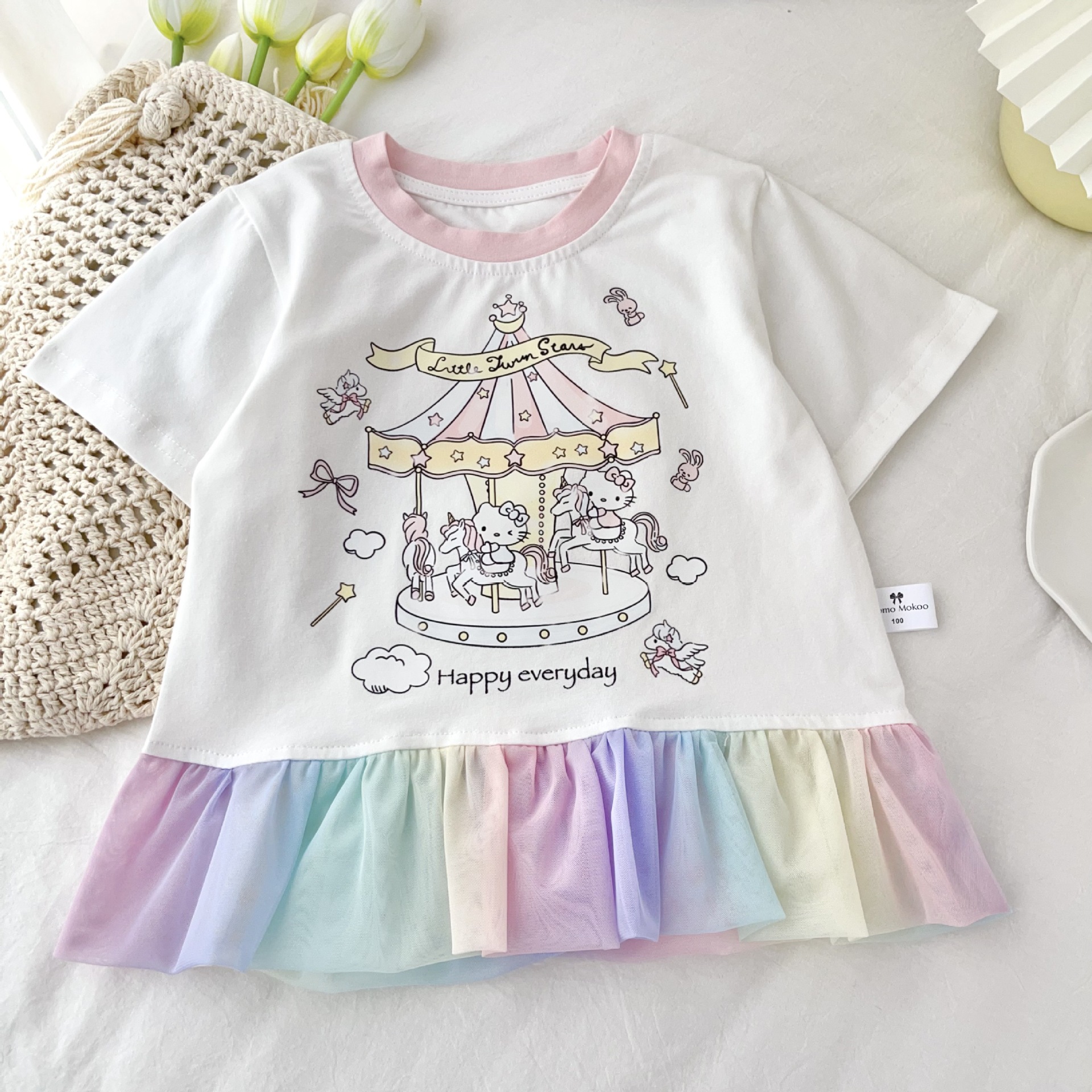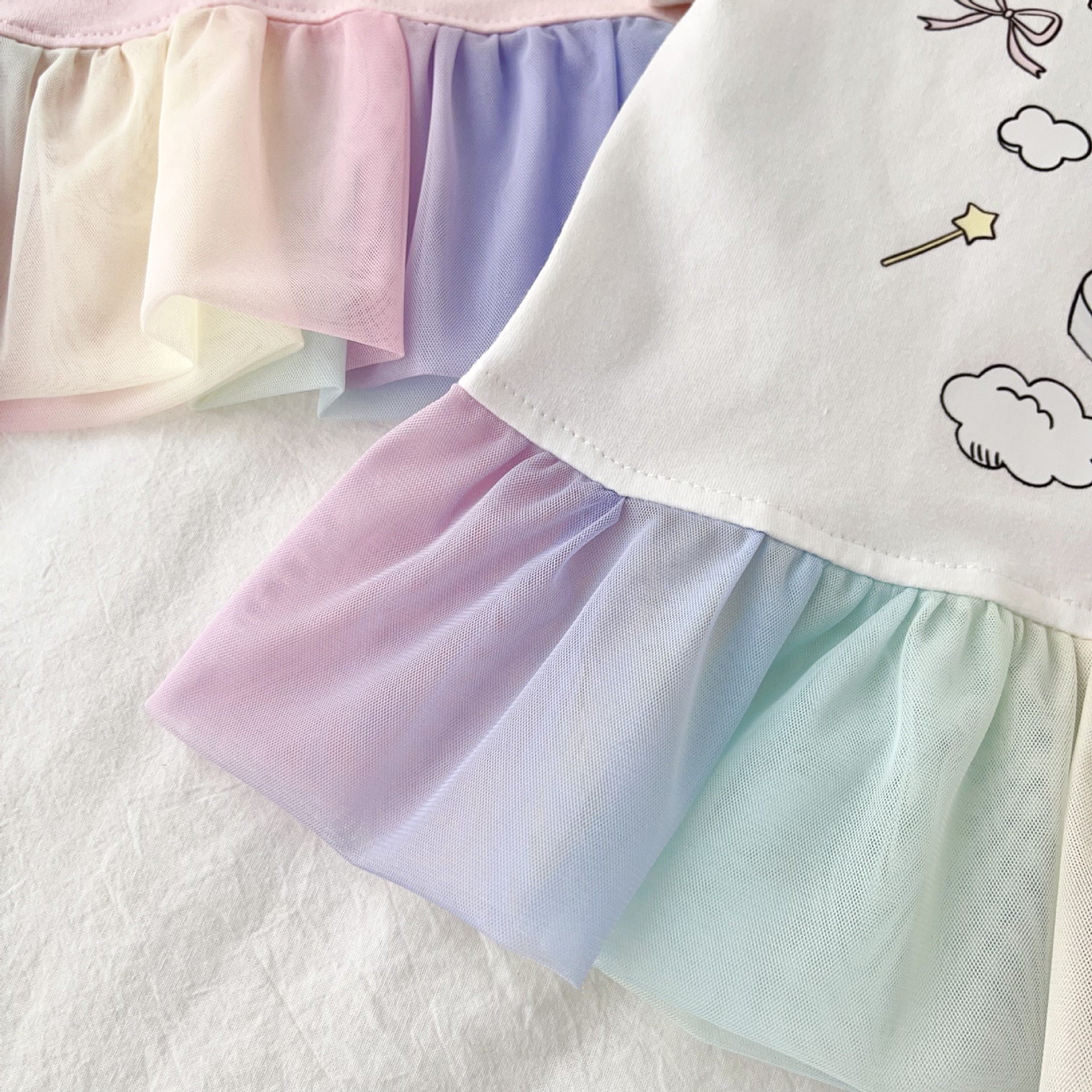 [95 면 라이크라] 여자 티셔츠 2025 여름 새 어린이 탑 귀여운 인쇄 무지개 치마 짧은 소매스토어 가기