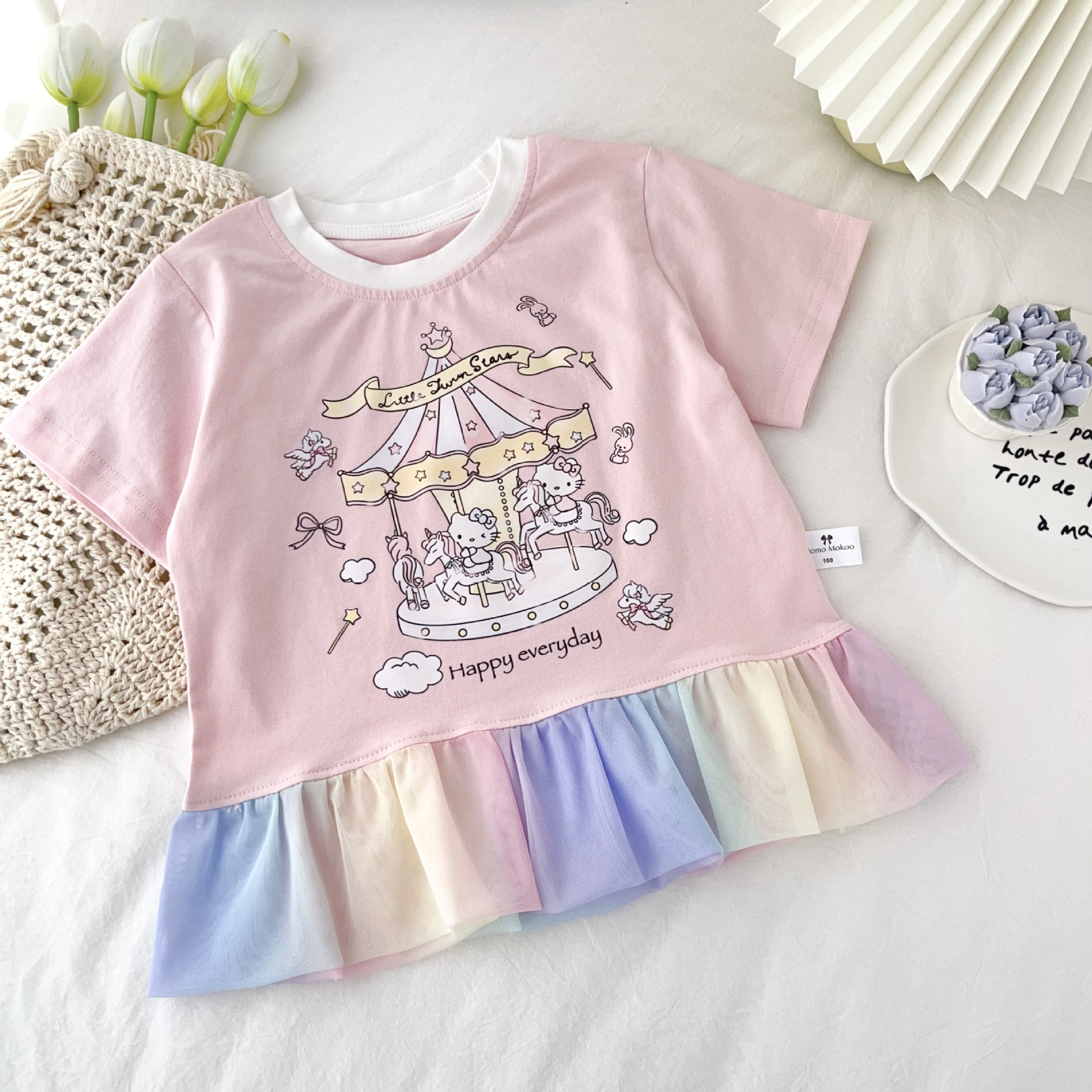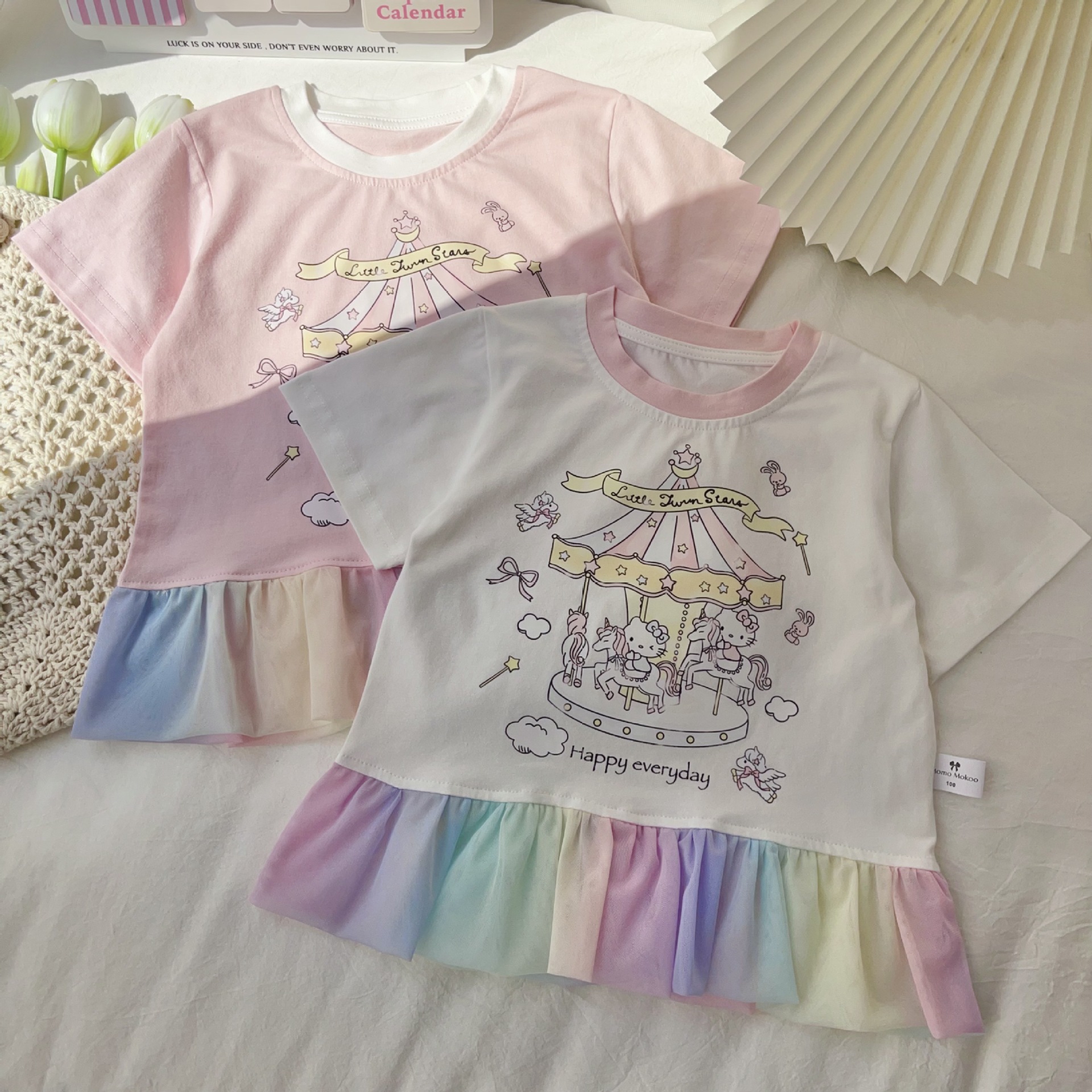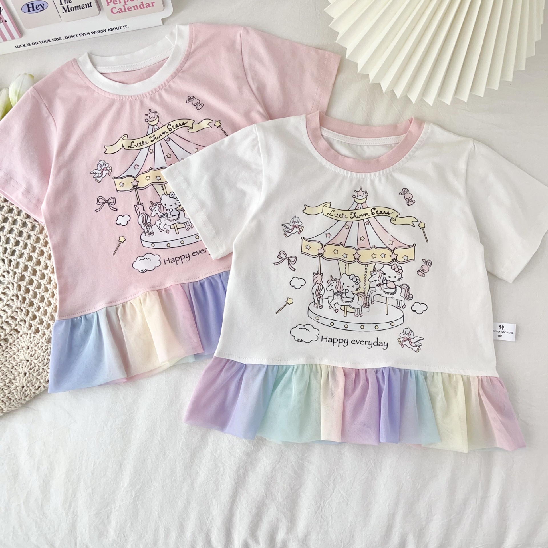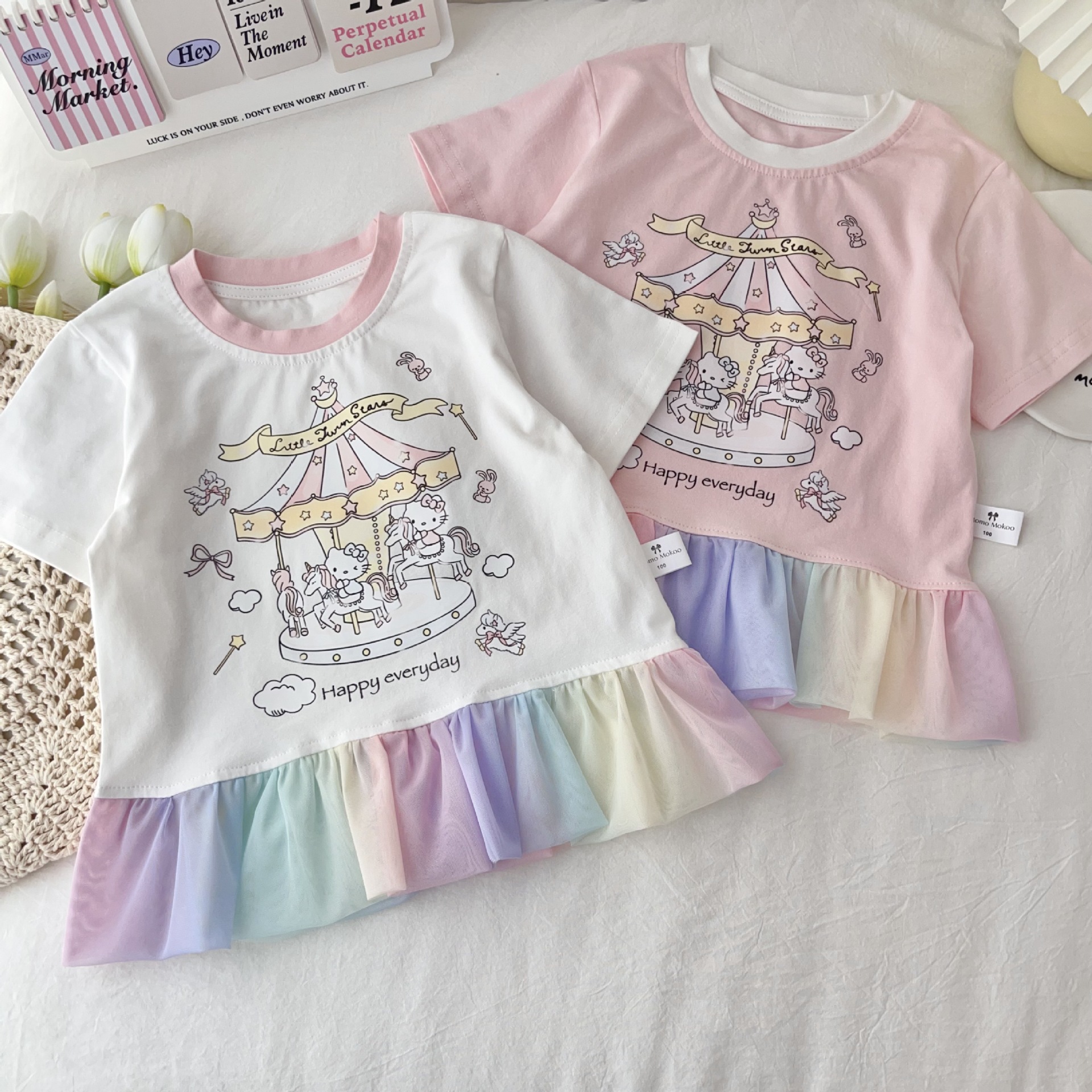 [95 면 라이크라] 여자 티셔츠 2025 여름 새 어린이 탑 귀여운 인쇄 무지개 치마 짧은 소매스토어 가기