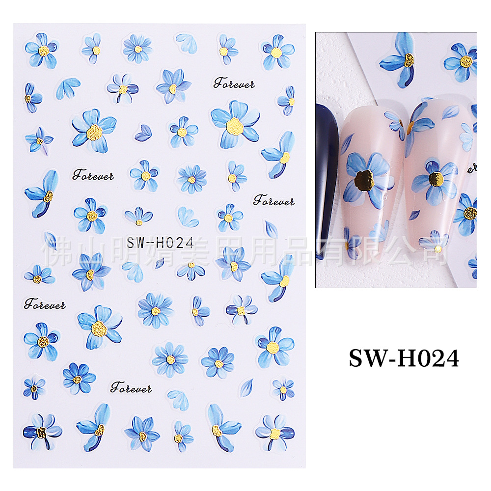2025 새로운 네일 아트 스티커 ins 스타일 크로스 보더 핫 스탬핑 봄과 여름 벚꽃 일본식 파란색 꽃 접착 네일 스티커