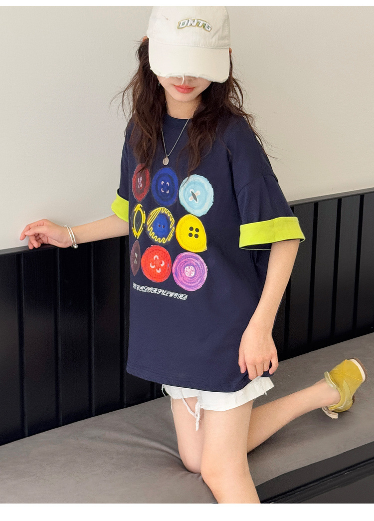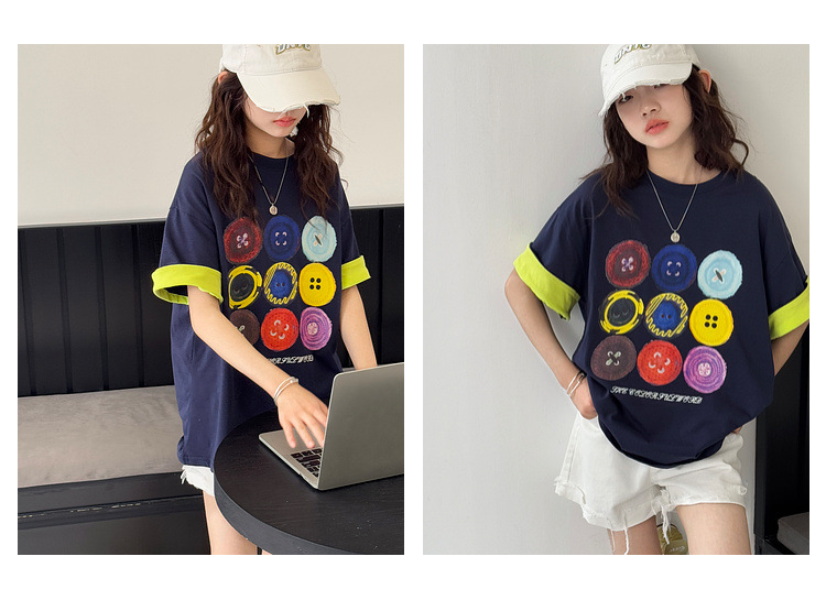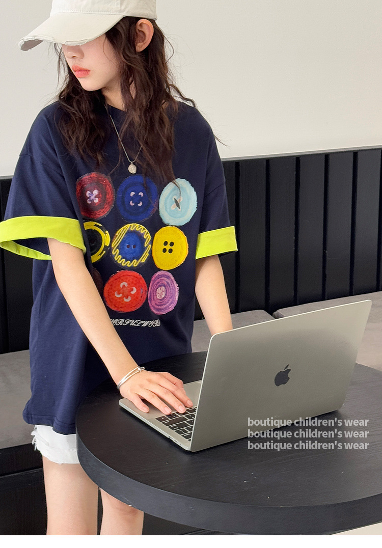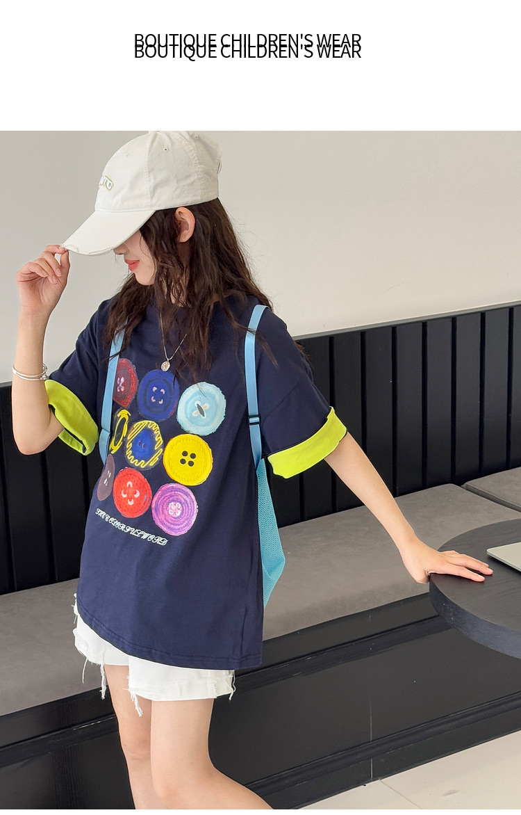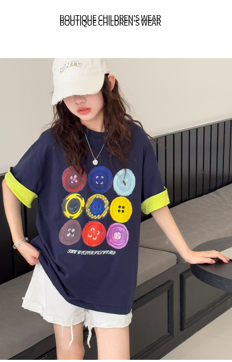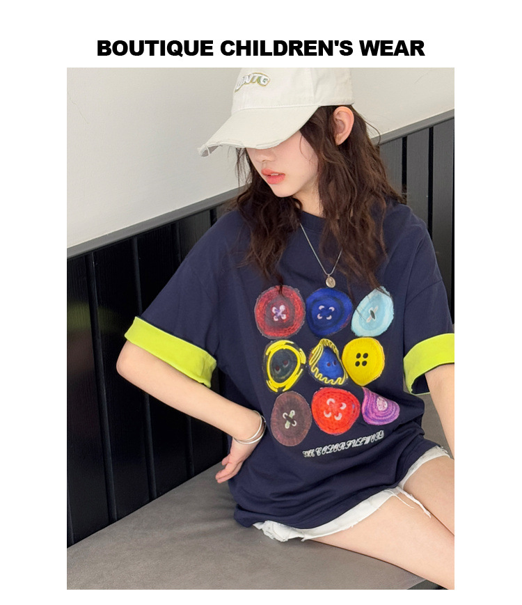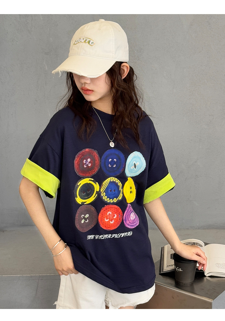 여자 반팔 티셔츠 어린이 느슨한 캐주얼 탑 여름 새로운 스타일 2025 소녀 유행 대비 컬러 옷 유행스토어 가기