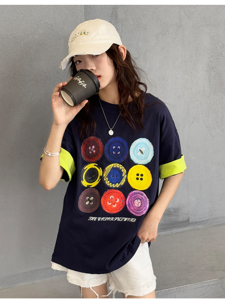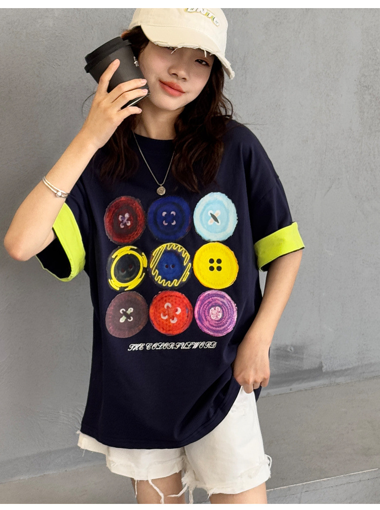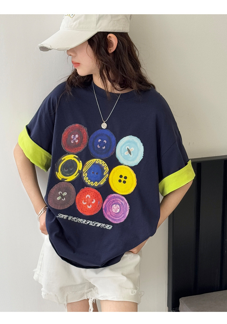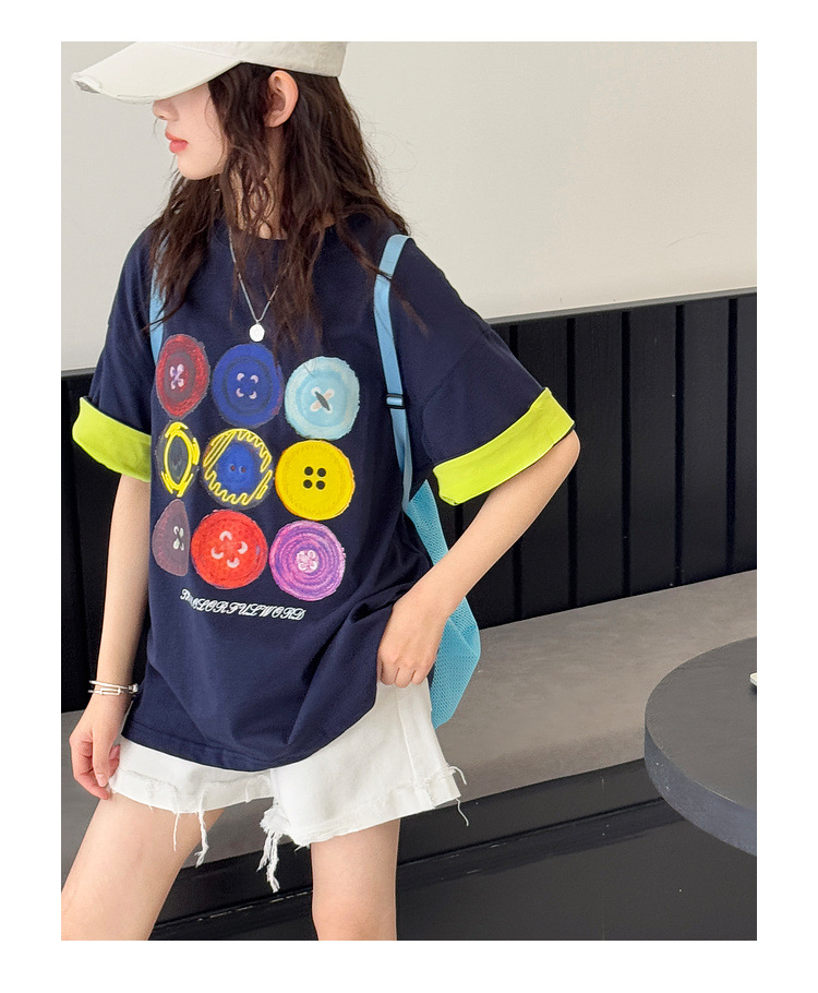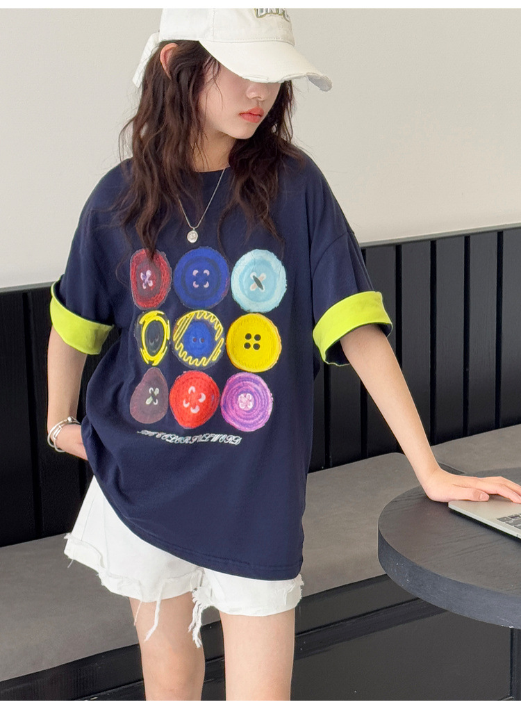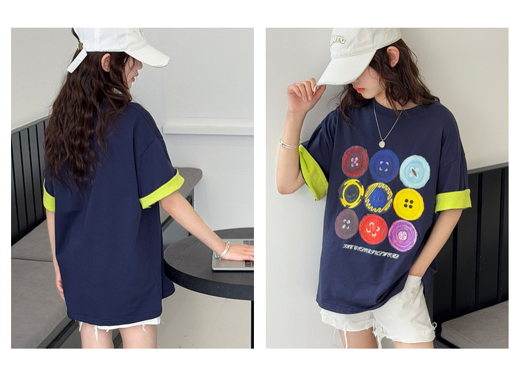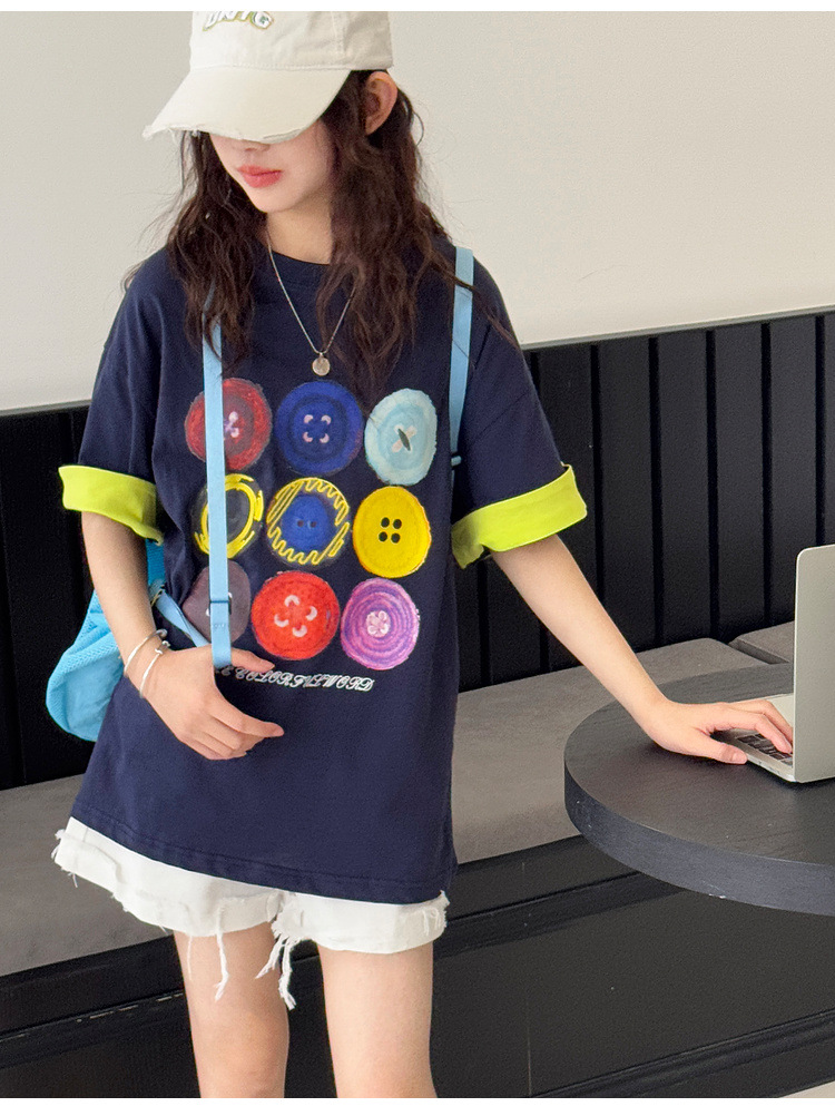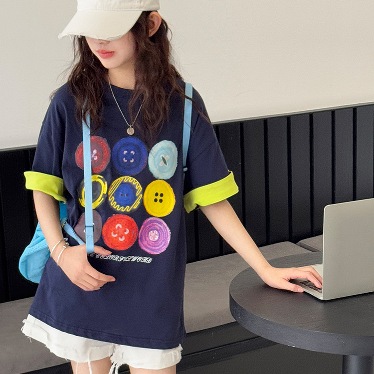 여자 반팔 티셔츠 어린이 느슨한 캐주얼 탑 여름 새로운 스타일 2025 소녀 유행 대비 컬러 옷 유행스토어 가기