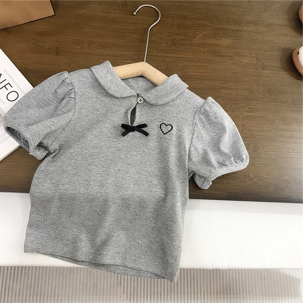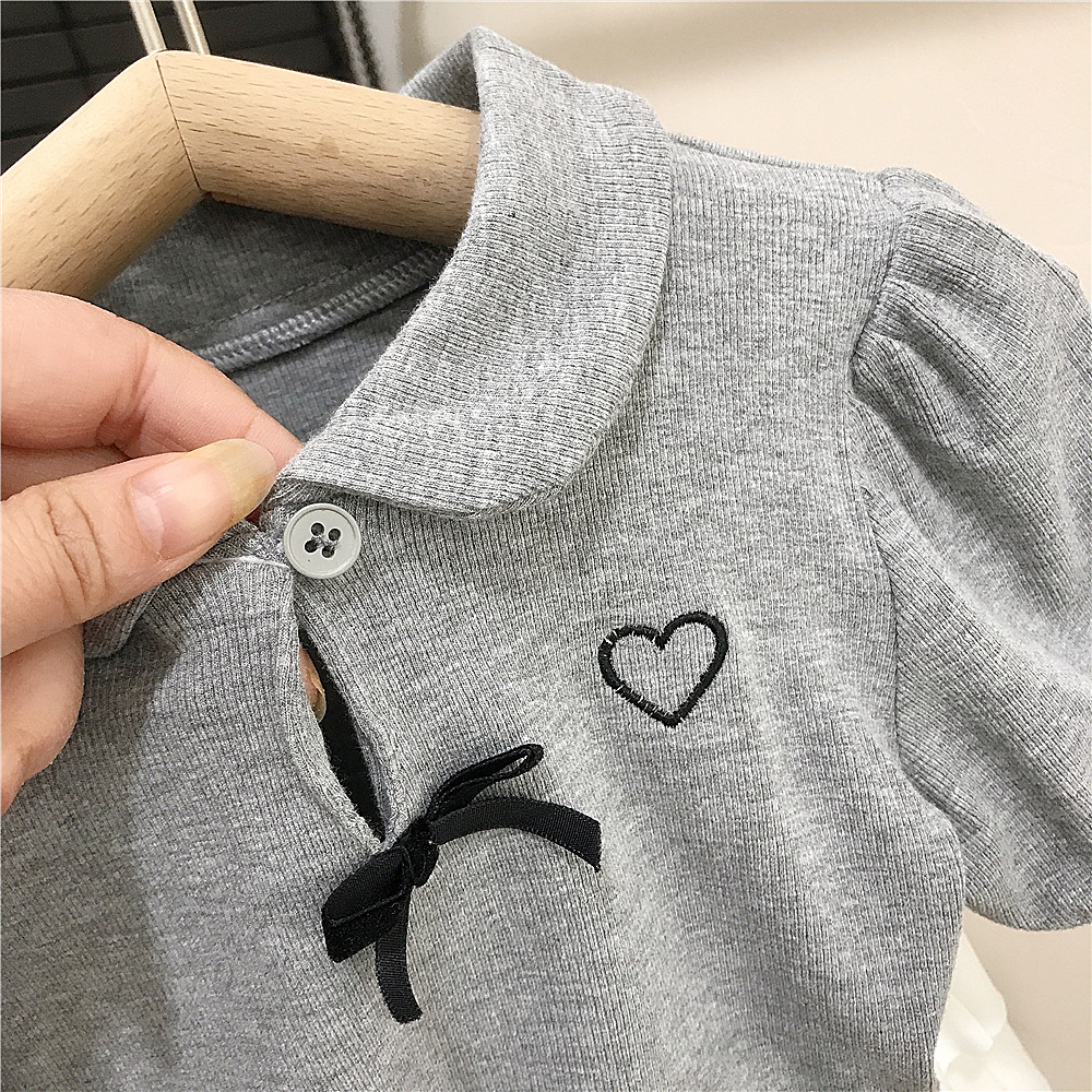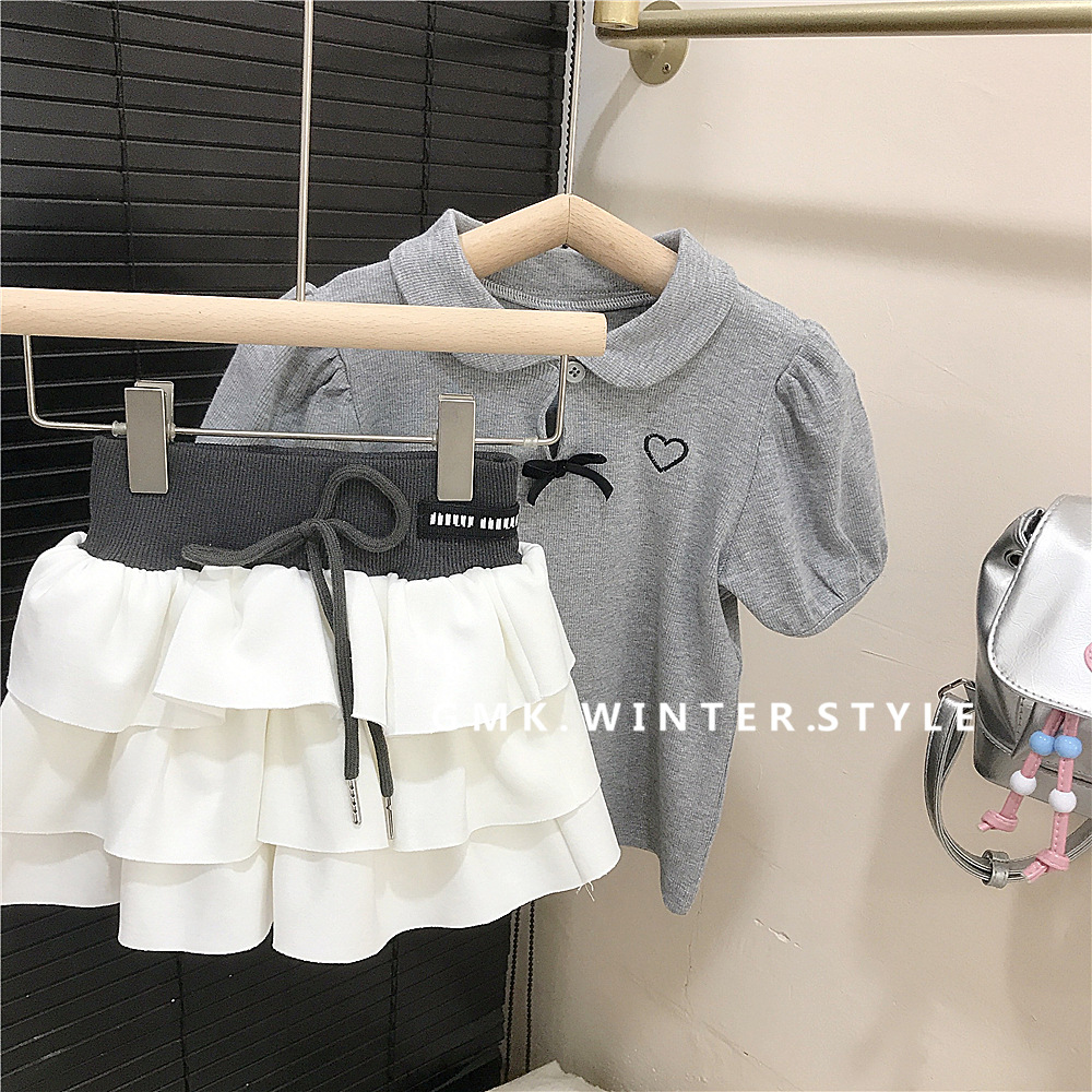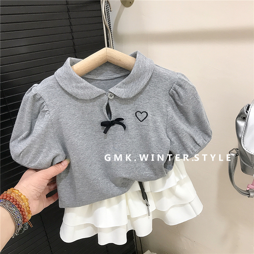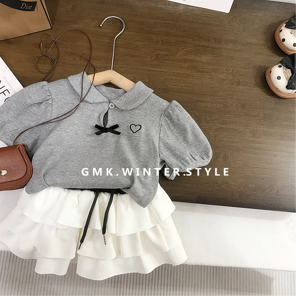 여름 소녀 퍼프 슬리브 짧은 소매베이스 셔츠 회색 인형 칼라 나비 티셔츠 최고 어린이 케이크 치마스토어 가기