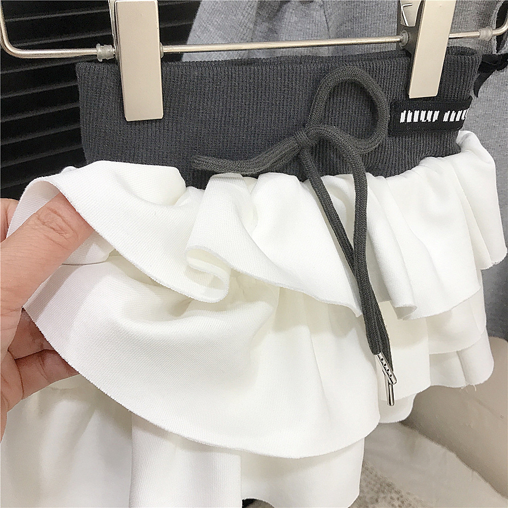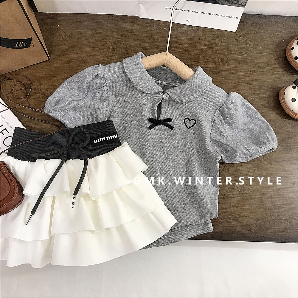 여름 소녀 퍼프 슬리브 짧은 소매베이스 셔츠 회색 인형 칼라 나비 티셔츠 최고 어린이 케이크 치마