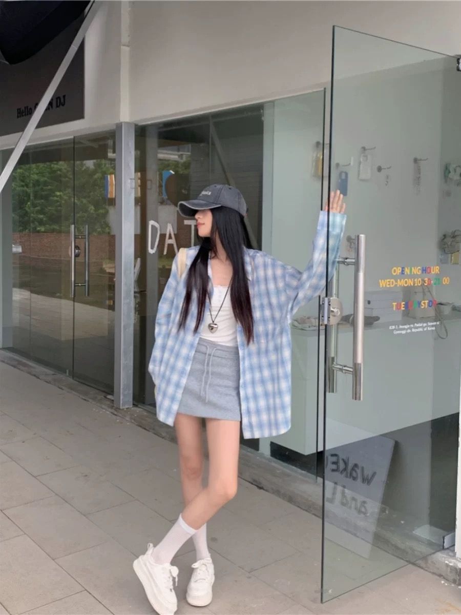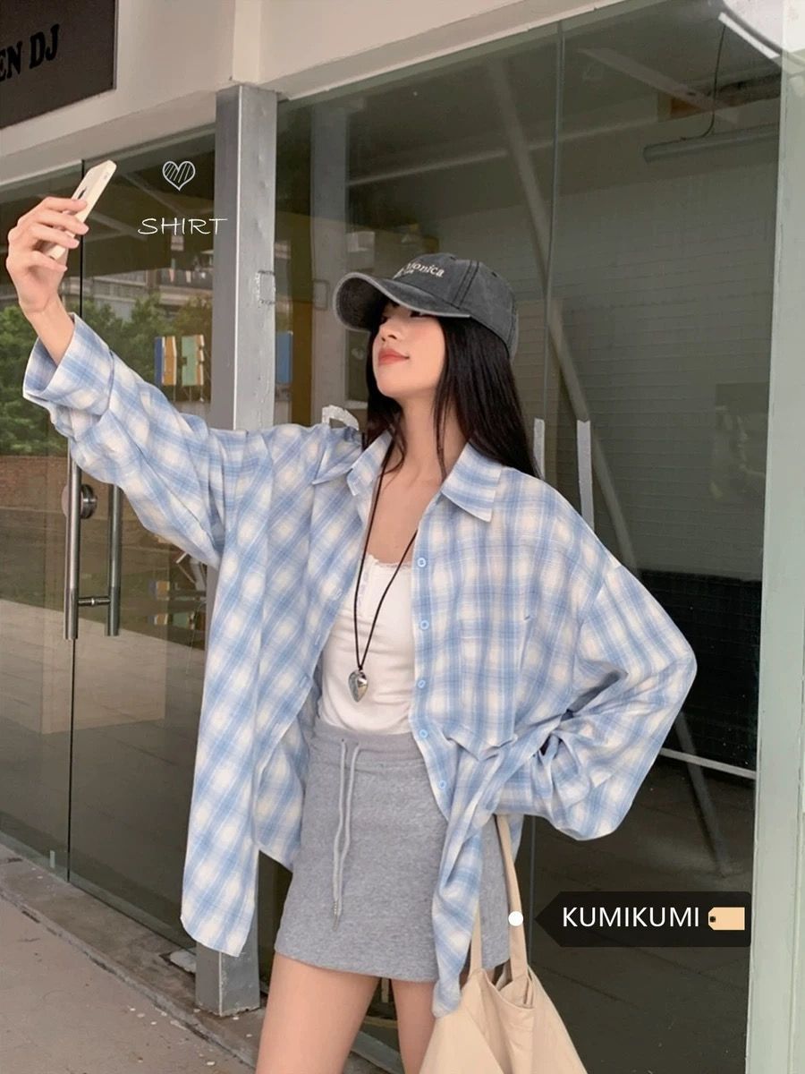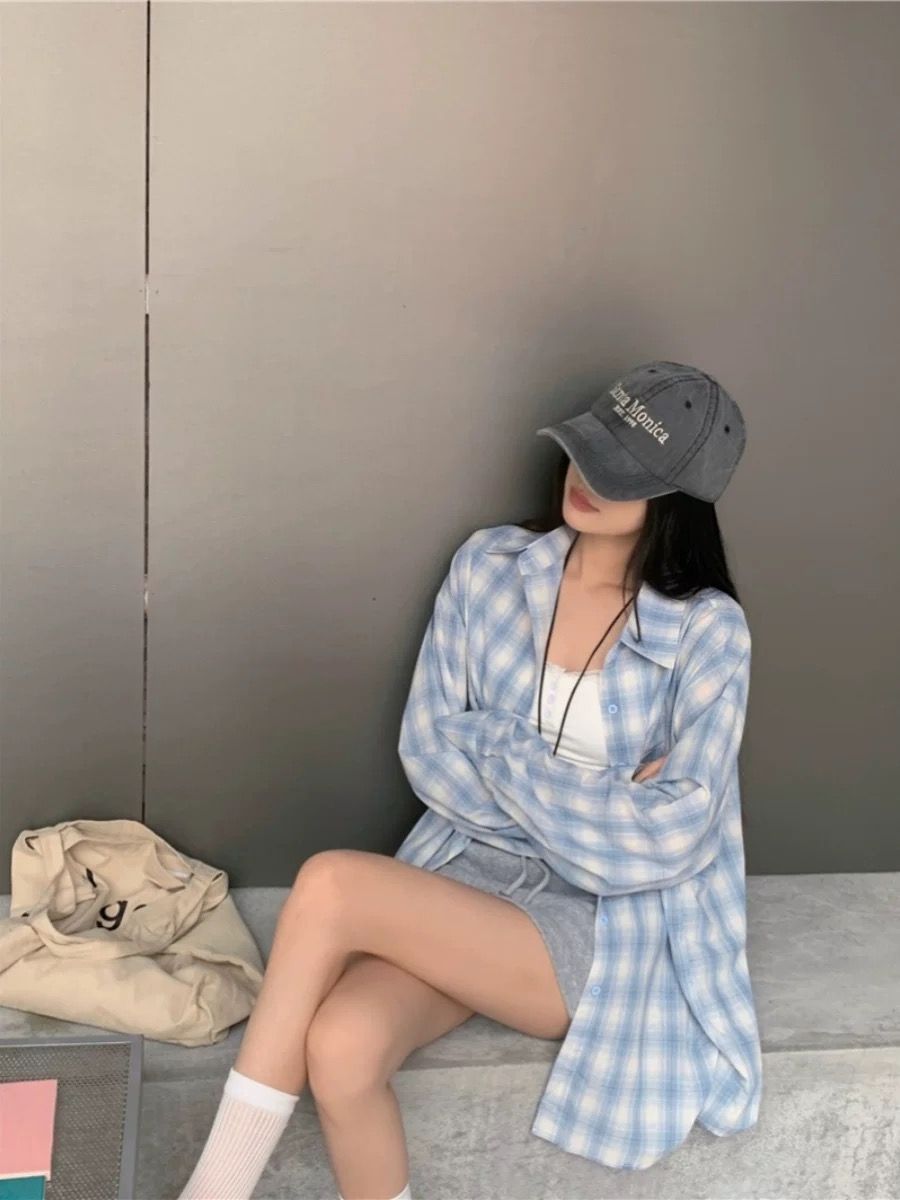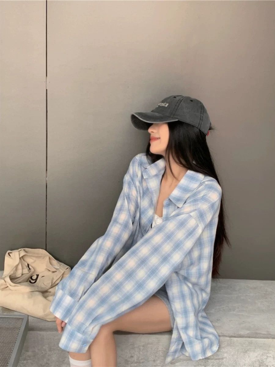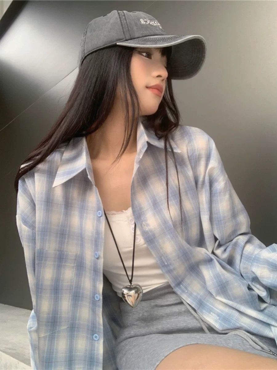 게으른 스타일 폴로 칼라 격자 무늬 긴팔 셔츠 여성의 여름 얇은 캐주얼 느슨한 태양 보호 셔츠 외부 라이닝 탑스토어 가기