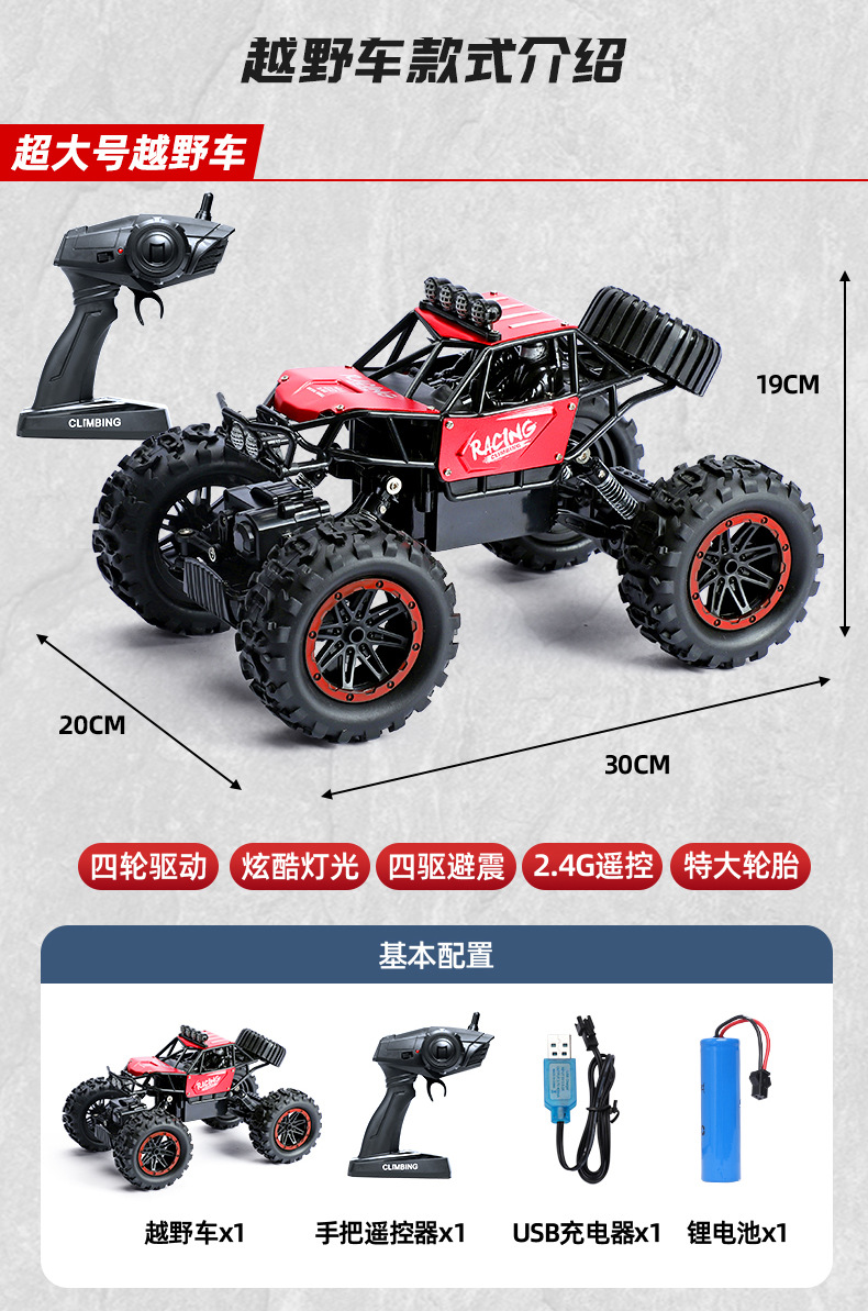 • 초대형 [Alloy-Supreme Red] 시계 리모컨 + 사륜구동 오프로드 + 총형 리모컨(초장거리 배터리 수명 + 업그레이드된 충돌 방지) + 대형 44개 4개