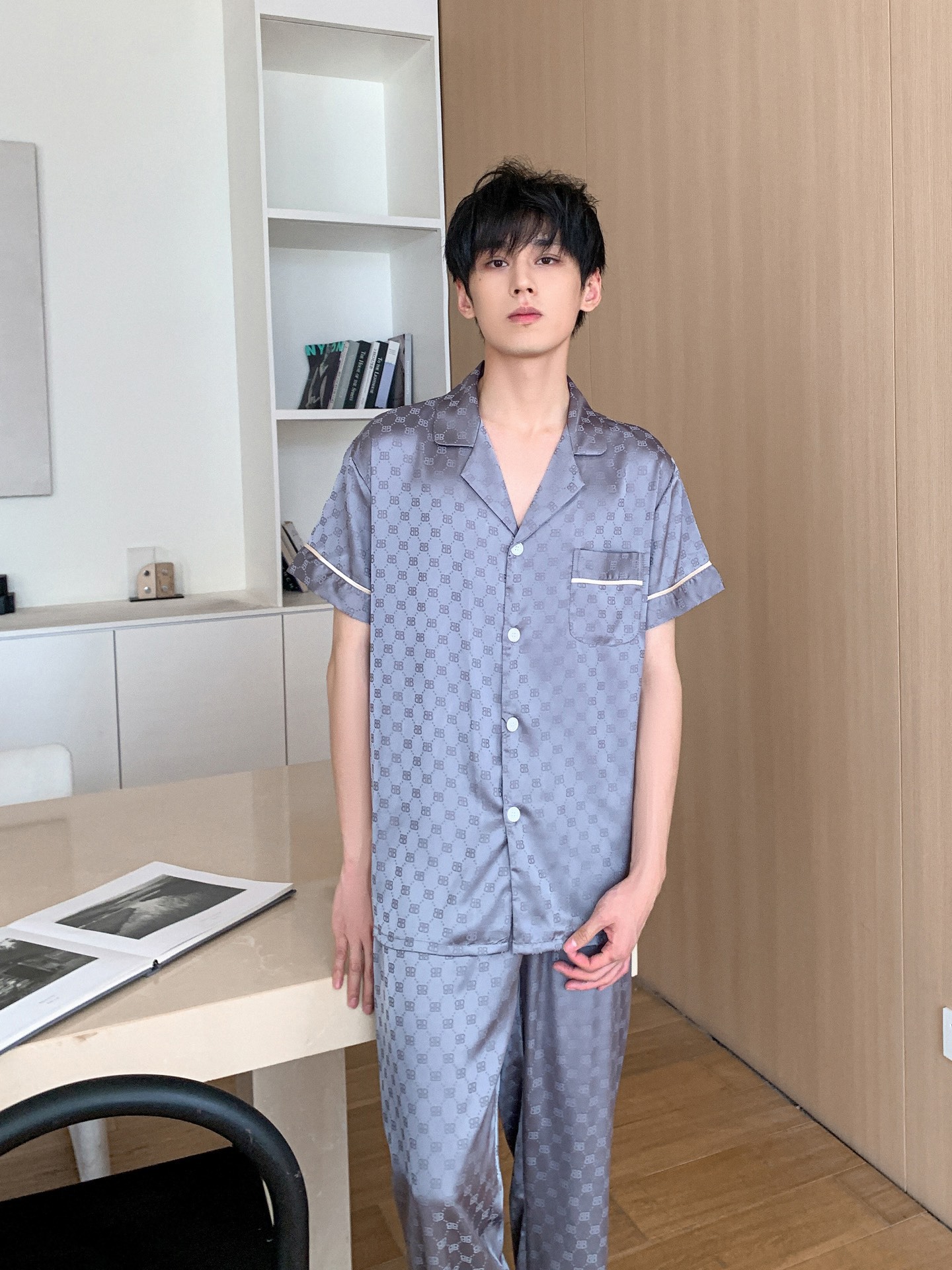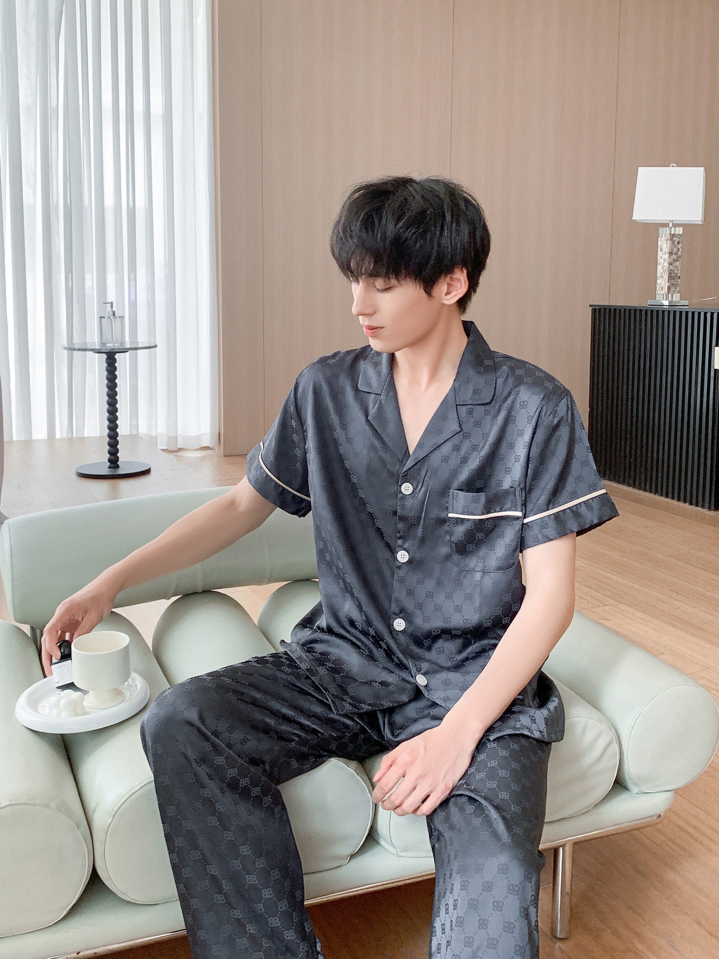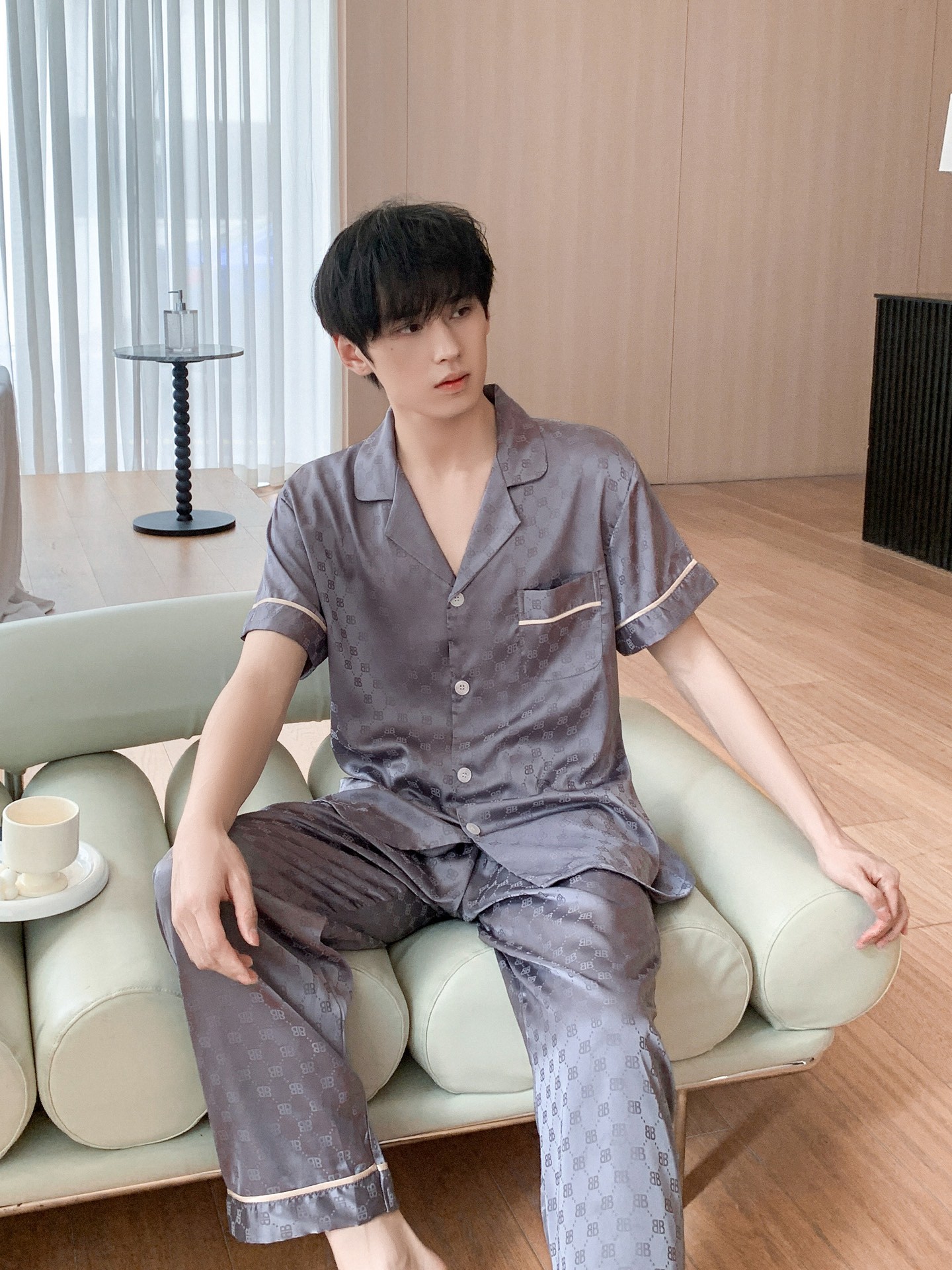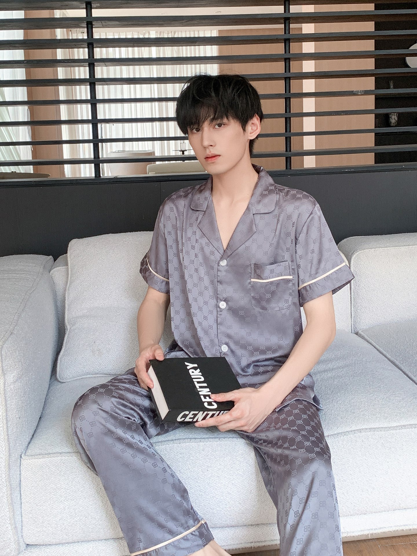 2025 새로운 여름 얼음 실크 잠옷 남자 인터넷 연예인 대형 얼음과 눈 실크 반팔 겉옷 한국 스타일 남자 가정 의류스토어 가기