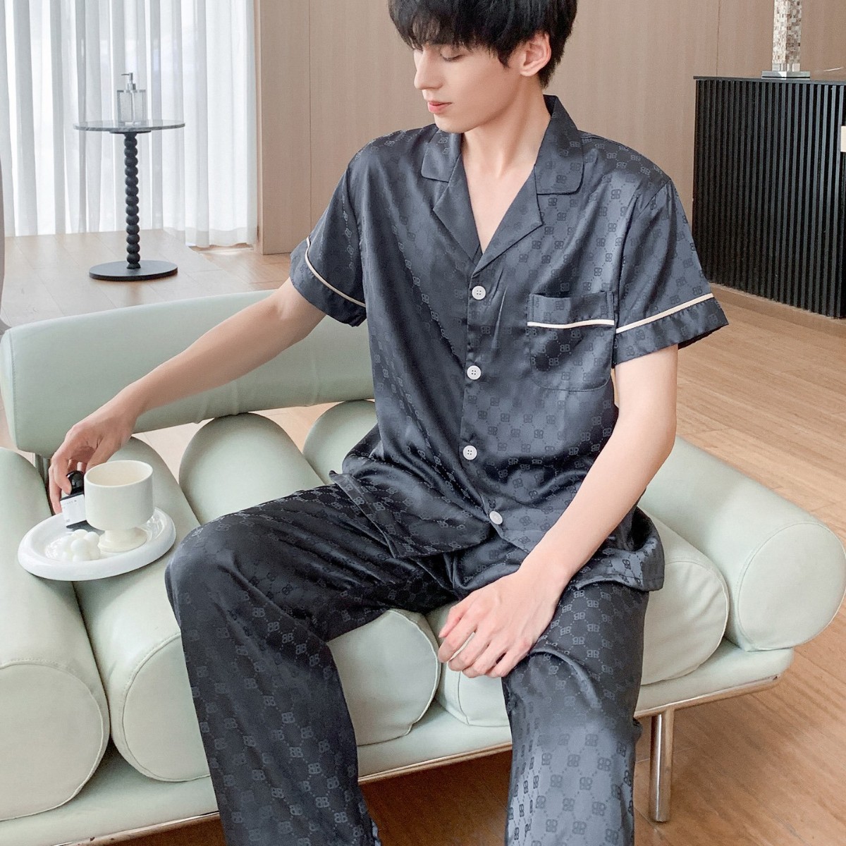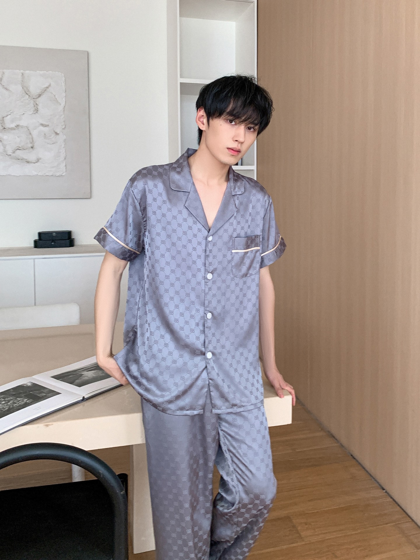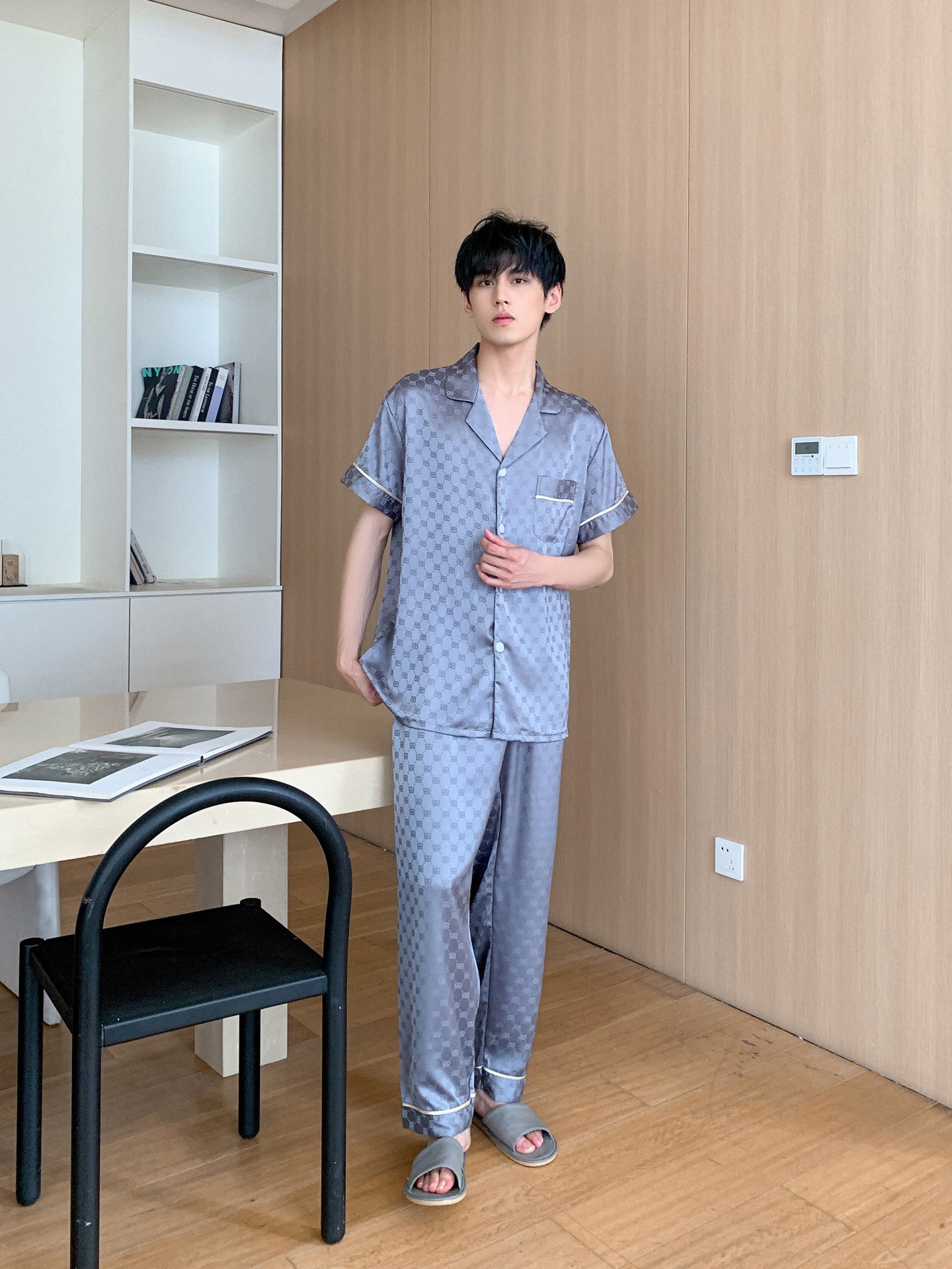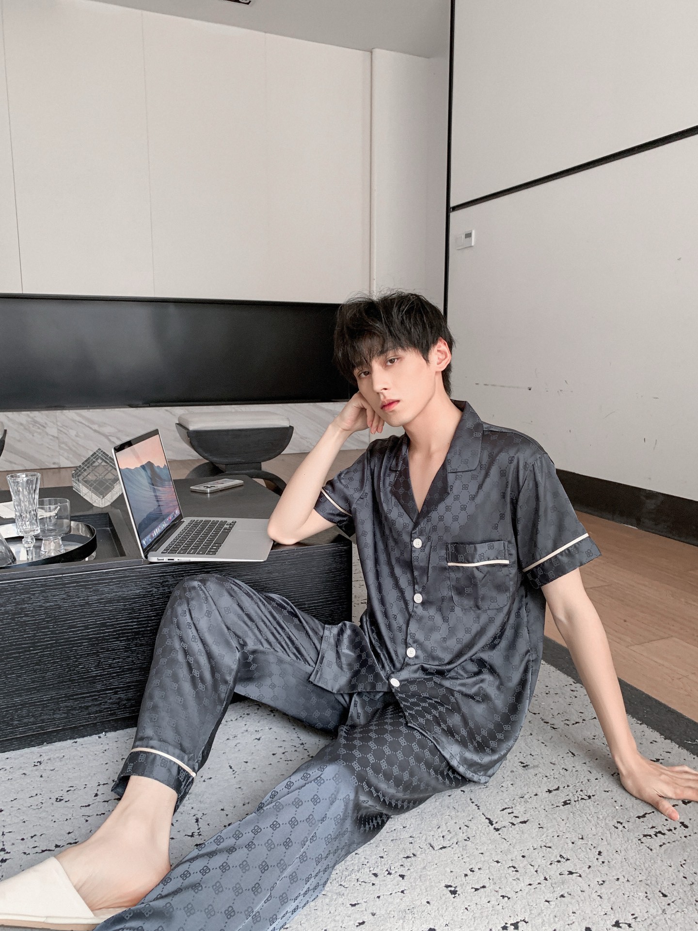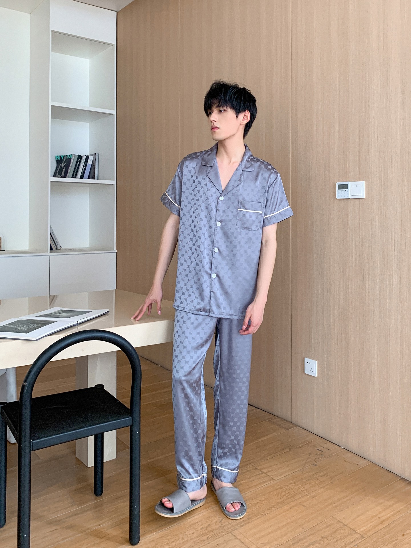 2025 새로운 여름 얼음 실크 잠옷 남자 인터넷 연예인 대형 얼음과 눈 실크 반팔 겉옷 한국 스타일 남자 가정 의류스토어 가기