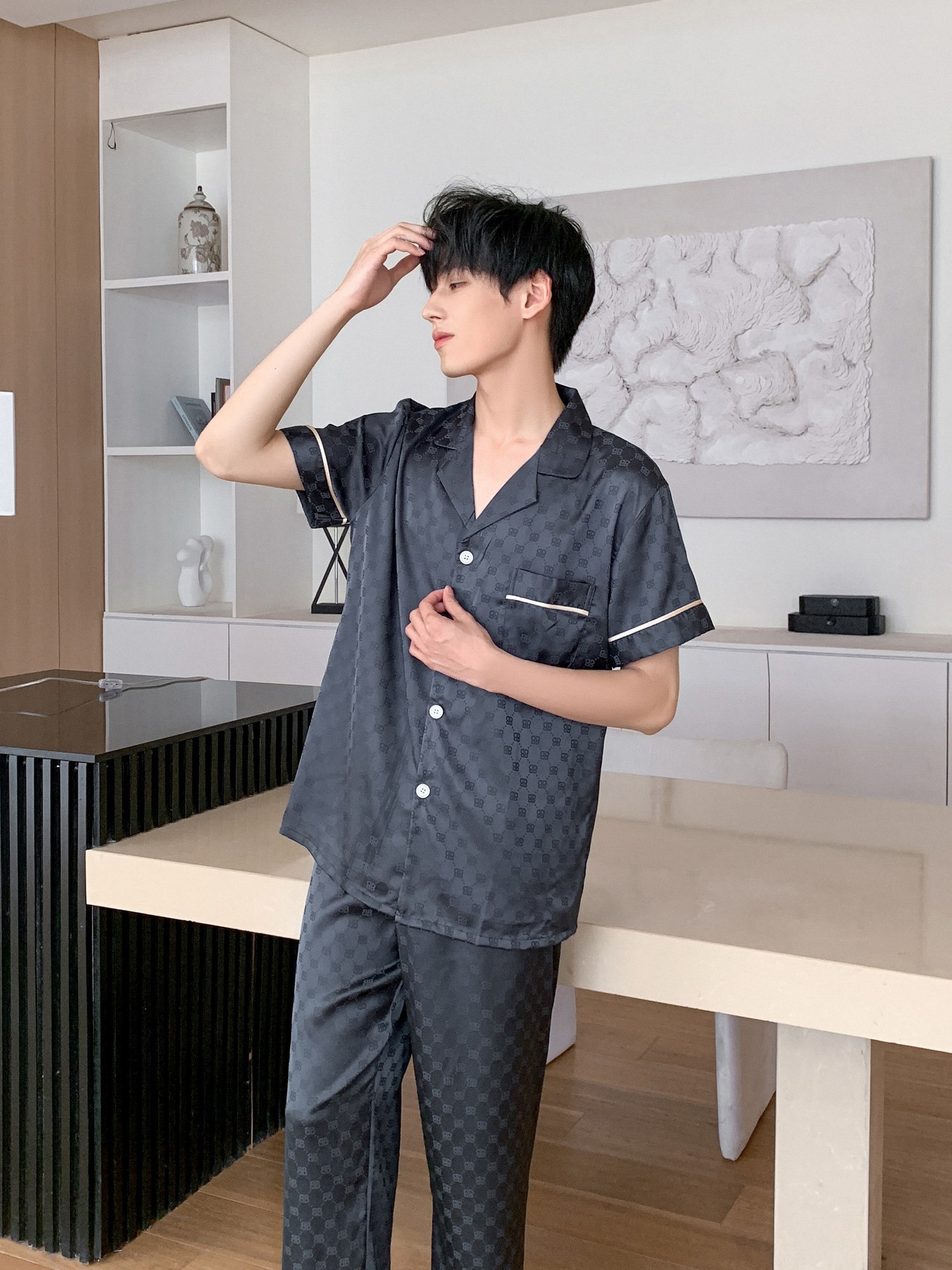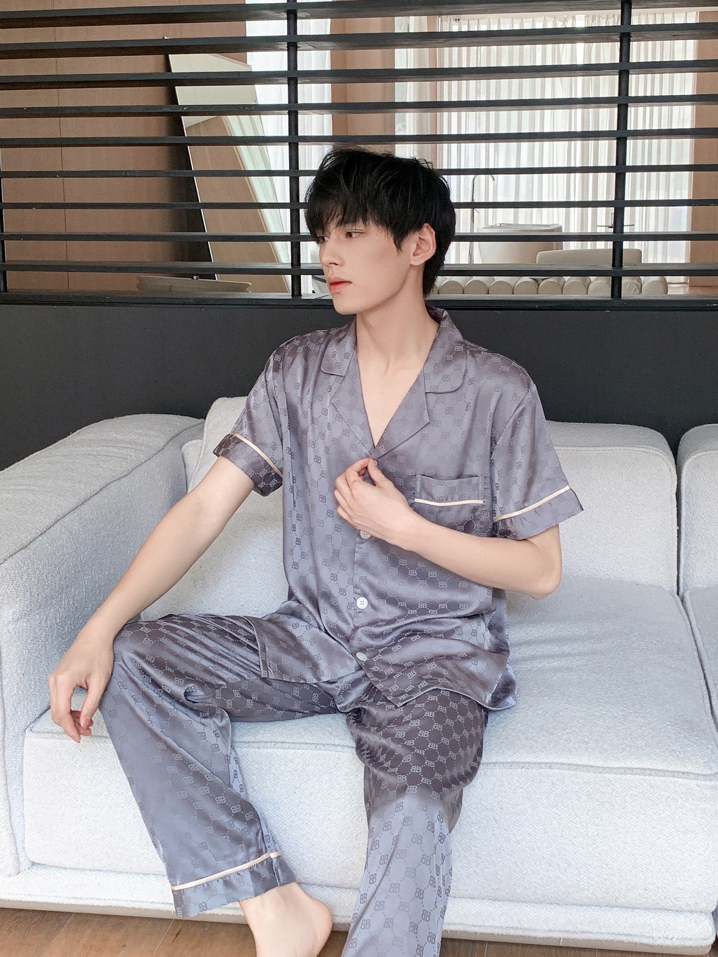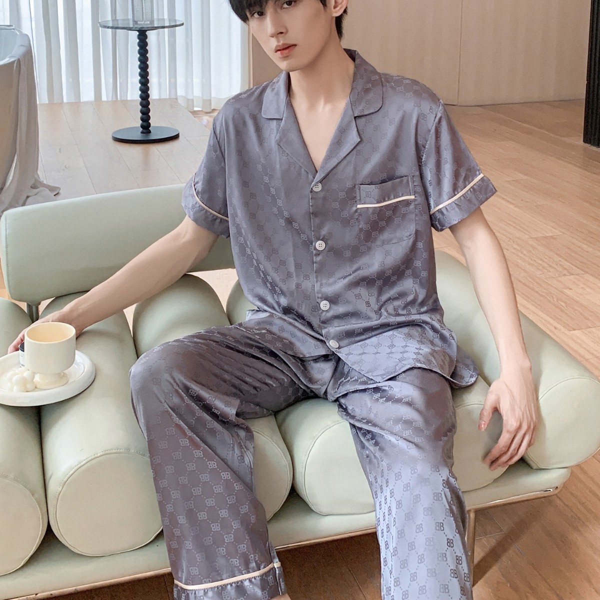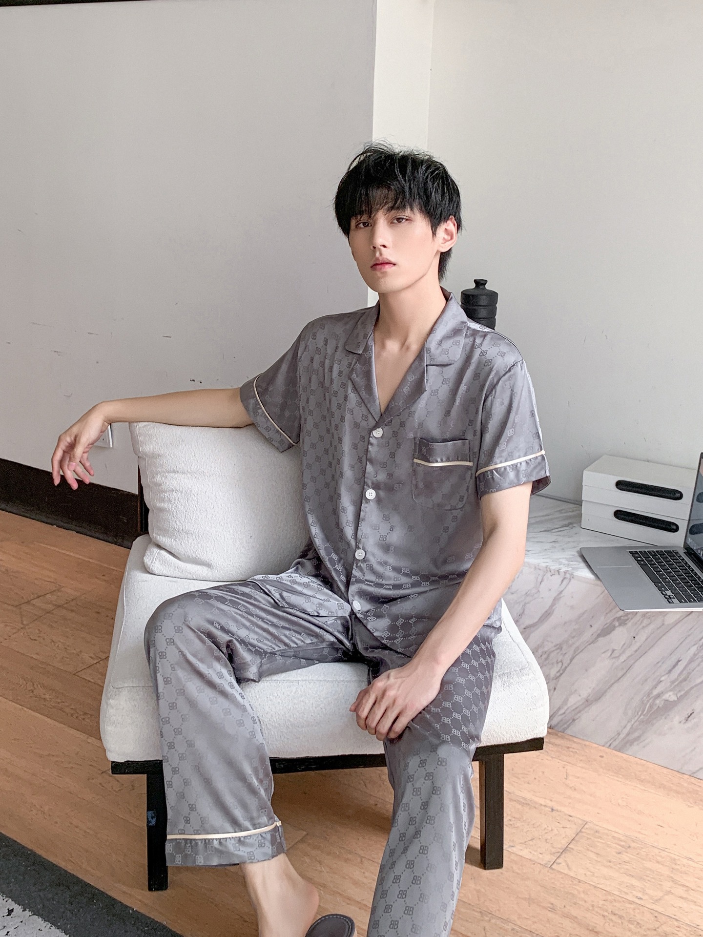 2025 새로운 여름 얼음 실크 잠옷 남자 인터넷 연예인 대형 얼음과 눈 실크 반팔 겉옷 한국 스타일 남자 가정 의류스토어 가기