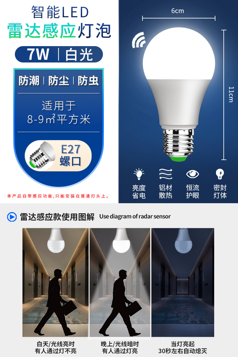 센서 전구 레이더 인체 감지 램프 적외선 인체 감지 계단 복도 LED 조명 제어 E27 나사형 레이더 센서스토어 가기