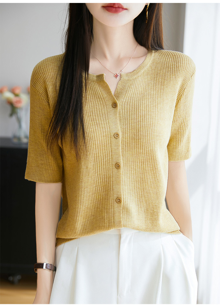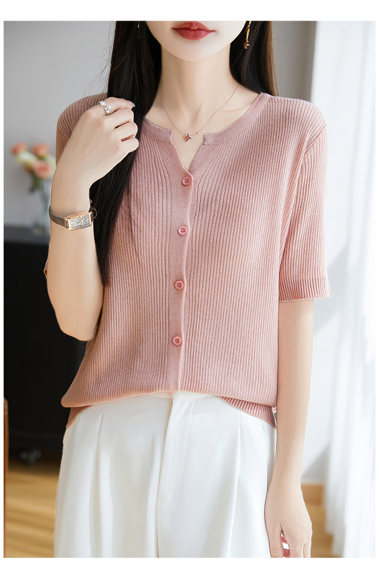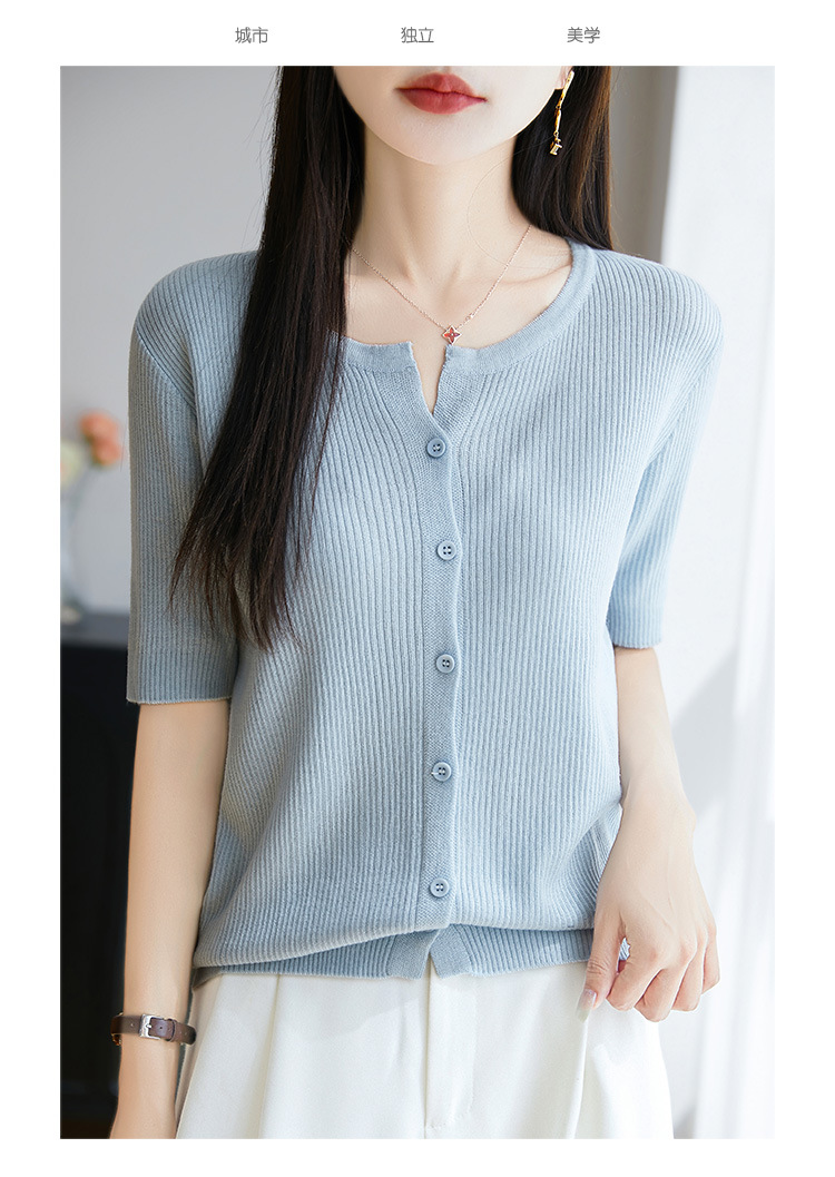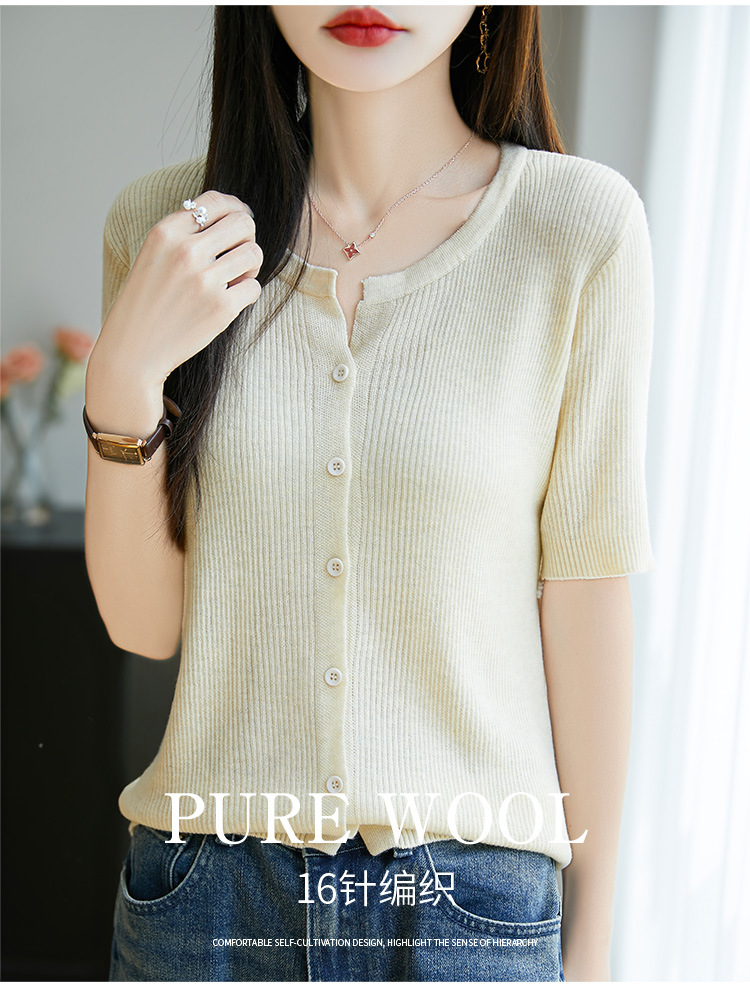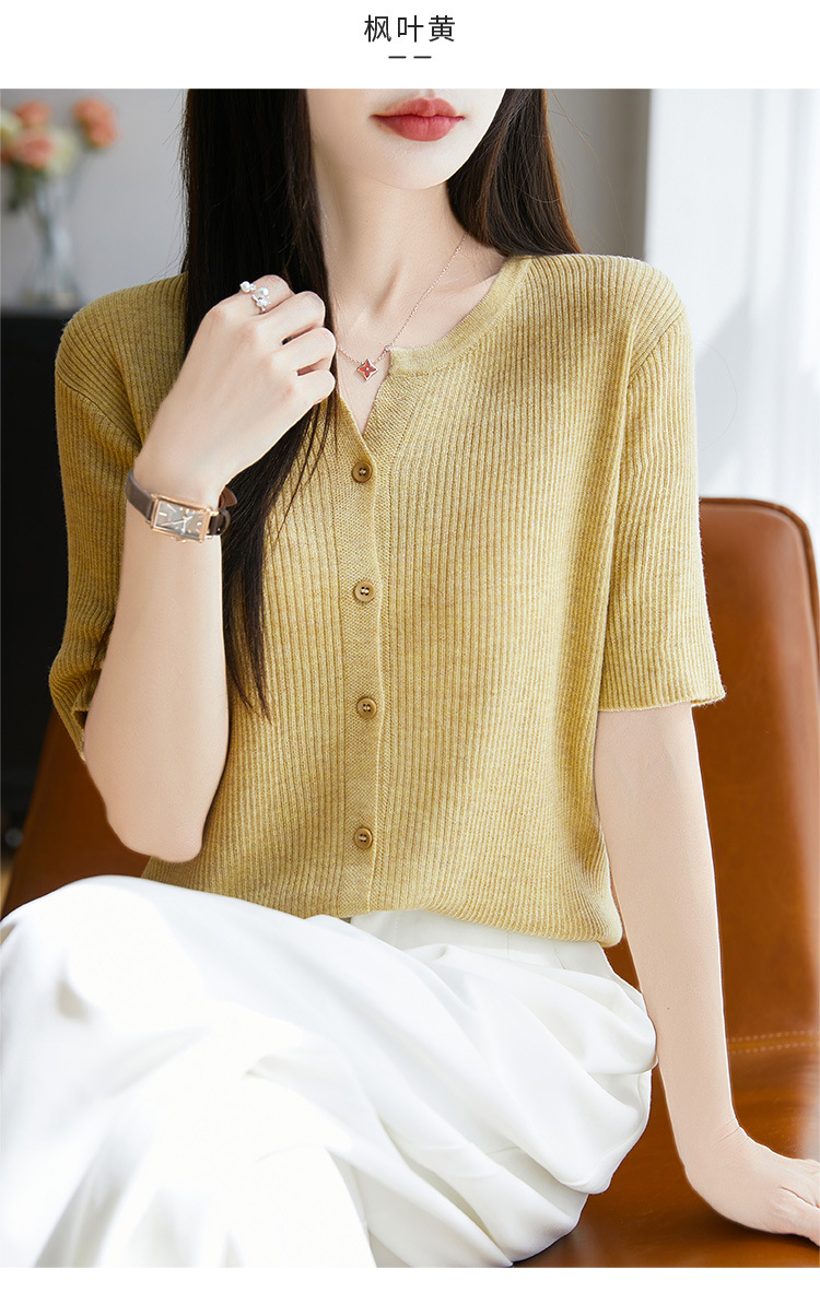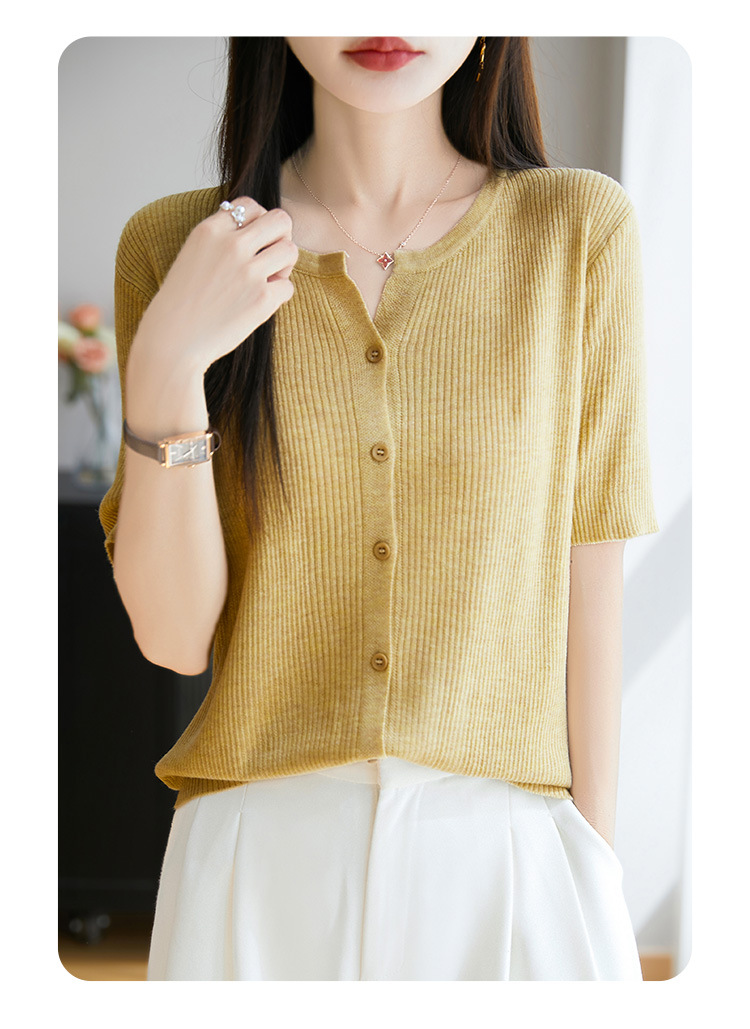 여름 얇고 시크한 작은 브이넥 워스티드 울 스웨터 여성용 솔리드 컬러 다용도 핏 싱글 브레스트 반소매스토어 가기