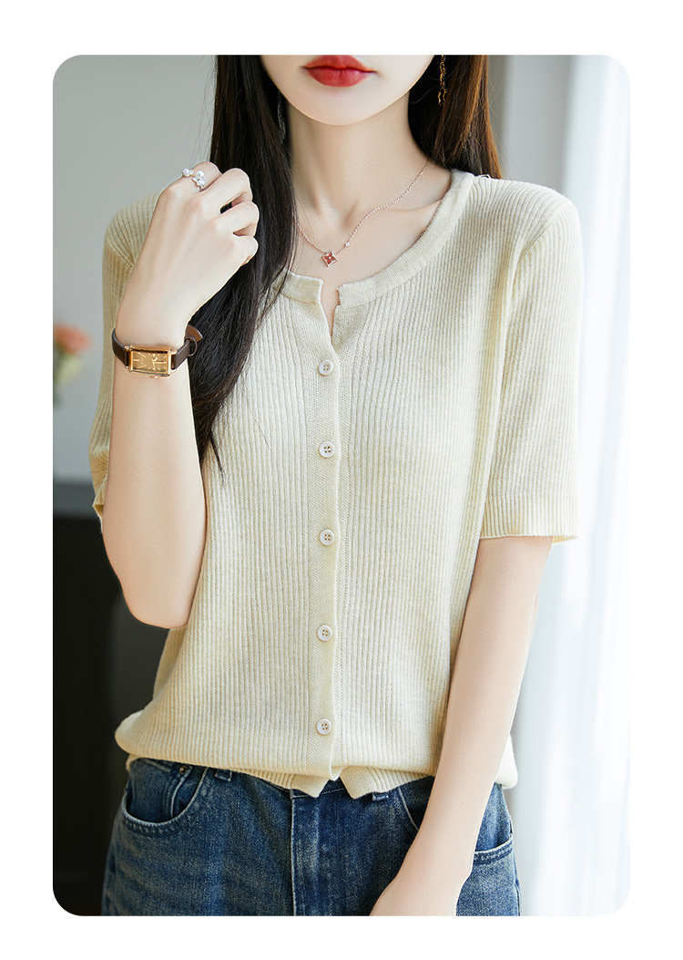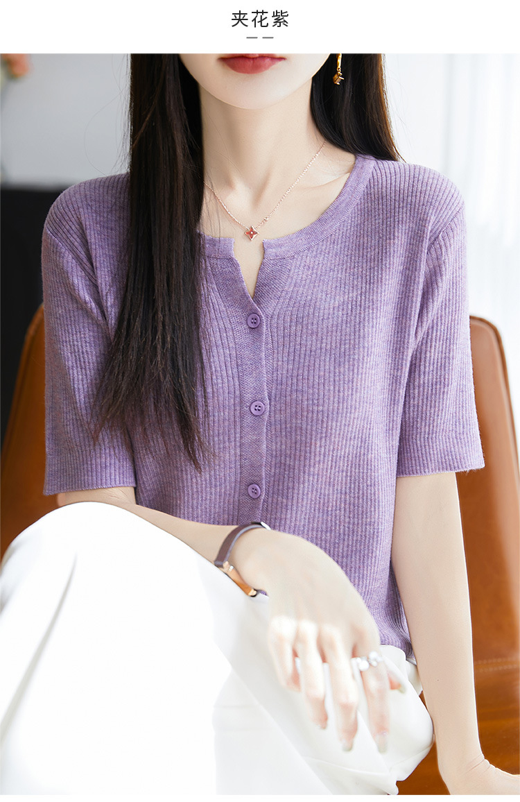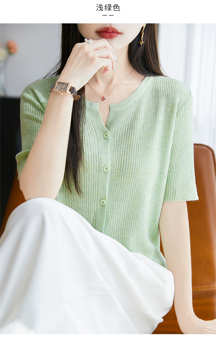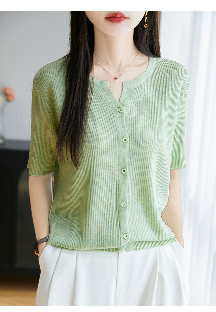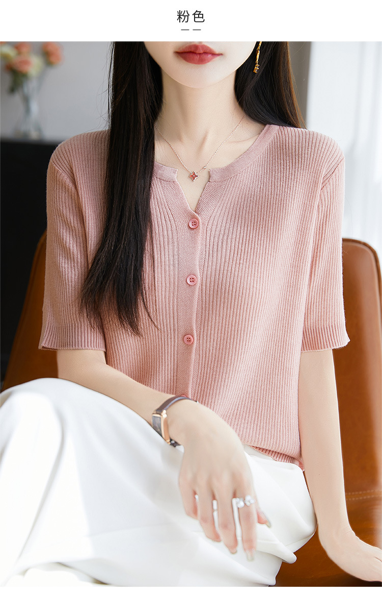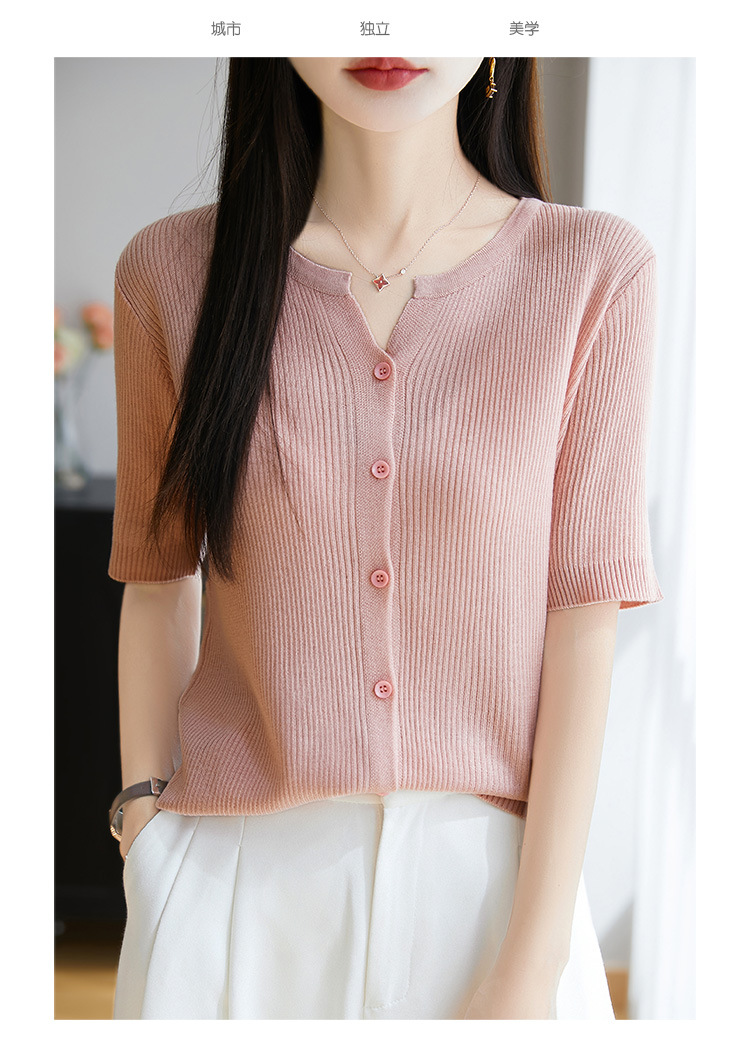 여름 얇고 시크한 작은 브이넥 워스티드 울 스웨터 여성용 솔리드 컬러 다용도 핏 싱글 브레스트 반소매스토어 가기