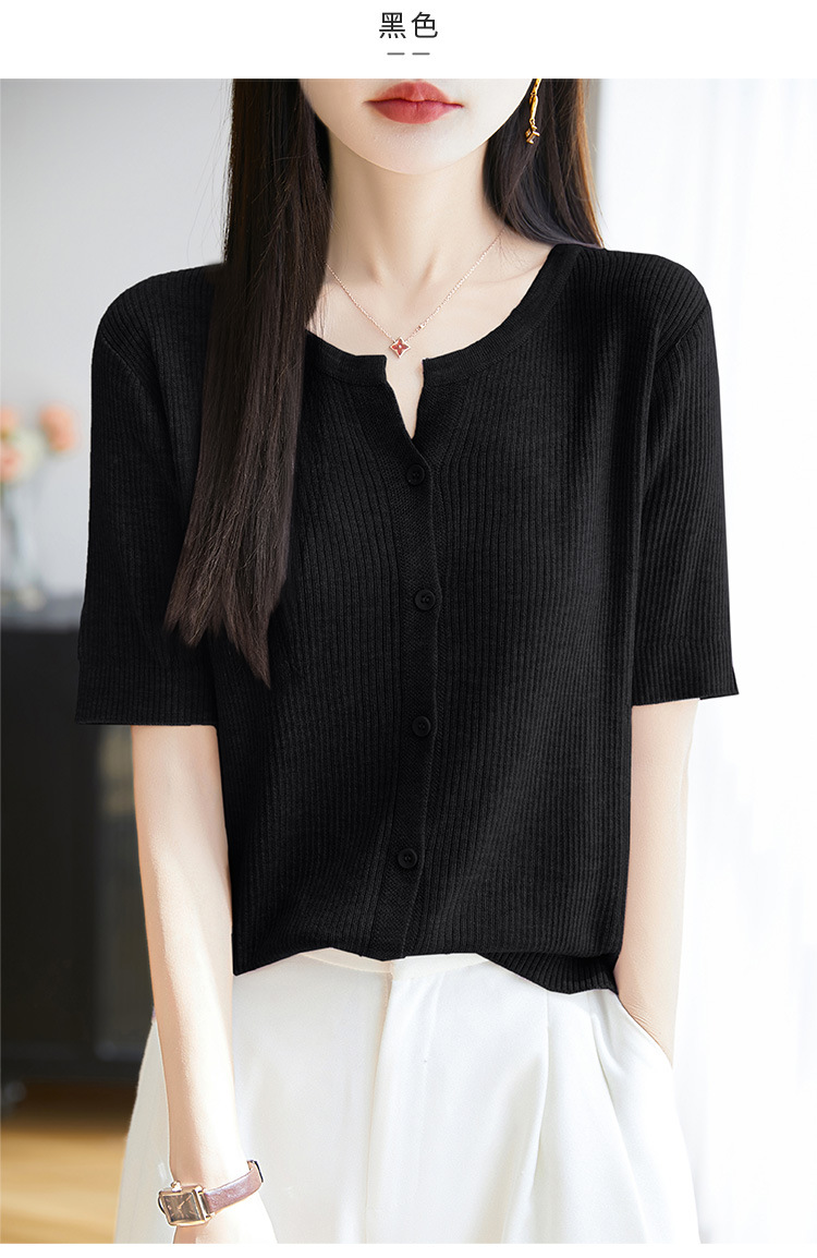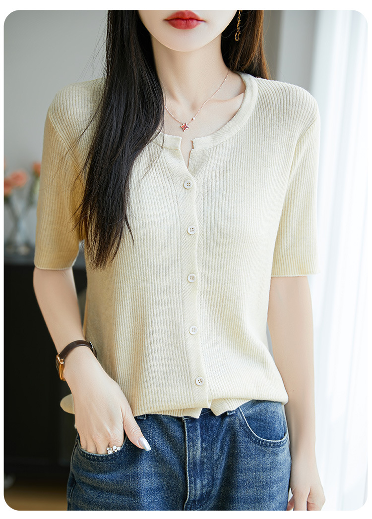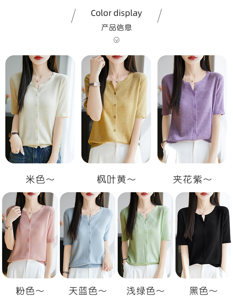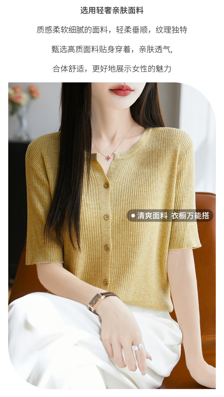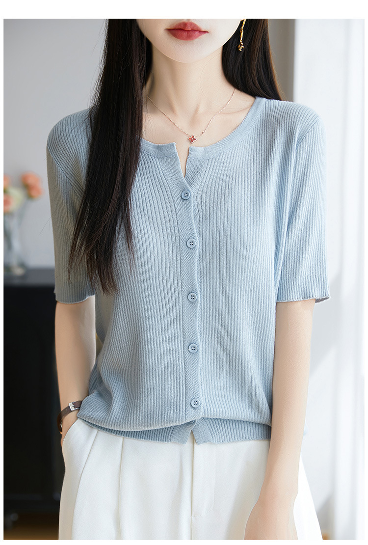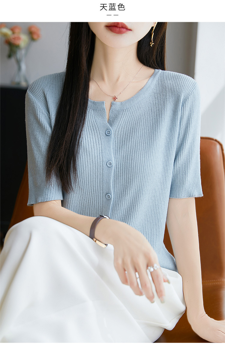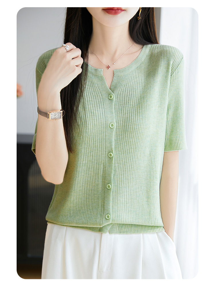여름 얇고 시크한 작은 브이넥 워스티드 울 스웨터 여성용 솔리드 컬러 다용도 핏 싱글 브레스트 반소매스토어 가기