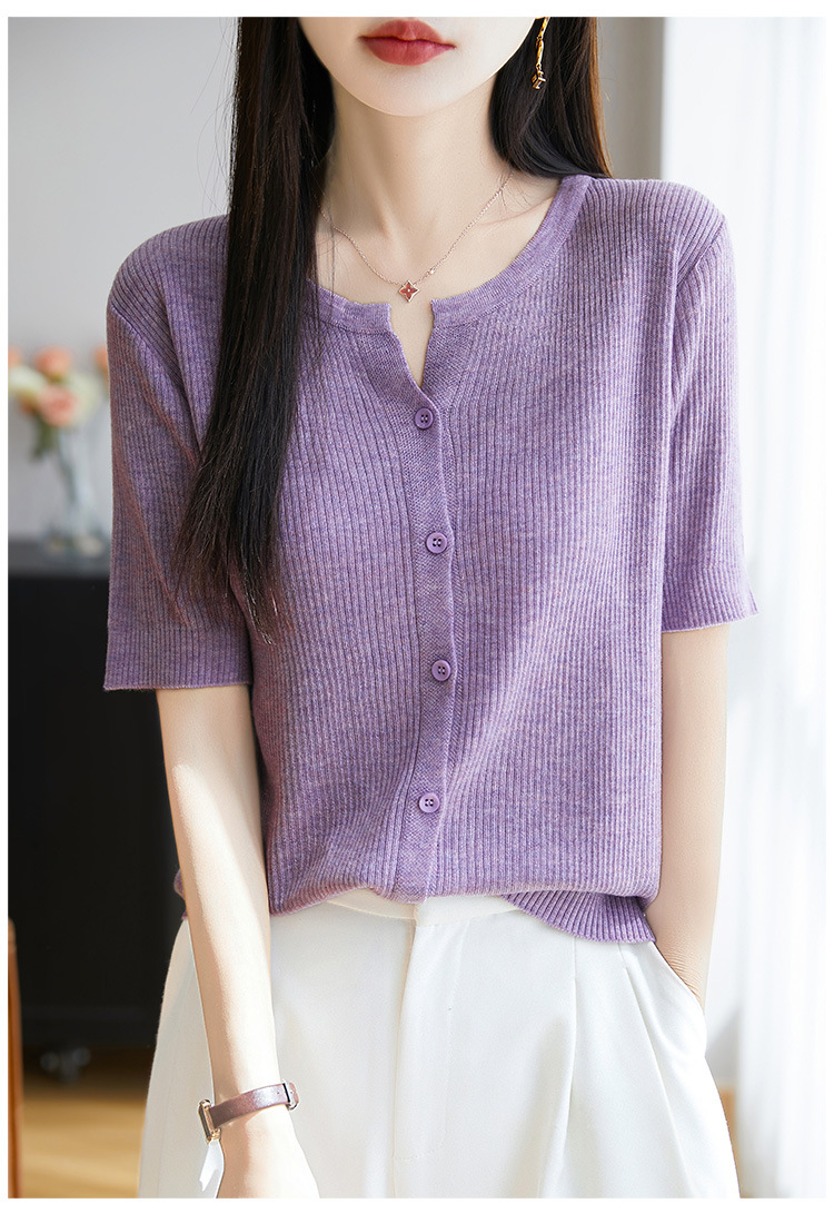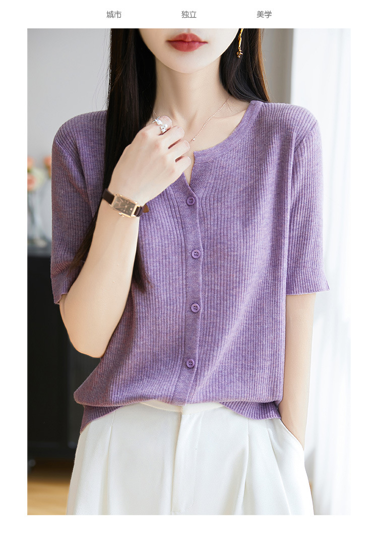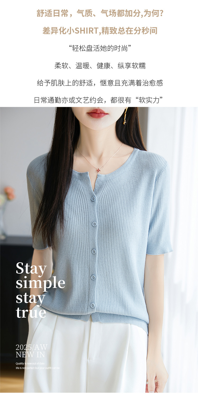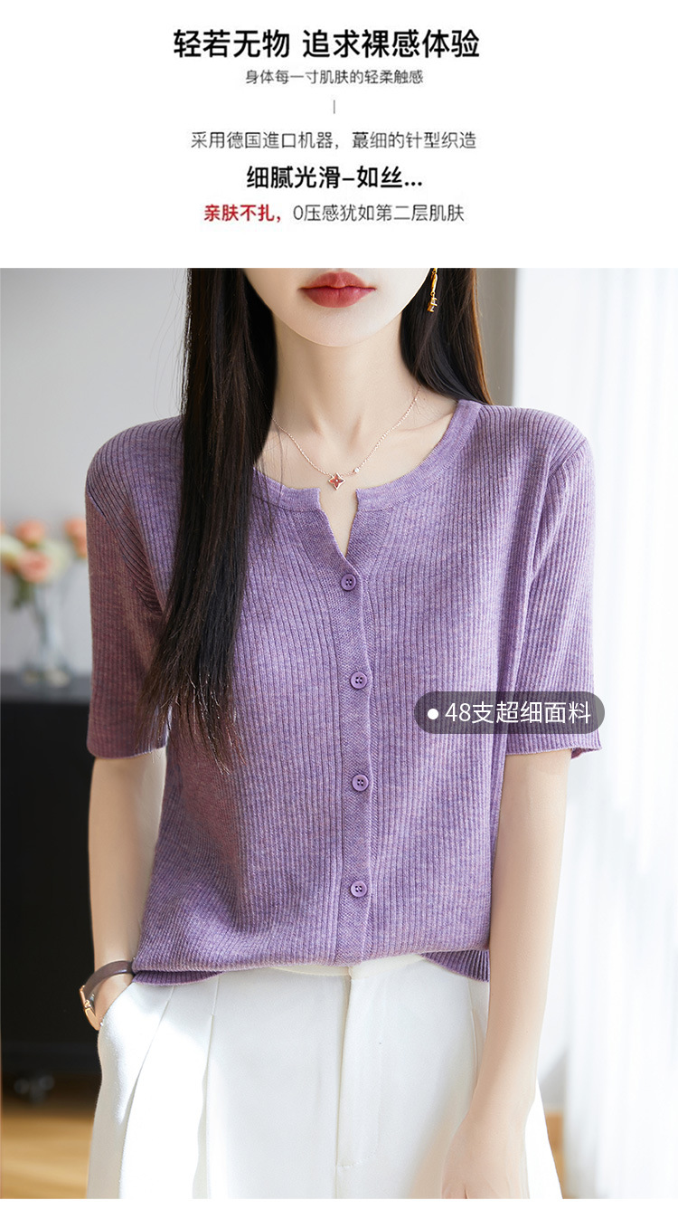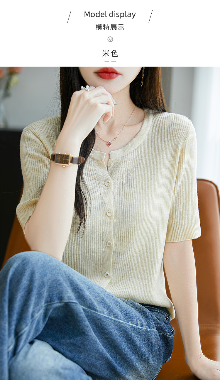 여름 얇고 시크한 작은 브이넥 워스티드 울 스웨터 여성용 솔리드 컬러 다용도 핏 싱글 브레스트 반소매스토어 가기