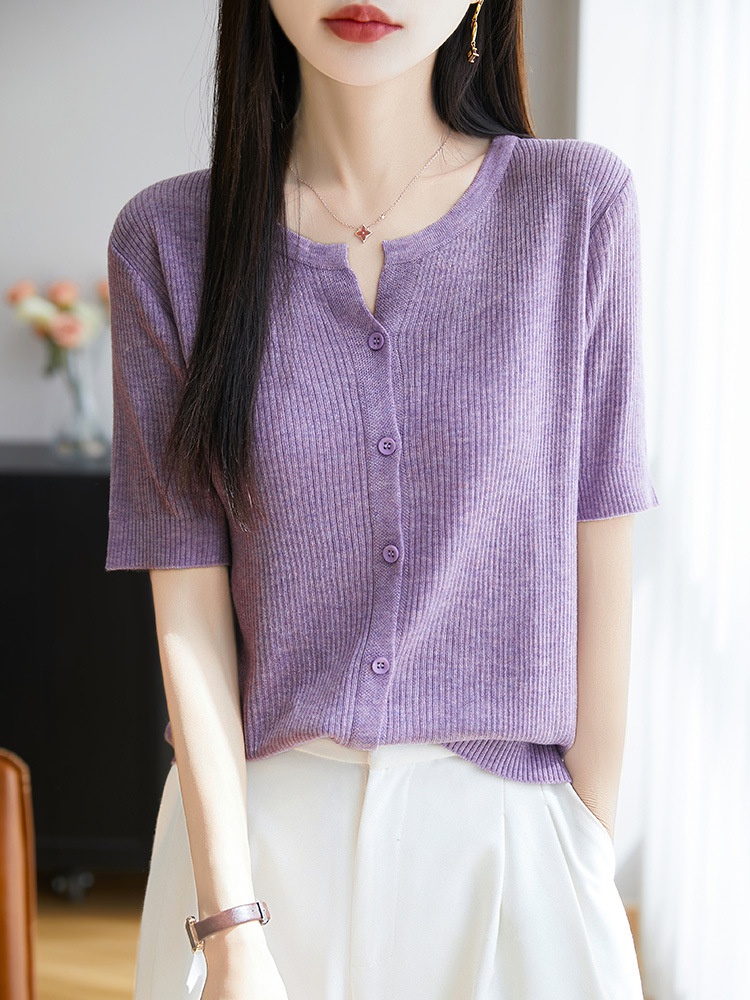 여름 얇고 시크한 작은 브이넥 워스티드 울 스웨터 여성용 솔리드 컬러 다용도 핏 싱글 브레스트 반소매