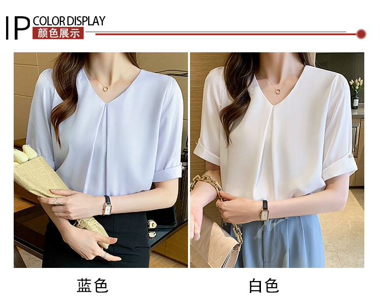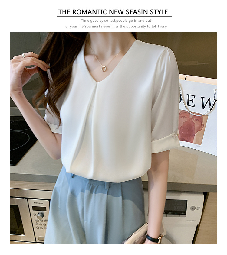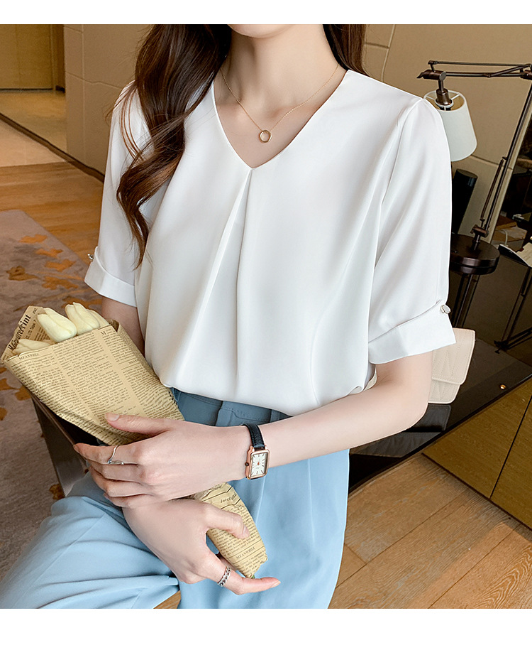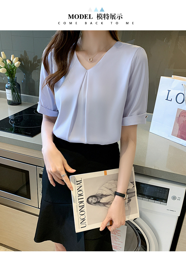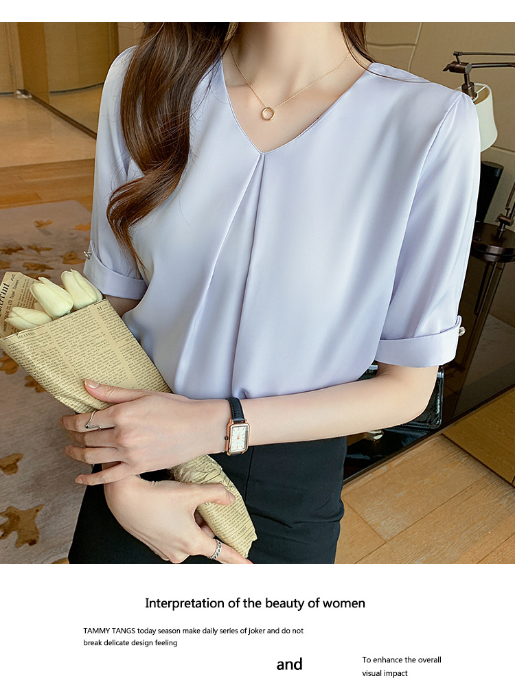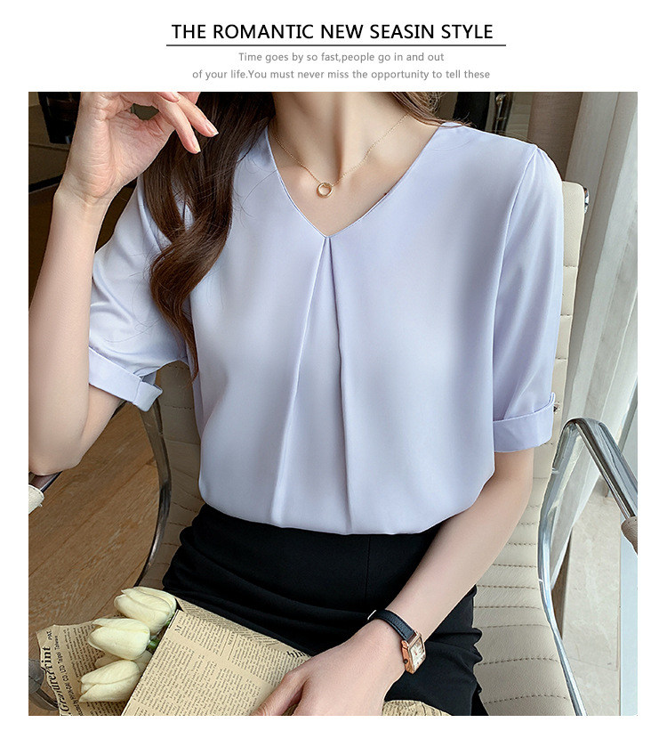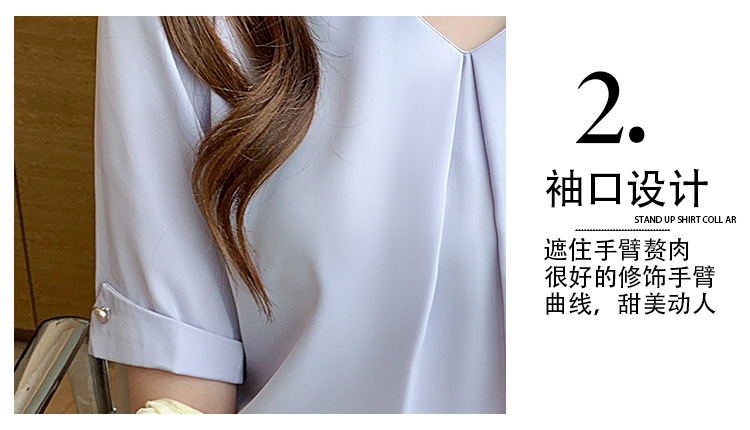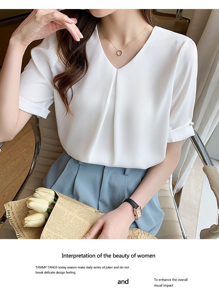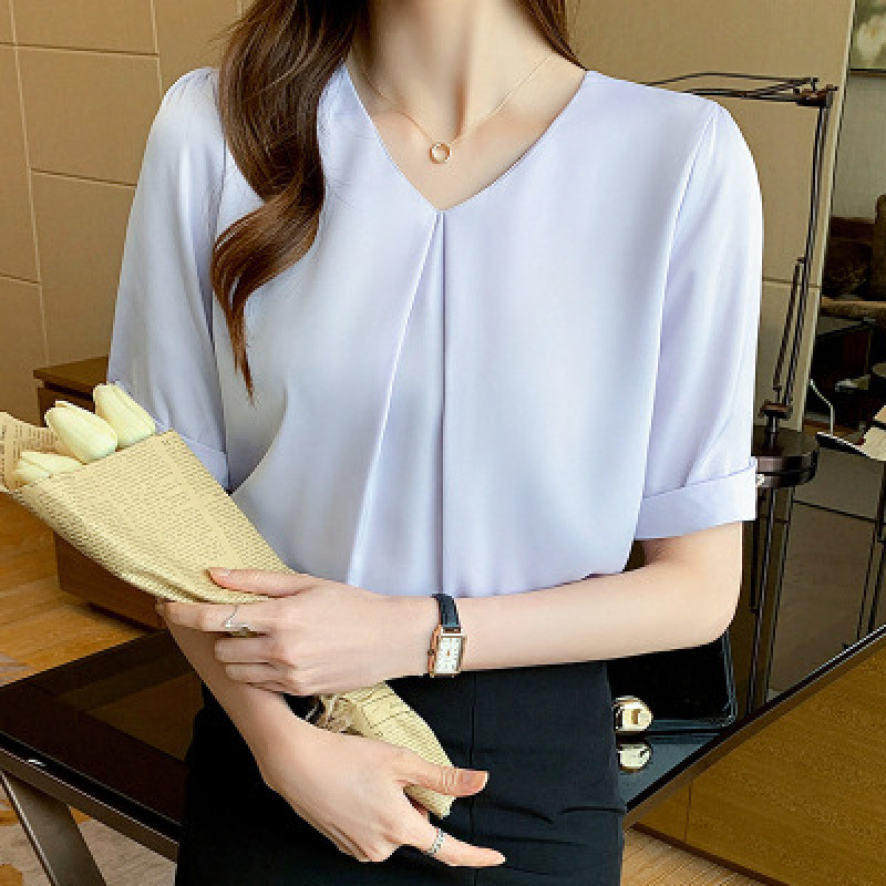 쉬폰 셔츠 반팔 여성용 2025년 신상 여름 한국 스타일 루즈핏 슬리밍 뱃살 커버 세련된 V넥 탑 트렌디스토어 가기