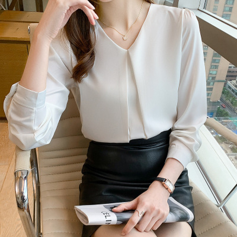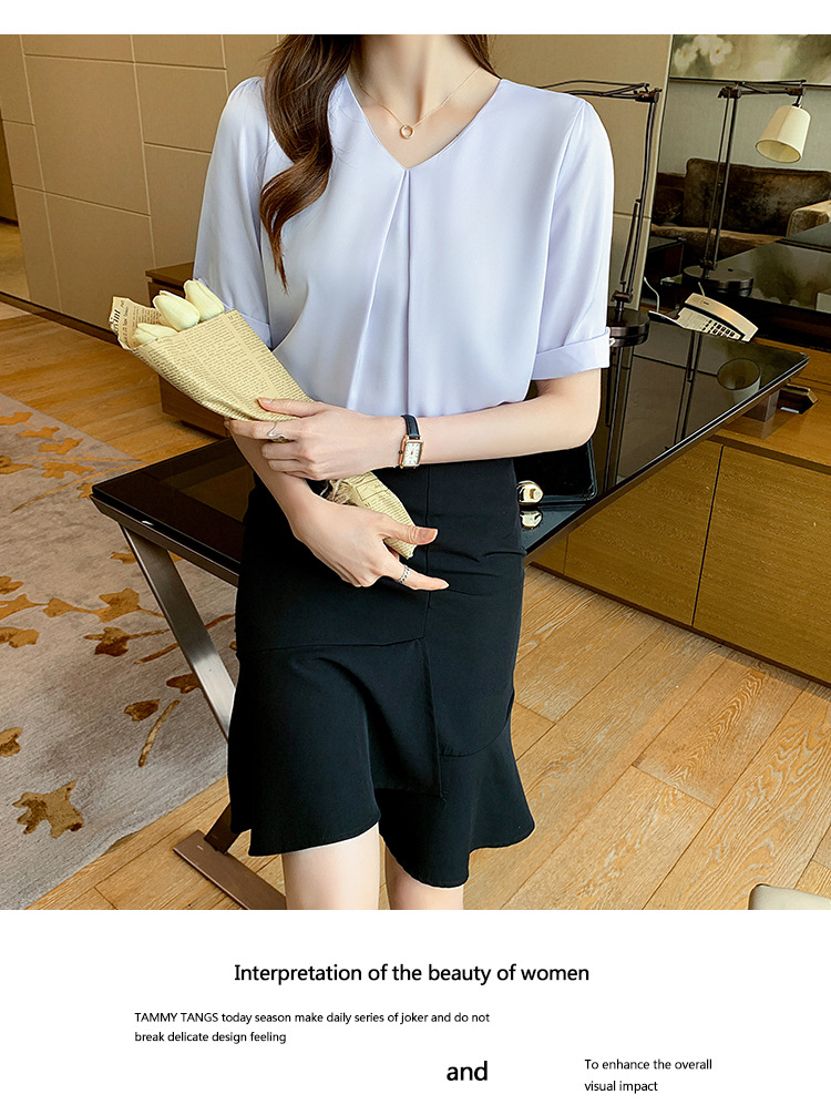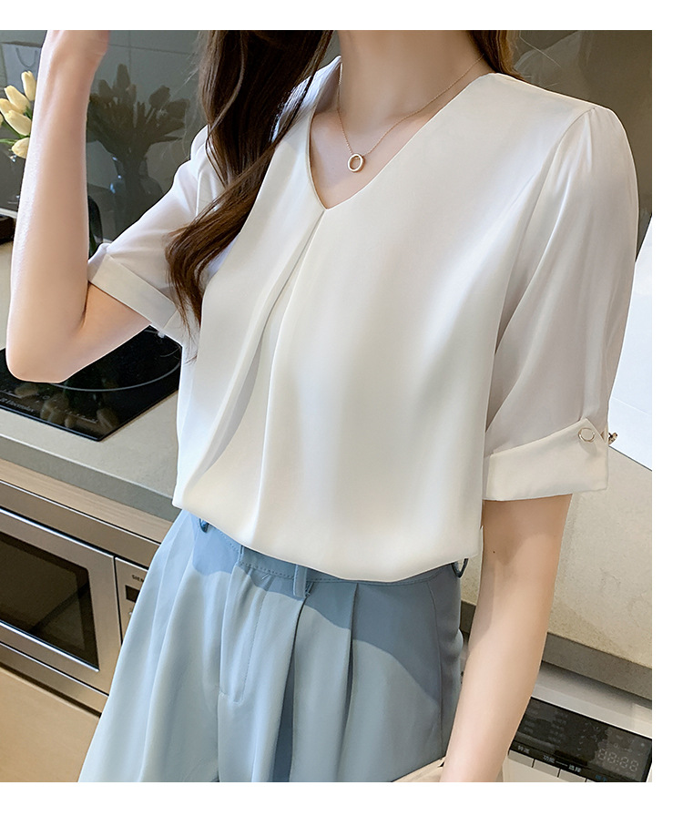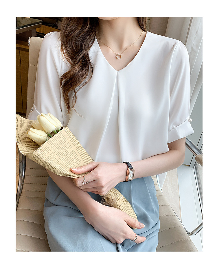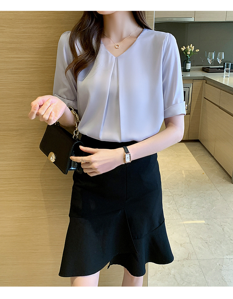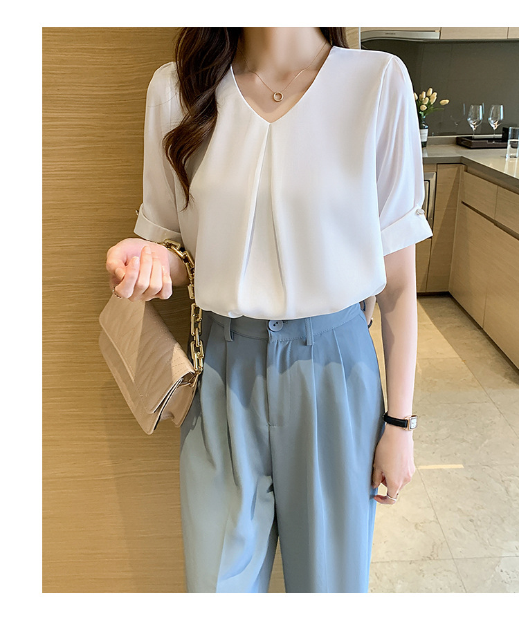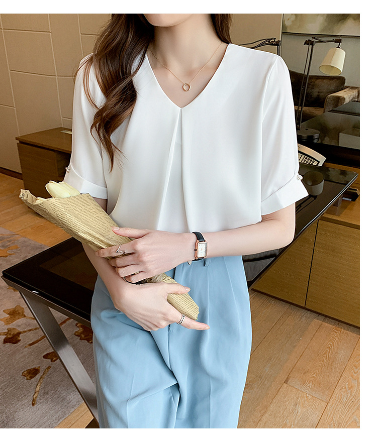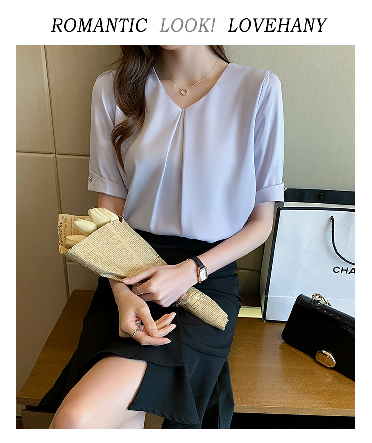 쉬폰 셔츠 반팔 여성용 2025년 신상 여름 한국 스타일 루즈핏 슬리밍 뱃살 커버 세련된 V넥 탑 트렌디스토어 가기
