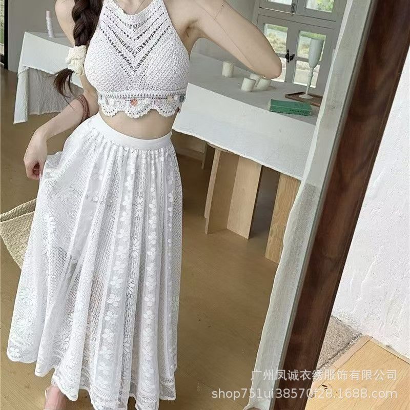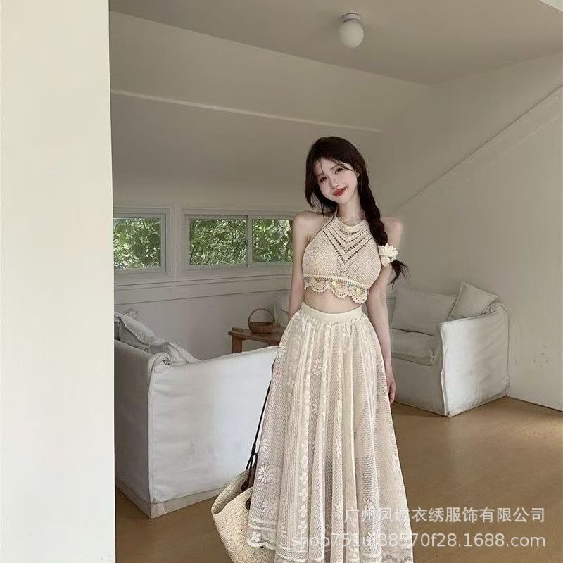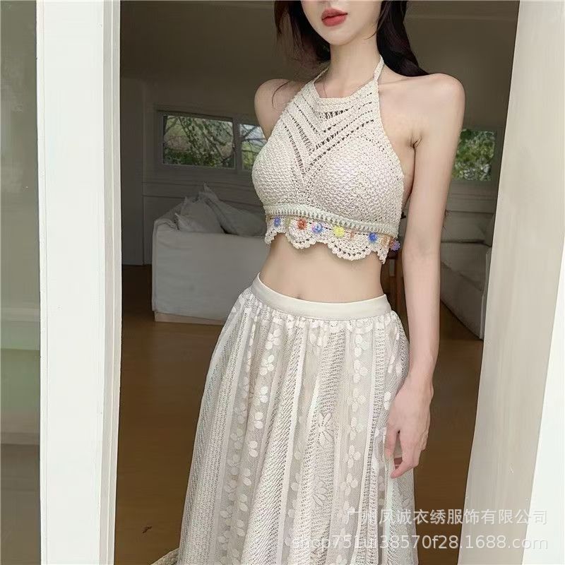 작은 뜨거운 소녀 정장 스커트 여성 여름 새로운 패션 섹시한 홀터넥 짧은 조끼 휴가 해변 스커트
