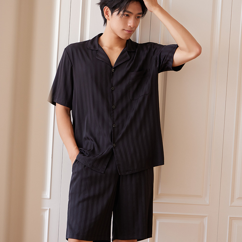커플 봄과 여름 얼음과 눈 실크 스트라이프 자카드 시원한 느슨한 하이 엔드 반팔 반바지 홈웨어 세트