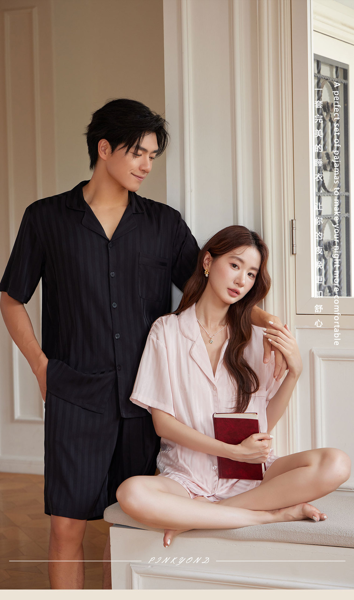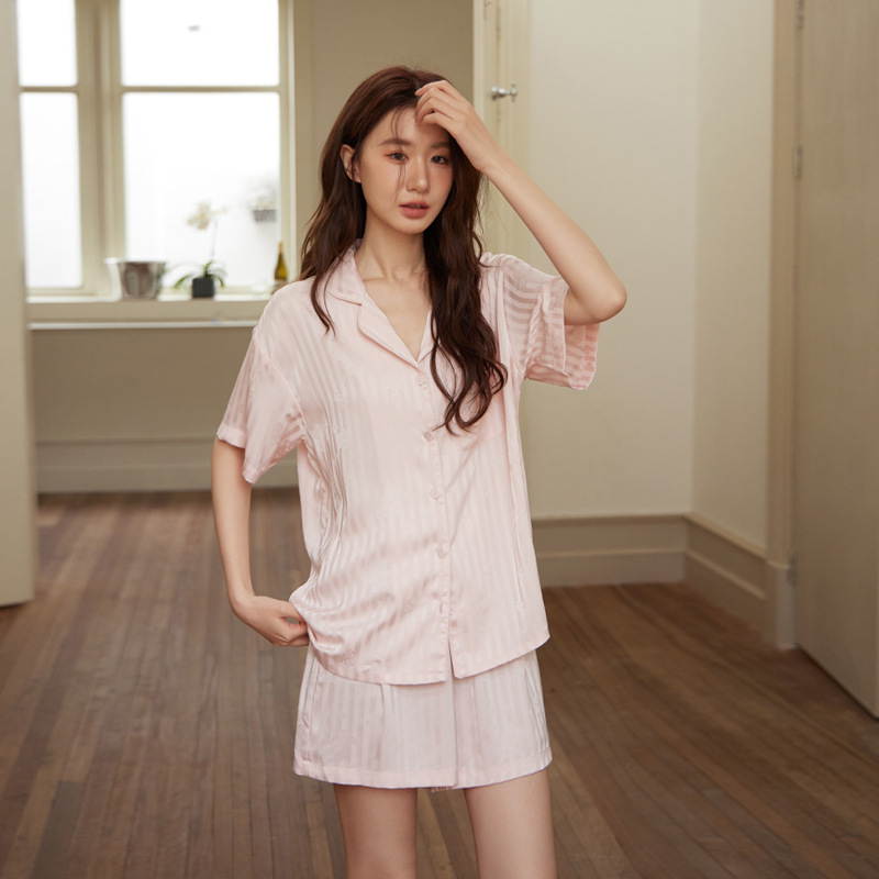 커플 봄과 여름 얼음과 눈 실크 스트라이프 자카드 시원한 느슨한 하이 엔드 반팔 반바지 홈웨어 세트스토어 가기