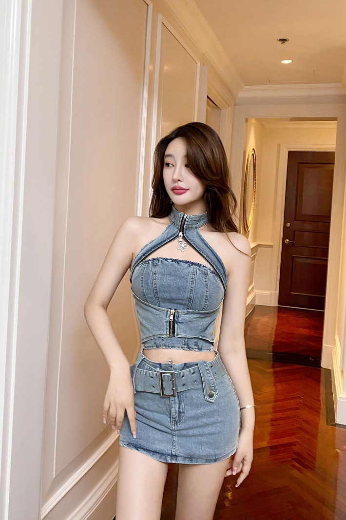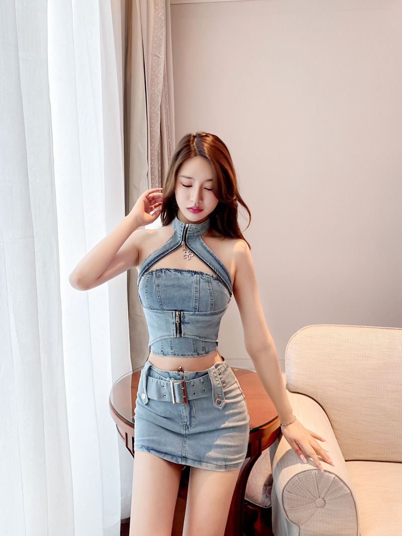 5721 국경 간 대외 무역 여성 의류 도매 동남 아시아 핫 소녀 데님 지퍼 홀터 탑 + 엉덩이 커버 짧은 스커트 정장스토어 가기