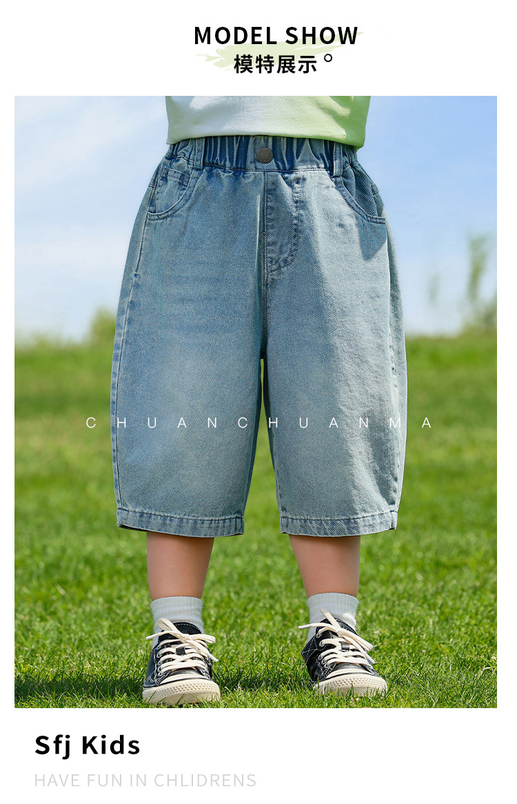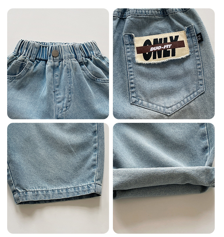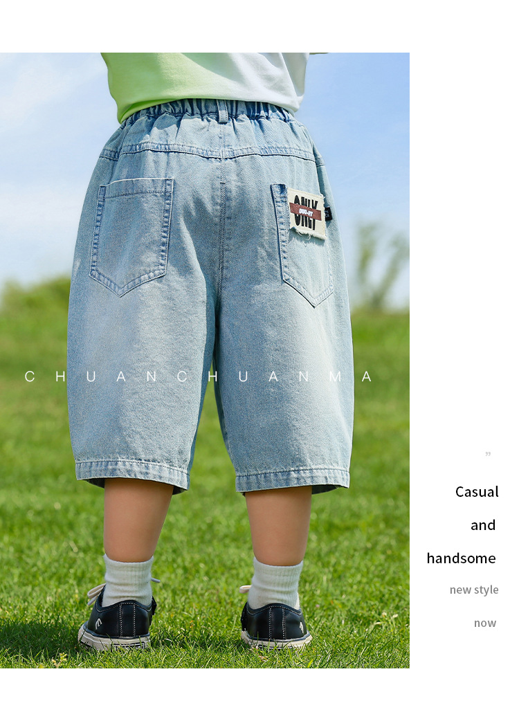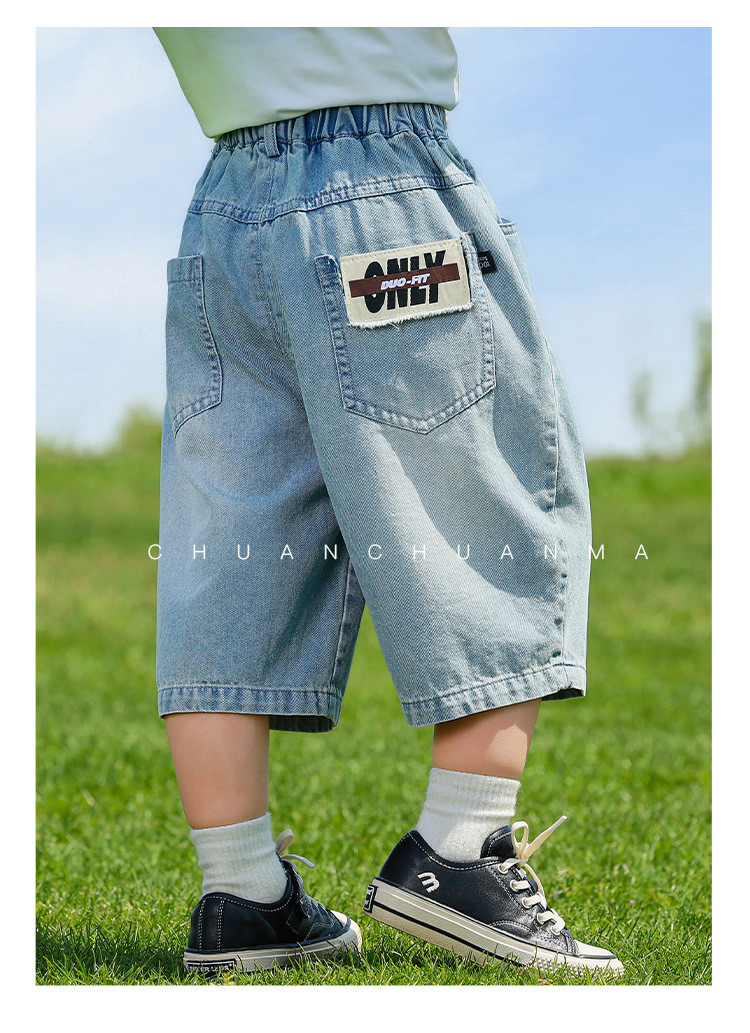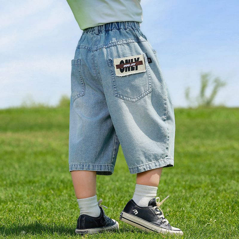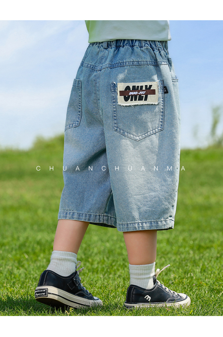 바람의 계곡 2025 새로운 여름 아동 바지 아동 한국어 버전 라벨 포켓 데님 반바지 소년 잘 생긴 크롭 바지